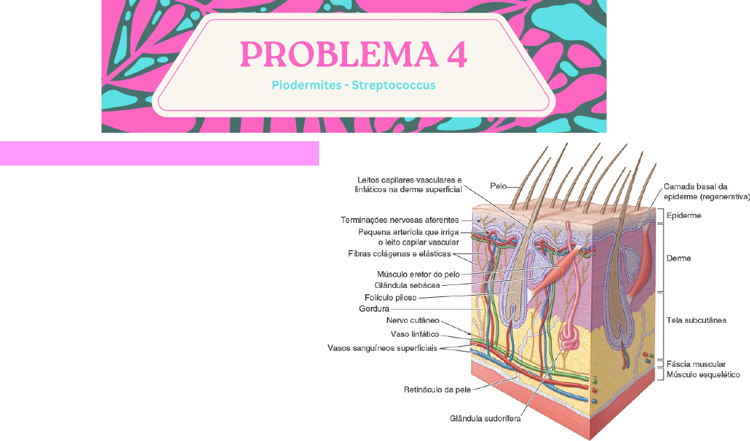 1. MORFOLOGIA DA PELE A pele é o maior órgão do corpo, e formada por: Epiderme ˃ epitélio queratinizado, que é uma camada superficial córnea e resistente, tem superfície externa protetora sobre a camada basal/profunda, regenerativa e pigmentada. ˃ Os queratinócitos são células epiteliais altamente especializadas, desenvolvidas para desempenhar uma função muito específica: a separação do organismo de seu meio externo. Representam 85% das células da epiderme ˃ Os melanócitos são as células produtoras de pigmento da epiderme. Representam aproximadamente 5% das células da epiderme ˃ As células de Langerhans são células apresentadoras de antígeno envolvidas na sinalização do sistema imune. Representam aproximadamente 2 a 5% das células da epiderme ˃ As células de Merkel são células mecanorreceptores associadas às terminações nervosas sensitivas. Representam aproximadamente 6 a 10% das células da epiderme. ˃ Não tem vasos sanguíneos nem linfáticos. Contendo 5 camadas distintas em sua subdivisão ˃ Estrato basal/estrato germinativo por ter células mitoticamente ativas, queratinócitos, medida que novos surgem eles se movem para a acamada seguinte, iniciando migração ascendente. ˃ Estrato espinhoso/camada espinhosa/camada de células espinhosas. Tem queratinócitos maiores e unidos por desmossomos, medida que as células amadurecem e migram para a superfície, elas aumentam de tamanho e tornam-se achatadas. ˃ Estrato granuloso, contém os queratinócitos com numerosos grânulos de querato-hialina. E agregam os filamentos de queratina. ˃ Estrato córneo, composto de células queratinizadas, preenchidas de filamentos de queratina e contém uma camada externa de lipídios formando a barreira hídrica da epiderme. Derme ˃ Camada densa de fibras de colágeno e elásticas, responsável por tônus cutâneo e resistência e firmeza da pele. ˃ Vascularizada e que nutre a Epiderme. composta de duas camadas: ˃ Papilar – mais superficial, relativamente fina. ˃ Reticular – Mais espessa e menos celularizada. Tela subcutânea/Hipoderme. ˃ Reservatório de gordura do corpo, espessura varia muito e depende do nutricional da pessoa. ˃ Faz parte da termorregulação - como isolamento e retendo calor Anexos da pele. ˃ Folículos pilosos e o seu produto, os pelos ˃ Glândulas sebáceas e o seu produto, o sebo ˃ Glândulas sudoríparas écrinas e o seu produto, o suor ˃ Glândulas sudoríparas apócrinas e seu produto misto que contém uma forma de suor com alta concentração de carboidratos, lipídios e proteínas. As pequenas artérias (arteríolas) da derme também participam da perda ou retenção do calor corporal. ˃ Dilatam-se para encher os leitos capilares superficiais e irradiar calor - a pele fica vermelha ˃ Contraem-se para minimizar a perda de calor na superfície (a pele fica azulada, principalmente nos lábios e nas pontas dos dedos das mãos) A pele propicia: ˃ Proteção do corpo contra os efeitos ambientais, como escoriações, perda de líquido, substâncias prejudiciais, radiação ultravioleta e microrganismos invasores. ˃ Contenção das estruturas do corpo (p. ex., tecidos e órgãos) e de substâncias vitais (principalmente líquidos extracelulares), evitando a desidratação, que pode ser grave em caso de lesões cutâneas extensas (p. ex., queimaduras). ˃ Regulação do calor mediante a evaporação do suor e/ou a dilatação ou constrição dos vasos sanguíneos superficiais. ˃ Sensibilidade (p. ex., dor) por meio de nervos superficiais e suas terminações sensitivas ˃ Síntese e armazenamento de vitamina D. 2. PIODERMITE Infecções bacterianas da pele e seus anexos. (Pyon -pus e derma- pele) – derivado do grego pyoderma. Mais comum causados por Cocos Gram+, principais Staphylococcus aureus ou Streptococcus pyogenes. Piodermites primarias ˃ Ocorrem em pele previamente saudável. Piodermites secundarias ˃ Ocorrem em lesões já preexistentes na pele, colonizadas por bactérias residentes ou transitórias oportunistas PROFUNDIDADE DA INFECÇÃO NA PELE Infecção superficial da pele: Impetigo É uma dermatose infecciosa, não formam cicatriz, e se apresenta em duas formas clínicas: 1. Não bolhoso/Crostoso – Podem ser uma mistura de Strep/Staphy. É mais comum e mais contagiosa, normalmente é o que se encontra mais Staphy resistente a meticilina. Comum em crianças e adultos. S. Aureus é responsável por 10% dos casos e o restante é Strep grupo A(B- hemolítico) 2. Bolhoso – Responsáveis são o Staphylococcus Aureus, em peles intactas. Comum mais em neonato. *Patogênese* É limitado a epiderme. Strep – Colonização previamente em lesões cutâneas, favorecidas por continuidade seja por picadas ou traumas. Após sua introdução na pele, pode ocorrer disseminação para o trato respiratório. Staphy - Inicialmente com colonização da mucosa nasal e em sequência há contaminação da pele, com surgimento de lesões cutâneas. Em geral pode ocorrer involução espontânea em 2/3 semanas. A persistência das lesões pode ocorrer por dermatose pruriginosa preexistente, como escabiose ou dermatite atópica. CLÍNICA. Não bolhosa – inicia com lesão isolada, como uma macula ou pápula eritematosa e evolui para uma vesícula. Essa mesmo se rompe e forma uma erosão, seu conteúdo seca e forma-se a crosta. O impetigo não bolhoso costuma ocorrer na face (ao redor da boca, nariz) ou nos membros. Ele pode ocorrer concomitantemente a herpes simples e à dermatite atópica. ˃ Estado geral preservado. Bolhosa – Vesícula superficial com evolução rápida para bolha flácida. ˃ Margens bem definidas e sem eritema circulante. Com rompimento, forma-se uma corta úmida amarela, com conteúdo seroso e em sequência turvo. ˃ Pode acometer a mucosa, além das mesmas que não bolhosa. DIAGNÓSTICO Histopatológico – aparecimento de clivagem no extrato granuloso e vesículas/pápulas por neutrófilos. derme superi