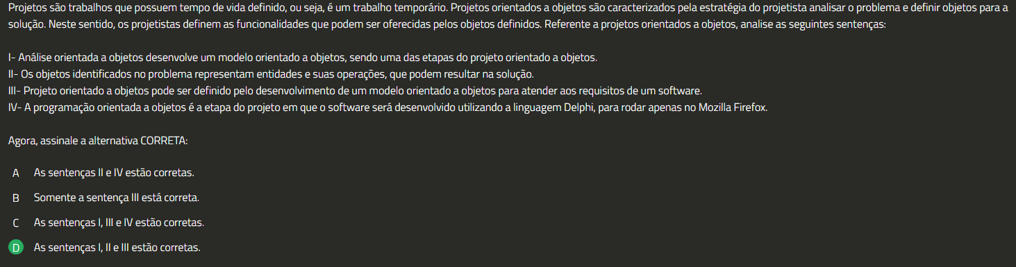 Projetos são trabalhos que possuem tempo de vida definido, ou seja, é um trabalho temporário. Projetos orientados a objetos são caracterizados pela estratégia do projetista analisar problema e definir objetos para a solução. Neste sentido, os projetistas definem as funcionalidades que podem ser oferecidas pelos objetos definidos. Referente a projetos orientados a objetos, analise as seguintes sentenças: Análise orientada a objetos desenvolve um modelo orientado a objetos, sendo uma das etapas do projeto orientado a objetos. II- Os objetos identificados no problema representam entidades e suas operações, que podem resultar na solução. III - Projeto orientado a objetos pode ser definido pelo desenvolvimento de um modelo orientado a objetos para atender aos requisitos de um software. IV- A programação orientada a objetos é a etapa do projeto em que O software será desenvolvido utilizando a linguagem Delphi, para rodar apenas no Mozilla Firefox. Agora, assinale a alternativa CORRETA: A As sentenças II e IV estão corretas. B Somente a sentença III está correta. As sentenças I, III e IV estão corretas. D As sentenças I, II e III estão corretas.