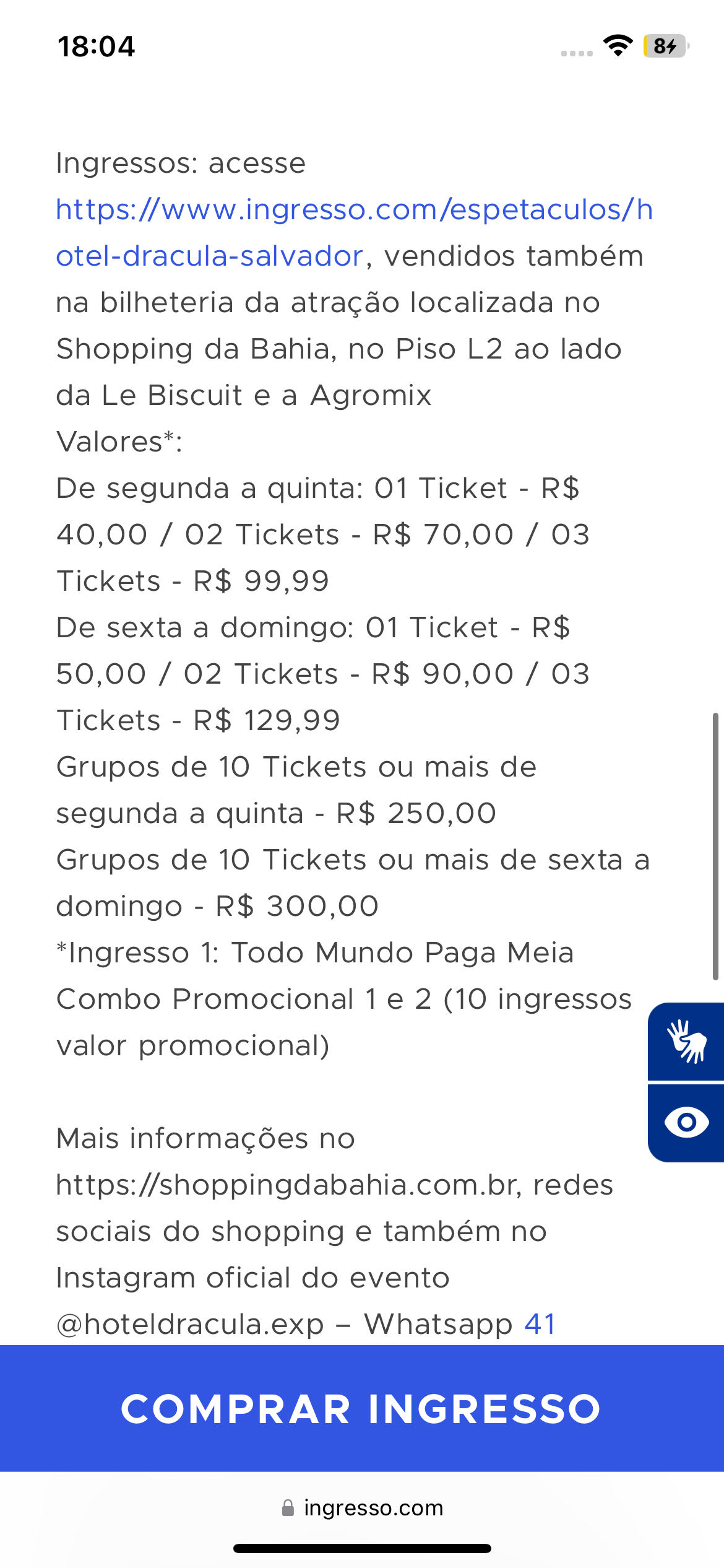 18:04 84 .... Ingressos: acesse https://www.ingresso.com/espetaculos/h otel-dracula-salvador, vendidos também na bilheteria da atração localizada no Shopping da Bahia, no Piso L2 ao lado da Le Biscuit e a Agromix Valores*: De segunda a quinta: 01 Ticket - R$ 40,00 / 02 Tickets - R$ 70,00 / 03 Tickets - R$ 99,99 De sexta a domingo: 01 Ticket - R$ 50,00 / 02 Tickets - R$ 90,00 / 03 Tickets - R$ 129,99 Grupos de 10 Tickets ou mais de segunda a quinta - R$ 250,00 Grupos de 10 Tickets ou mais de sexta a domingo - R$ 300,00 *Ingresso 1: Todo Mundo Paga Meia Combo Promocional 1 e 2 (10 ingressos valor promocional) Mais informações no https://shoppingdabahia.com.br, redes sociais do shopping e também no Instagram oficial do evento @hoteldracula.exp - Whatsapp 41 COMPRAR INGRESSO ingresso.com