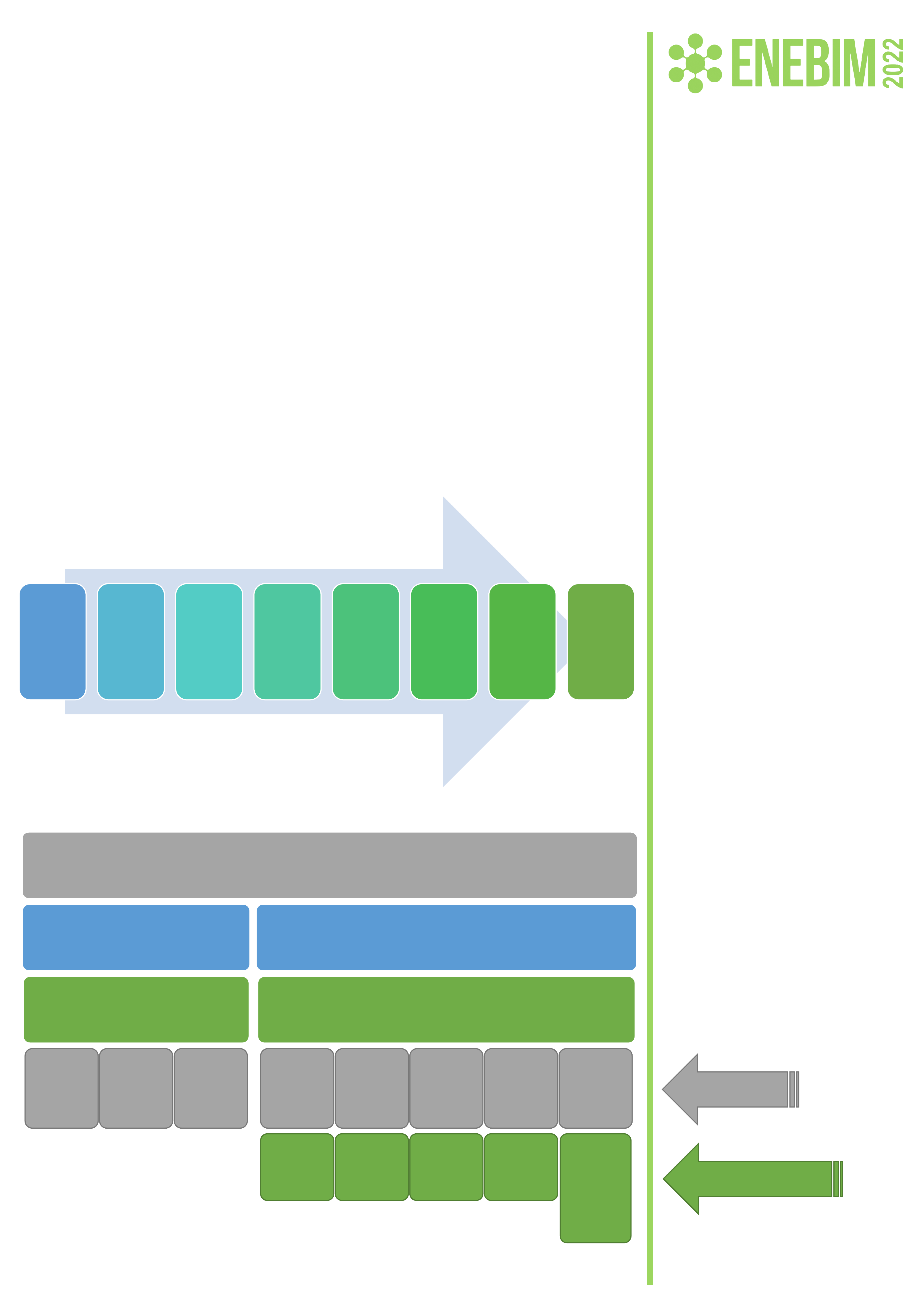 verificação da relação entre o componente curricular e BIM. Avaliação dos conteúdos da modelagem que podem ser trabalhados. Análise das competência s BIM de domínio técnico ou de execução, possíveis de serem desenvolvida s. Estágios da implementaç ão BIM que podem ser trabalhados na disciplina. Potencial de integração da disciplina. Identificação das etapas do ciclo de vida da edificação que podem ser discutidas. Avaliação das disciplinas de projeto que podem ser trabalhadas no componente curricular. Verificação da possibilidade do trabalho/disc ussão de forma. Isabella Andreczevski Chaves Lia Yamamoto Barbara Talamini Villas Bôas Regina Coeli Ruschel INTRODUÇÃO DIAGNÓSTICO SOBRE A UTILIZAÇÃO DA METODOLOGIA BIM NA NOVA MATRIZ CURRICULAR DO CURSO DE ENGENHARIA CIVIL DA UFPR Os profissionais de Arquitetura, Engenharia, Construção e Operação devem ser preparados para a utilização da metodologia BIM desde sua formação acadêmica. Sendo assim, este resumo apresenta um diagnóstico de todas as disciplinas que compõem a nova matriz curricular do curso de Engenharia Civil da Universidade Federal do Paraná sobre a utilização da metodologia BIM em suas ementas disciplinares, tal estudo foi realizado pela Célula BIM da UFPR. A metodologia adotada foi a de Checcucci (2014), onde a identificação dos componentes BIM foi através da análise documental e categorial das ementas de cada disciplina de acordo com as seguintes categorias: UFPR, isabella.chaves@ufpr.br UFPR, liayamamoto@ufpr.br UFPR, barbaratvb.ufpr@gmail.com UNICAMP, regina.ruschel@gmail.com PROCESSO POLÍTICAS Modalidade: Planejamento de inserção de BIM na educação AGRADECIMENTOS Os conteúdos relacionados ao BIM podem desenvolvidos em disciplinas da matriz Aos alunos colaboradores do projeto Célula BIM da UFPR. Disciplinas Básicas Conteúdos gerais sobre BIM (modelagem, documentação, visualização, RV) Introdução à Engenharia e Inovação Expressão Gráfica Desenho Arquitetônico Essências Conteúdos aplicados do BIM Gestão de Projetos BIM 4D e 5D Saneamento Ambiental concepção, projeto e dimensionamen to, possuindo interface aos conceitos BIM Metodologia do Trabalho Científico Todas competências BIM Infraestrutura Viária, Geoprocessam ento aplicado à Engenharia de Transportes e Laboratório de Transportes projeto geométrico, drenagem e de terraplenagem em ambiente BIM Projetos de Edifícios ideia de multidisciplinari dade, trabalhando os estágios de modelagem, de colaboração e integração do BIM disciplina Conteúdos BIM