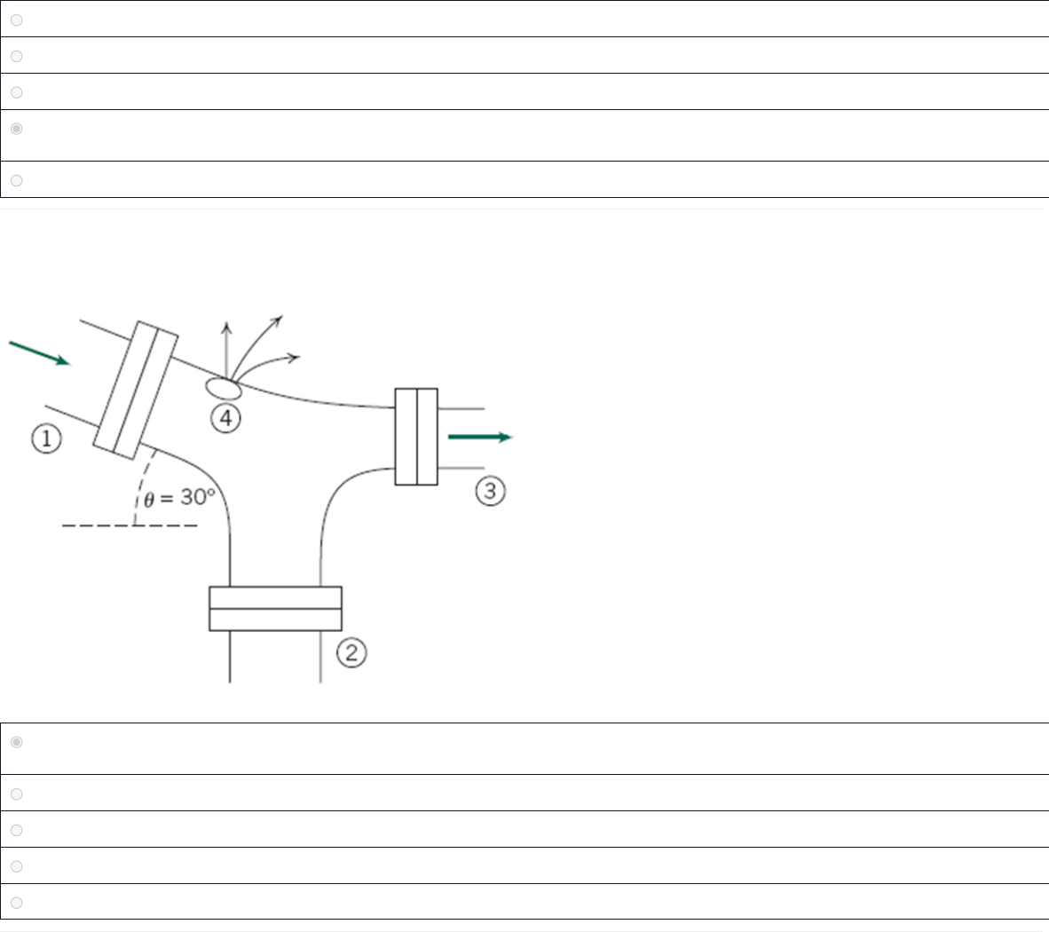 Ler em voz alta Ler em voz alta Ler em voz alta Questão 1/10 - Mecânica dos Fluidos A equação de Bernoulli relaciona três importantes formas de energia do escoamento, a saber: Assunto visto na Aula 4 tema 3 A Pressão, temperatura e volume B Temperatura, fusão e cinética C Pressão, cinética e nuclear D Pressão, cinética e potencial Você assinalou essa alternativa (D) E Vazão, temperatura e potencial Questão 2/10 - Mecânica dos Fluidos Considere o escoamento mostrado na Figura. A água entra pela seção 1 e sai pelas seções 3 e 4. As áreas das seções são: A = 0,3 m², A = 0,5 m² e A = 0,2 m². O fluido vaza para fora do tubo no orifício de seção 4 com uma vazão volumétrica estimada em Q = 0,3 m³/s. As velocidades médias nas seções 1 e 3 são v = 4 m/s e v = 10 m/s, respectivamente. Determine a velocidade do escoamento na seção 2. Assunto visto na Aula 4 tema 1 A v = 2,2 m/s Você assinalou essa alternativa (A) B v = 2,8 m/s C v = 3,2 m/s D v = 3,9 m/s E v = 4,5 m/s Questão 3/10 - Mecânica dos Fluidos O ar escoa pelo duto mostrado na Figura de modo que, em A, ele possui uma temperatura de 35°C e uma pressão absoluta de 350 kPa, enquanto, devido ao resfriamento, em B ele tem uma temperatura de 12°C e uma pressão absoluta de 335 kPa. Se a velocidade média do ar em A é de 3 m/s, calcule a força de cisalhamento resultante que atua ao longo das paredes do duto entre esses dois locais. 1 2 3 4 1 3 2 2 2 2 2 javascript:void(0) javascript:void(0) javascript:void(0) Ler em voz alta Assunto visto na Aula 6 tema 1 A F = 45,2 N B F = 127,8 N C F = 247,3 N D F = 339,9 N E F = 450,0 N Você assinalou essa alternativa (E) Questão 4/10 - Mecânica dos Fluidos A turbina de vento tem um diâmetro de rotor de 40 m e uma eficiência de 40% para um vento de 15 m/s. Se a densidade do ar é , determine a diferença entre a pressão imediatamente na frente e logo atrás das pás. Assunto visto na Aula 6 tema 4 A P = 54,3 Pa B P = 63,8 Pa Você assinalou essa alternativa (B) C P = 71,2 Pa D P = 75,9 Pa E P = 84,6 Pa ρ = 1, 23 kg/m³ javascript:void(0) Ler em voz alta Questão 5/10 - Mecânica dos Fluidos 31-) Considere a válvula globo em B aberta do sistema de tubos de ferro fundido mostrado na Figura. O diâmetro dos tubos é de 50 mm e a velocidade média do fluido é de 3 m/s. Calcule a pressão no tubo em A. Considere e . Assunto visto na Aula 4 tema 5 Você não pontuou essa questão ρágua = 998 kg/m³ νágua = 0, 8.10−6 m²/s javascript:void(0) Ler em voz alta Ler em voz alta Ler em voz alta A P = 20,8 kPa B P = 26,5 kPa C P = 31,4 kPa D P = 35,9 kPa Você assinalou essa alternativa (D) E P = 39,7 kPa Questão 6/10 - Mecânica dos Fluidos O efeito Venturi é um tubo convergente/divergente, como é mostrado na figura. Determinar a velocidade na seção mínima (garganta) de área 5cm², se na seção de entrada de áreaa 20 cm² a velocidade é 2m/s. O fluido é incompressível. Assunto visto na Aula 4 tema 1 A v = 8 m/s Você assinalou essa alternativa (A) B v = 12 m/s C v = 15 m/s D v = 5 m/s E v = 19 m/s Questão 7/10 - Mecânica dos Fluidos O tubo de Pitot é um instrumento comumente usado em escoamentos para: Assunto visto na Aula 5 tema 2 A Alterar a gravidade B Medir temperatura C Aferir pressão D Medir velocidade Você assinalou essa alternativa (D) E Medir a rotação Questão 8/10 - Mecânica dos Fluidos O rotor da bomba de escoamento radial mostrado na Figura tem raio de entrada médio de 50 mm e um raio de saída de 150 mm, e ângulos de pá e , calcule a vazão através da bomba quando o rotor gira numa velocidade angular de 250 rev/min. Assunto visto na Aula 6 tema 5 A A A A A β1 = 20° β2 = 12° javascript:void(0) javascript:void(0) javascript:void(0) Ler em voz alta Ler em voz alta A Q = 4,49 L/s Você assinalou essa alternativa (A) B Q = 5,63 L/s C Q = 7,18 L/s D Q = 8,62 L/s E Q = 8,97 L/s Questão 9/10 - Mecânica dos Fluidos A caminhonete mostrada na Figura está se movendo da esquerda para direita a 12 m/s contra um jato d’água com 25 mm de diâmetro, que possui uma vazão de 10 L/s. Calcule a força dinâmica que o jato exerce sobre a caminhonete se ele for desviado pelo para-brisa, conforme mostra a Figura. Assunto visto na Aula 6 tema 2 A F = 97,5 N B F = 110,6 N C F = 247,3 N D F = 351,8 N Você assinalou essa alternativa (D) E F = 408,2 N Questão 10/10 - Mecânica dos Fluidos O ventilador na figura é usado para forçar o ar, a uma temperatura de 80°F, a passar pelo duto metálico de chapa galvanizada com diâmetro de 0,667 pol. Determine a potência de saída necessária do ventilador se o comprimento do tubo é 200 pés e a vazão tiver de ser 3,33 pés³/s. Considere e . Onde 1 pé corresponde a 12 pol. R R R R R ε/D = 0, 0006 pés g = 32, 19 pés/s javascript:void(0) javascript:void(0) A W = 2,22 lb.pés/s B W = 2,83 lb.pés/s Você assinalou essa alternativa (B) C W = 3,48 lb.pés/s D W = 4,92 lb.pés/s E W = 5,16 lb.pés/s