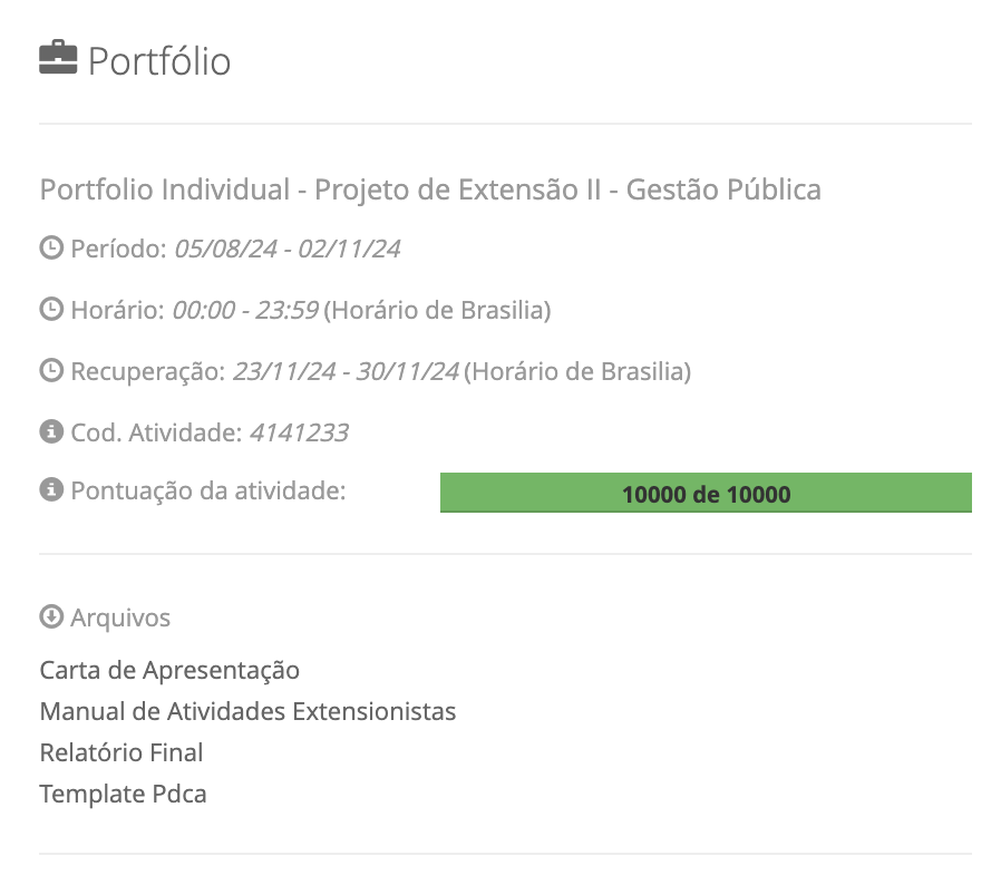 Portfólio Portfolio Individual - Projeto de Extensão II - Gestão Pública Período: 05/08/24 - 02/11/24 Horário: 00:00 - 23:59 (Horário de Brasilia) Recuperação: 23/11/24 - 30/11/24 (Horário de Brasilia) i Cod. Atividade: 4141233 i Pontuação da atividade: 10000 de 10000 Arquivos Carta de Apresentação Manual de Atividades Extensionistas Relatório Final Template Pdca