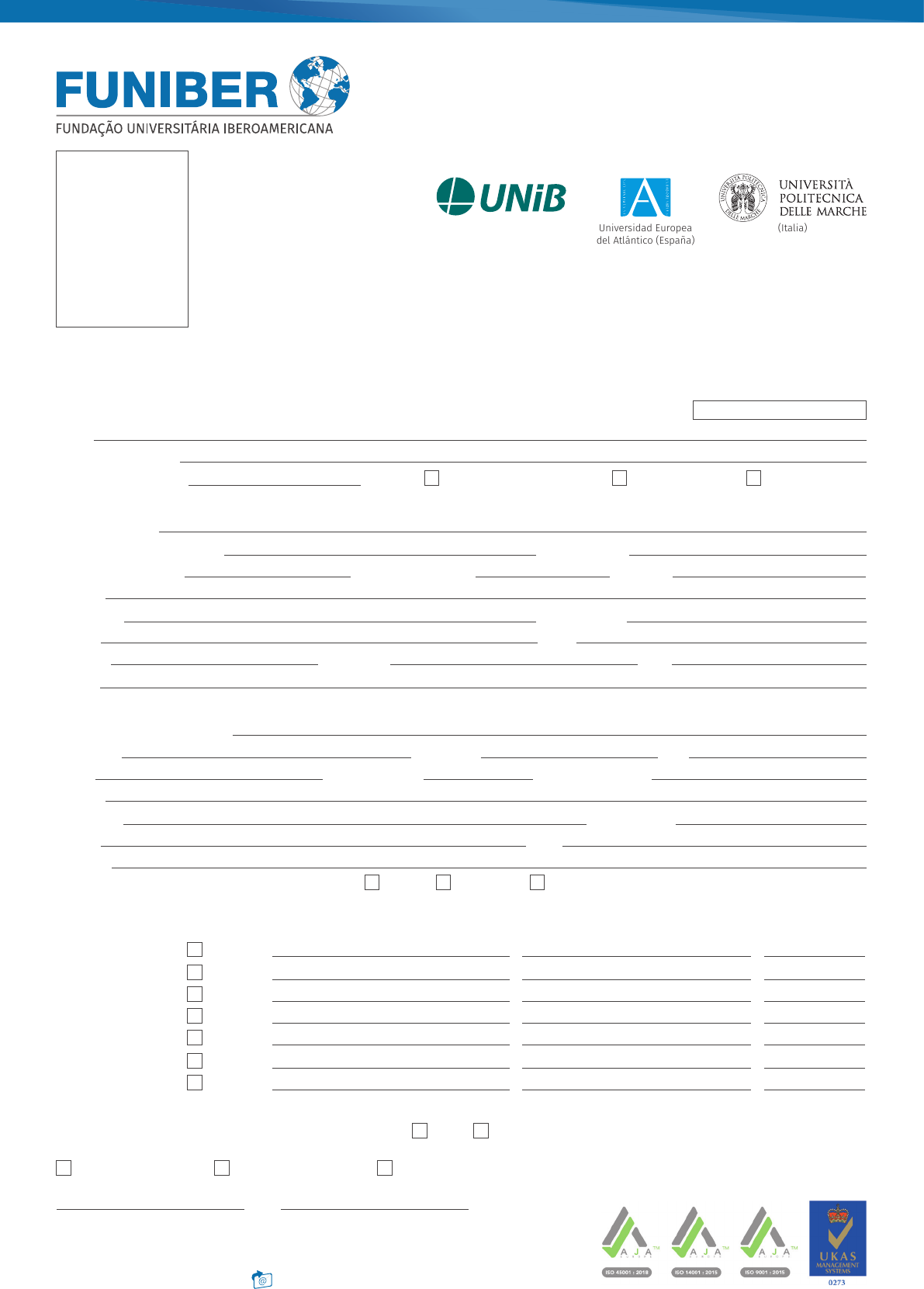 FORMULÁRIO DE INSCRIÇÃO FOTO Por favor preencher com letras maiúsculas PROGRAMA PRETENDIDO Matrícula Nº Curso: Como nos conheceu? Área de Conhecimento: Nível: Formação Especializante Pós-graduação Master INFORMAÇÃO PESSOAL Nome e Apelidos: Data e Lugar de Nascimiento: Nacionalidade: Bilhete de Identidade: Contribuinte / NUIT: Profissão: Morada: Localidade: Código Postal: Região: País: Telefone: Telemóvel: Fax: E-mail: INFORMAÇÃO PROFISSIONAL Nome da Instituição/Empresa: Actividade: Telemóvel: Fax: Cargo: Tempo no cargo: Área de Actividade: Morada: Localidade: Código Postal: Região: País: Web site: Quero receber o Material Didáctico no endereço de: casa trabalho outros INFORMAÇÃO ACADÉMICA Designação Universidade/Instituição Ano Conclusão Doutoramento Master Pós-graduação Licenciatura Bacharelato Técnico Secundário EXPERIÊNCIA DE ESTUDOS ON-LINE Já cursou um programa de estudos na modalidade on-line? Sim Não. Se sua resposta é "sim", detalhe o tipo de estudo realizado (é possível escolher mais de uma opção): Formação acadêmica Formação profissional Formação em segunda língua Assinatura Data PROGRAMA INTERUNIVERSITÁRIO IBERO-AMERICANO FUNIBER AFROCONTINENTAL ∙ Rua Ndunduma nº 83/87 - Bairro Miramar, Luanda. Tel. 244 - 924 84 33 44 / 994 84 33 44 angola@funiber.org www.funiber.co.ao IMPORTANTE: Se dispõe do programa Adobe Acrobat Professional, poderá descarregar este documento e guardá-lo. Se dispõe unicamente do Programa Acrobat Reader, deverá descarregar, imprimir, digitalizar e enviá-lo por mail para a Sede correspondente. Universidad Europea del Atlántico (España) (Italia)Universidad Internacional Iberoamericana (Puerto Rico) PROCESSO DE ADMISSÃO APRESENTAR OS SEGUINTES DOCUMENTOS • Solicitação de Inscrição assinada na frente e no verso da folha. A original deve ser enviada à FUNIBER por correio postal junto com a ordem de pagamento. • 1 fotografia em preto e branco, de tamanho 3x4. • 1 fotocópia simples do Documento de Identidade ou do passaporte. • Copia original do título autenticado, para optar ao Master. Se o título universitario não for espanhol, deverá apresentá-lo autenticado e com a respectiva tradução juramentada em caso de que não esteja nos seguintes idiomas: espanhol, português, francês, inglês ou italiano. • Copia simples do histórico de notas dos estudos universitarios. * Em função da Universidade em que se inscreva o aluno, será necessário apresentar documentação adicional sobre a qual será informado no momento de formalizar a inscrição. FORMAS DE PAGAMENTO O pagamento da matrícula e o financiamento do programa poderão ser efetuados através de débito automático em cartão de crédito (Visa, Mastercard) deverá ser autorizado na ordem de pagamento. Ou em conta bancária, sendo que ambos deverão ser autorizados na ordem de pagamento. REGULAMENTO DE INSCRIÇÃO 1. Prazo de Inscrição: o número de inscrições é limitado. Reserve sua inscrição enviando a documentação em papel por correio postal ou escaneada em formado JPG, PDF ou GIF por e-mail. Lembre-se de enviar a documentação devidamente assinada. Qualquer dúvida, entre em contato com o Departamento de Admissões. 2. Se a pessoa interessada, uma vez reservada a vaga e sem ter efetuado o pagamento, não puder iniciar o curso, deverá avisar a FUNIBER via telefone, para que seja possível oferecer a vaga para outra pessoa. 3. Uma vez paga a matrícula, caso não possa realizar o curso, o candidato deverá comunicar a desistência por escrito à FUNIBER (info.angola@funiber.org) com, no mínimo, dez dias de antecedência à data de início. Em nenhum caso será devolvido o investimento de Pré-inscrição, Registro e Matrícula se a notificação de desistência da matrícula não se fez dentro do prazo estabelecido. Uma vez iniciado o curso, se o aluno já tiver acessado o Campus Virtual, não será efetuada qualquer devolução. 4. A FUNIBER se reserva ao direito de cancelar os grupos que não alcancem o número mínimo de alunos estabelecido. Assinatura Data PROGRAMA INTERUNIVERSITÁRIO IBERO-AMERICANO FUNIBER AFROCONTINENTAL ∙ Rua Ndunduma nº 83/87 - Bairro Miramar, Luanda. Tel. 244 - 924 84 33 44 / 994 84 33 44 angola@funiber.org www.funiber.co.ao Universidad Europea del Atlántico (España) (Italia)Universidad Internacional Iberoamericana (Puerto Rico) SOLICITAÇÃO DE BOLSA Por favor preencher com letras maiúsculas CURSO (para o qual solicita Bolsa de Estudo) Nome do Programa: Como nos conheceu? INFORMAÇÃO PESSOAL Nome e Apelidos: Data de Nascimento: Nacionalidade: Bilhete de Identidade: Contribuinte / NUIT: Profissão: Morada: Localidade: Código Postal: Região: País: Telefone: Telemóvel: Fax: E-mail: SITUAÇÃO ECONÓMICA FAMILIAR Depende dos pais: Sim Não Rendimento familiar mensal: Casa: Própria Arrendada Vive com os pais Profissão do Chefe de Família: A família trabalha por Conta Própria: Sim Não Actividade: Possui veículo: Sim Não Poupanças Outros (especifique) Nome do cônjuge: Profissão do Cônjuge: Actividade: Nº de filhos: INFORMAÇÃO ACADÉMICA Designação Universidade/Instituição Ano Conclusão Doutoramento Master Pós-graduação Licenciatura Bacharelato Técnico Secundário OUTROS ESTUDOS E IDIOMAS PROGRAMA INTERUNIVERSITÁRIO IBERO-AMERICANO FUNIBER AFROCONTINENTAL ∙ Rua Ndunduma nº 83/87 - Bairro Miramar, Luanda. Tel. 244 - 924 84 33 44 / 994 84 33 44 angola@funiber.org www.funiber.co.ao IMPORTANTE: Se dispõe do programa Adobe AcrobatProfessional, poderá descarregar este documento e guardá-lo. Se dispõe unicamente do Programa Acrobat Reader, deverá descarregar, imprimir, digitalizar e enviá-lo por mail para a Sede correspondente. Por favor preencher com letras maiúsculas INFORMAÇÃO PROFISSIONAL Actualmente está empregado? Sim Não Nome da Instituição/Empresa: Actividade: Telefone: Fax: Cargo: Tempo no cargo: Área: Endereço: Cidade: Cód