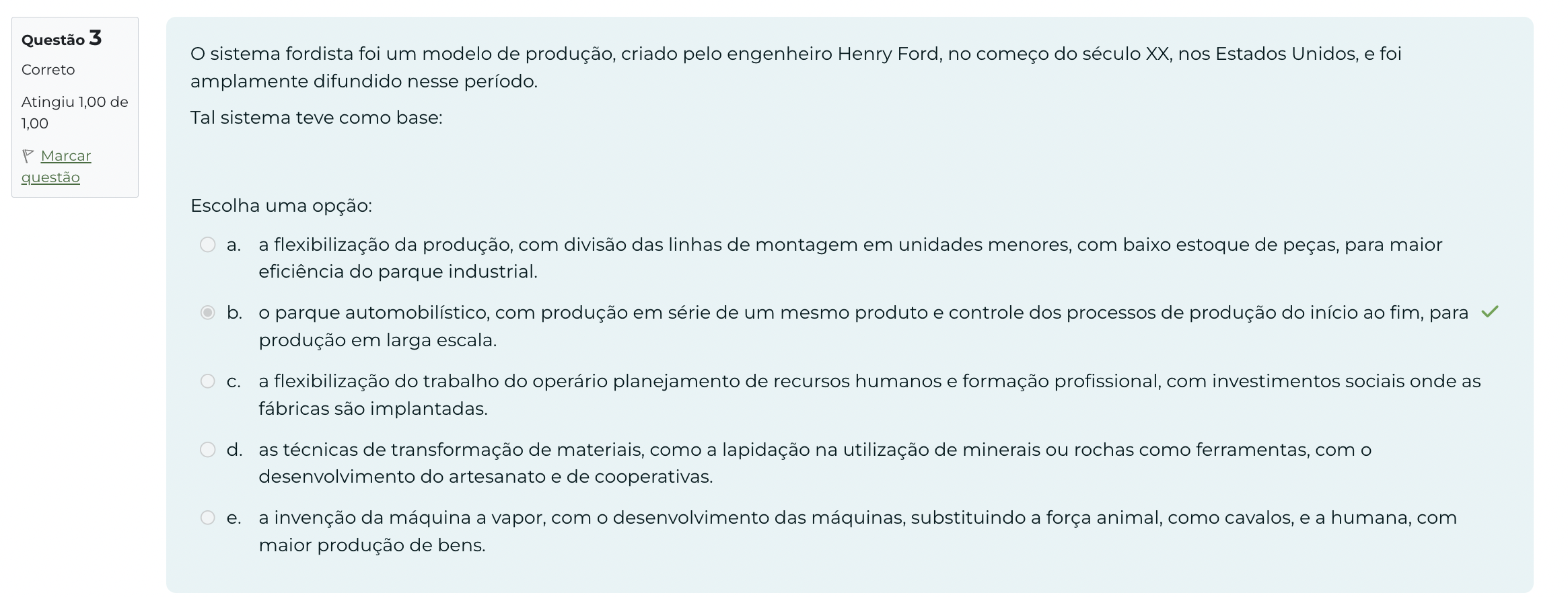 Questão 3 sistema fordista foi um modelo de produção, criado pelo engenheiro Henry Ford no começo do século XX, nos Estados Unidos, e foi Correto amplamente difundido nesse período. Atingiu 1,00 de 1,00 Tal sistema teve como base: P Marcar questão Escolha uma opção: a. a flexibilização da produção, com divisão das linhas de montagem em unidades menores, com baixo estoque de peças, para maior eficiência do parque industrial. b. o parque automobilístico, com produção em série de um mesmo produto e controle dos processos de produção do início ao fim, para produção em larga escala. C. a flexibilização do trabalho do operário planejamento de recursos humanos e formação profissional, com investimentos sociais onde as fábricas são implantadas. d. as técnicas de transformação de materiais, como a lapidação na utilização de minerais ou rochas como ferramentas, com o desenvolvimento do artesanato e de cooperativas. e. a invenção da máquina a vapor, com desenvolvimento das máquinas, substituindo a força animal, como cavalos, e a humana, com maior produção de bens.