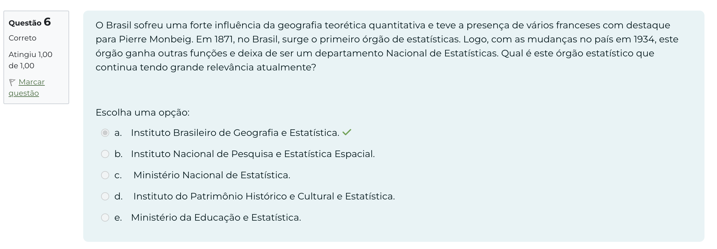 Questão 6 Brasil sofreu uma forte influência da geografia teorética quantitativa e teve a presença de vários franceses com destaque Correto para Pierre Monbeig. Em 1871, no Brasil, surge primeiro órgão de estatísticas. Logo, com as mudanças no país em 1934, este Atingiu 1,00 órgão ganha outras funções e deixa de ser um departamento Nacional de Estatísticas. Qual é este órgão estatístico que de 1,00 continua tendo grande relevância atualmente? Marcar questão Escolha uma opção: a. Instituto Brasileiro de Geografia e Estatística. b. Instituto Nacional de Pesquisa e Estatística Espacial. C. Ministério Nacional de Estatística. d. Instituto do Patrimônio Histórico e Cultural e Estatística. e. Ministério da Educação e Estatística.