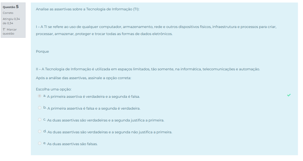 Questão 5 Analise as assertivas sobre a Tecnologia de Informação (TI): Correto Atingiu 0,34 de 0,34 I - A se refere ao uso de qualquer computador, rede e outros dispositivos físicos, infraestrutura e processos para criar, Marcar questão processar, armazenar, proteger e trocar todas as formas de dados Porque II - A Tecnologia de Informação é utilizada em espaços limitados, tão somente, na informática, telecomunicações e automação. Após a análise das assertivas, assinale a opção correta: Escolha uma opção: a. A primeira assertiva é verdadeira e a segunda é falsa. b. A primeira assertiva é falsa e a segunda é verdadeira. C. As duas assertivas são verdadeiras e a segunda justifica a primeira. d. As duas assertivas são verdadeiras e a segunda não justifica a primeira. e. As duas assertivas são
