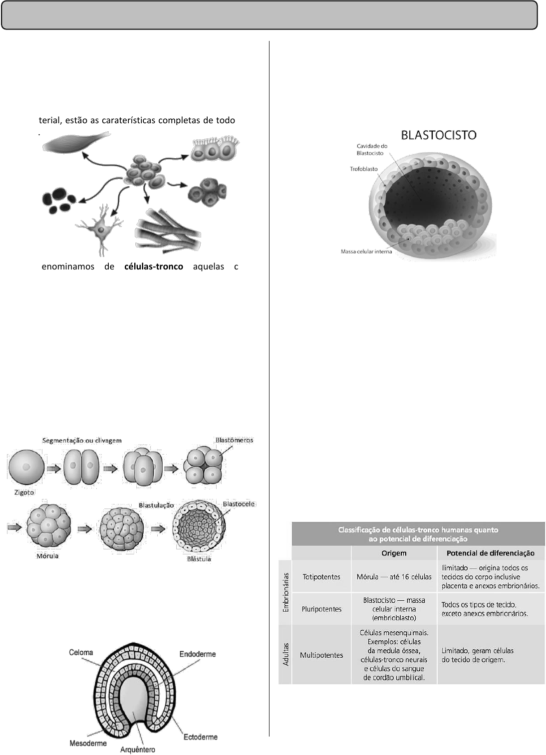 Página 1 de 1 BIOLOGIA GERAL – PROFESSOR RICARDO SOUZA. CÉLULAS TRONCO. As células-tronco totipotentes, pluripotentes e multipotentes diferenciam-se por sua capacidade de formar novos tipos celulares. As células-tronco conseguem diferenciar-se em vários tipos celulares. Todas as células possuem material genético e, nesse material, estão as caraterísticas completas de todo um indivíduo. Denominamos de células-tronco aquelas com capacidade de dividir-se e diferenciar-se em distintos tipos celulares. São, portanto, células indiferenciadas. Algumas células podem diferenciar-se em qualquer uns dos tipos celulares existentes no organismo. Essas células são chamadas de células-tronco totipotentes e podem formar qualquer célula imaginável, incluindo tecidos extraembrionários, como é o caso da placenta. Entretanto, nem todas as células são totipotentes, sendo essa característica exclusiva do zigoto (leia mais sobre fecundação) e das células formadas até a fase de mórula (do latim mórula ,amora). Existem ainda células-tronco chamadas de pluripotentes. Esse grupo, diferentemente das células totipotentes, não pode originar tecidos extraembrionários e possui a capacidade apenas de gerar as células dos folhetos embrionários, ou seja, do ectoderma, mesoderma e endoderma. Vale lembrar que esses folhetos são os primórdios de todos os tecidos e órgãos do nosso corpo. Como exemplo de células pluripotentes, podemos citar as células-tronco embrionárias, que são encontradas na massa interna do blastocisto. Vale destacar que, atualmente, existem técnicas que podem tornar células diferenciadas em células pluripotentes. Esse grupo, por sua vez, recebe o nome de células-tronco de pluripotência induzida. Por fim, temos as células-tronco multipotentes, que, diferentemente das demais, podem diferenciar-se em apenas alguns tipos celulares. Esse tipo de célula é encontrado mais facilmente no nosso corpo e é responsável pela renovação de certos órgãos. Como principal exemplo, podemos citar as células da medula óssea vermelha. Percebemos, portanto, que as células-tronco, graças à sua capacidade de diferenciação, podem ser usadas para fins terapêuticos. Diversas doenças podem ser curadas ou atenuadas com o uso dessa importante terapia, entretanto, muitos estudos na área ainda devem ser feitos. https://www.preparaenem.com/biologia/fecundacao.htm https://www.preparaenem.com/biologia/segmentacao.htm https://www.preparaenem.com/biologia/segmentacao.htm https://www.preparaenem.com/biologia/medula-ossea.htm https://www.preparaenem.com/biologia/medula-ossea.htm