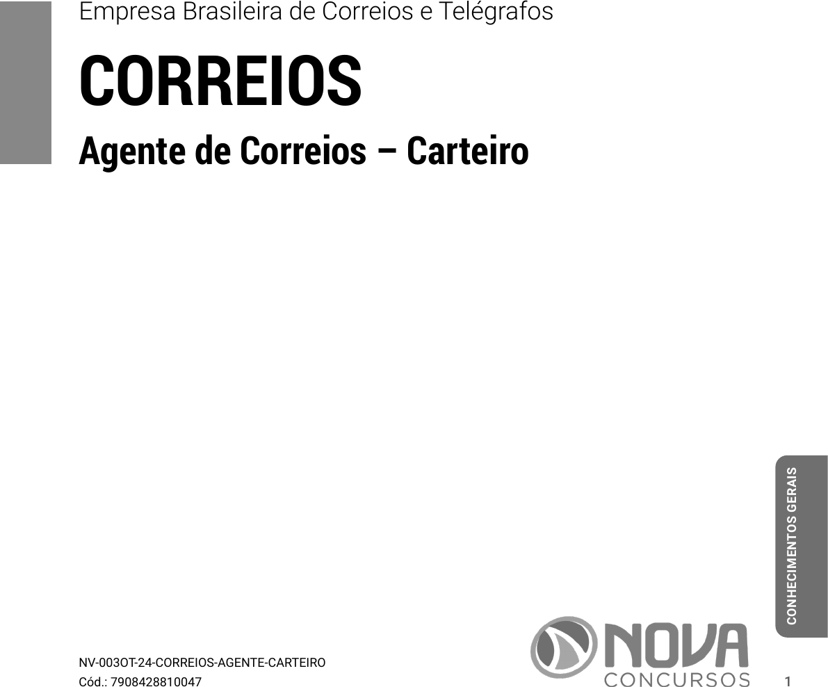 C O N H EC IM EN TO S G ER A IS 1 Empresa Brasileira de Correios e Telégrafos CORREIOS Agente de Correios – Carteiro NV-003OT-24-CORREIOS-AGENTE-CARTEIRO Cód.: 7908428810047 O conteúdo deste livro eletrônico é licenciado para Ayslan CS - 615.411.973-99, vedada, por quaisquer meios e a qualquer título, a sua reprodução, cópia, divulgação ou distribuição, sujeitando-se aos infratores à responsabilização civil e criminal. 2 SUMÁRIO CONHECIMENTOS GERAIS ..............................................................................................1 NOÇÕES BÁSICAS DE CARTOGRAFIA ............................................................................................... 1 LOCALIZAÇÃO ....................................................................................................................................................1 ORIENTAÇÃO: PONTOS CARDEAIS ...................................................................................................................1 LATITUDE, LONGITUDE E ALTITUDE .................................................................................................................2 COORDENADAS GEOGRÁFICAS ........................................................................................................................2 REPRESENTAÇÃO: LEITURA E CONVENÇÕES .................................................................................................2 LEGENDAS ...........................................................................................................................................................6 ESCALA ...............................................................................................................................................................6 ASPECTOS FÍSICOS DO BRASIL E MEIO AMBIENTE ........................................................................ 8 GRANDES DOMÍNIOS DE CLIMA, VEGETAÇÃO, RELEVO E HIDROGRAFIA: ECOSSISTEMAS .......................8 ORGANIZAÇÃO DO ESPAÇO AGRÁRIO ............................................................................................ 11 ATIVIDADES ECONÔMICAS .............................................................................................................................12 MODERNIZAÇÃO ..............................................................................................................................................15 CONFLITOS .......................................................................................................................................................16 ORGANIZAÇÃO DO ESPAÇO URBANO: ATIVIDADES ECONÔMICAS, EMPREGO E POBREZA ....................18 REDE URBANA ..................................................................................................................................................22 REGIÕES METROPOLITANAS ..........................................................................................................................23 DINÂMICA DA POPULAÇÃO BRASILEIRA ....................................................................................... 23 FLUXOS MIGRATÓRIOS, ÁREAS DE CRESCIMENTO E DE PERDA POPULACIONAL ....................................23 FORMAÇÃO TERRITORIAL E DIVISÃO POLÍTICO-ADMINISTRATIVA (ORGANIZAÇÃO FEDERATIVA) ...................................................................................................................................... 31 O conteúdo deste livro eletrônico é licenciado para Ayslan CS - 615.411.973-99, vedada, por quaisquer meios e a qualquer título, a sua reprodução, cópia, divulgação ou distribuição, sujeitando-se aos infratores à responsabilização civil e criminal. C O N H EC IM EN TO S G ER A IS 1 CONHECIMENTOS GERAIS NOÇÕES BÁSICAS DE CARTOGRAFIA LOCALIZAÇÃO A cartografia é uma técnica de produção sistemá- tica de mapas originária da região da Mesopotâmia. A primeira representação cartográfica data aproxima- damente do século 23 a.C.; essa origem está ligada à necessidade de apresentar a outras pessoas um espa- ço desconhecido. Por ser a região da Mesopotâmia a localidade onde surgiram os primeiros grupos sociais organizados em sociedades, a criação da cartografia nesse local foi uma questão de necessidade. O aprimoramento das técnicas de produção ocor- reu junto à intensificação do uso. Um mapa, além de representar um espaço, pode conter diversas infor- mações; por esse motivo, é necessário ler corretamen- te suas informações. O título (quando houver) é o ponto de partida; em seguida, deve-se ler a legenda, que se trata de um pequeno quadro normalmente disposto nas extremi- dades inferior ou superior do mapa, contendo as infor- mações que o mapa transmite; para isso, podem ser utilizados símbolos, cores, ou a combinação de ambos. Um mapa deve ser uma reprodução proporcio- nal fiel ao tamanho do espaço representado; para ser possível realizar a conversão das distâncias no mapa para o distanciamento verdadeiro no espaço físico, há a necessidade do uso da escala cartográfica, represen- tando o tamanho da redução do espaço originário em relação ao mapa. Um mapa necessariamente deve conter um pon- to de orientação — preferencialmente, uma rosa dos ventos com pontos cardeais ou minimamente o Norte geográfico. Esse último não possui relação com a parte superior do mapa, pois os pontos cardeais represen- tam direções no plano superficial do planeta, ou seja, representam direcionamentos na horizontal; logo, o posicionamento norte pode ser representado na por- ção superior, inferior, laterais e diagonais. Vale lembrar que a cartografia não é apenas uma representação de espaço com uso exclusivo da Geo- grafia; seu uso também é presente em disciplinas como história e sociologia. Órgãos governamentais também a utilizam para o desenvolvimento de polí- ticas públicas. Até mesmo você, em seu cotidiano, faz uso dos c