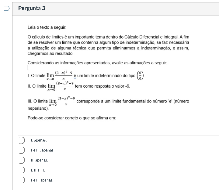 Pergunta 3 Leia texto a cálculo de limites é um importante tema dentro do Cálculo Diferencial e A fim de se resolver um limite que contenha algum tipo de indeterminação, se faz necessária a utilização de alguma técnica que permita eliminarmos a indeterminação, e assim, chegarmos ao resultado. Considerando as informações apresentadas, avalie as afirmações a seguir: I. limite lim é um limite indeterminado do tipo x-0 II. limite lim tem como resposta valor -6 x-0 III. limite lim corresponde a um limite fundamental do número 'e' (número x-0 x neperiano). Pode-se considerar correto o que se afirma em: I, apenas. e III, II, apenas. I, e III. e II apenas.