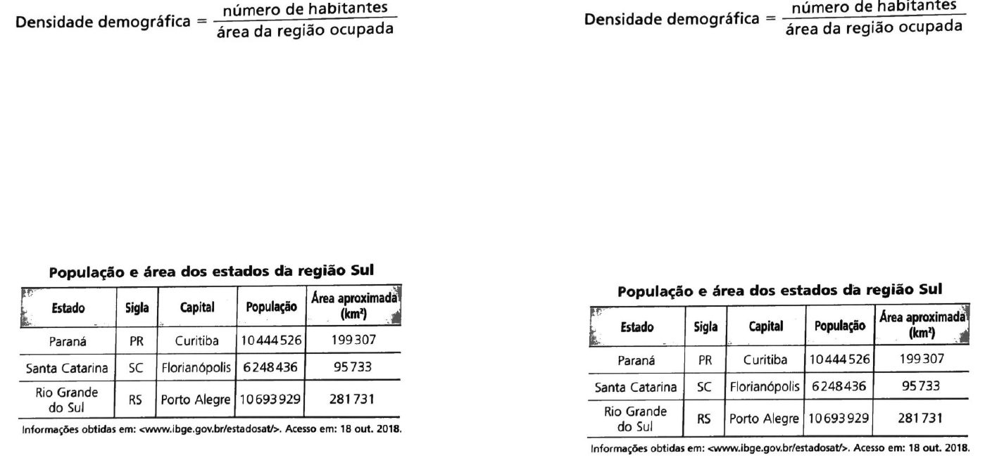 Densidade demográfica De acordo com o Instituto Brasileiro de Geografia e Estatística — IBGE, a densidade demográfica é o total de população residente (número de habitantes) dividido pela área que ocupa. A população residente é aquela constituída pelos moradores em domicílios (particulares e coletivos). Podemos expressar a densidade demográfica pela razão: Responda às questões no caderno. 1. De acordo com o Censo 2010, a Bahia estava com 14 016 906 habitantes e sua capital tinha 2 675 656 habitantes. A Bahia é o maior estado da região Nordeste do Brasil, com uma área de 564 830 km2, e tem a mais extensa costa marítima (900 km) de todos os estados brasileiros. Usando uma calculadora, responda: a) Qual é a densidade demográfica da Bahia? b) Sabendo que Salvador ocupa cerca de 693 km2, qual é a densidade demográfica de Salvador? 2. Das regiões do Brasil, a região Sul tem a menor área, ocupando apenas 6,8% do território nacional. Observe os dados da tabela e responda. a) Qual é o estado da região Sul que tem a maior extensão territorial? Qual é a sua área aproximada? b) Qual é o estado mais populoso? Quantos habitantes tem? c) Usando uma calculadora, calcule a densidade demográfica desse estado. d) Usando a calculadora, determine a densidade demográfica do estado menos populoso. 3. Faça uma pesquisa e determine a densidade demográfica do estado de MG e do município de Divinópolis/MG. Densidade demográfica De acordo com o Instituto Brasileiro de Geografia e Estatística — IBGE, a densidade demográfica é o total de população residente (número de habitantes) dividido pela área que ocupa. A população residente é aquela constituída pelos moradores em domicílios (particulares e coletivos). Podemos expressar a densidade demográfica pela razão: Responda às questões no caderno. 1. De acordo com o Censo 2010, a Bahia estava com 14 016 906 habitantes e sua capital tinha 2 675 656 habitantes. A Bahia é o maior estado da região Nordeste do Brasil, com uma área de 564 830 km2, e tem a mais extensa costa marítima (900 km) de todos os estados brasileiros. Usando uma calculadora, responda: a) Qual é a densidade demográfica da Bahia? b) Sabendo que Salvador ocupa cerca de 693 km2, qual é a densidade demográfica de Salvador? 2. Das regiões do Brasil, a região Sul tem a menor área, ocupando apenas 6,8% do território nacional. Observe os dados da tabela e responda. a) Qual é o estado da região Sul que tem a maior extensão territorial? Qual é a sua área aproximada? b) Qual é o estado mais populoso? Quantos habitantes tem? c) Usando uma calculadora, calcule a densidade demográfica desse estado. d) Usando a calculadora, determine a densidade demográfica do estado menos populoso. 3. Faça uma pesquisa e determine a densidade demográfica do estado de MG e do município de Divinópolis/MG. image1.png image2.png