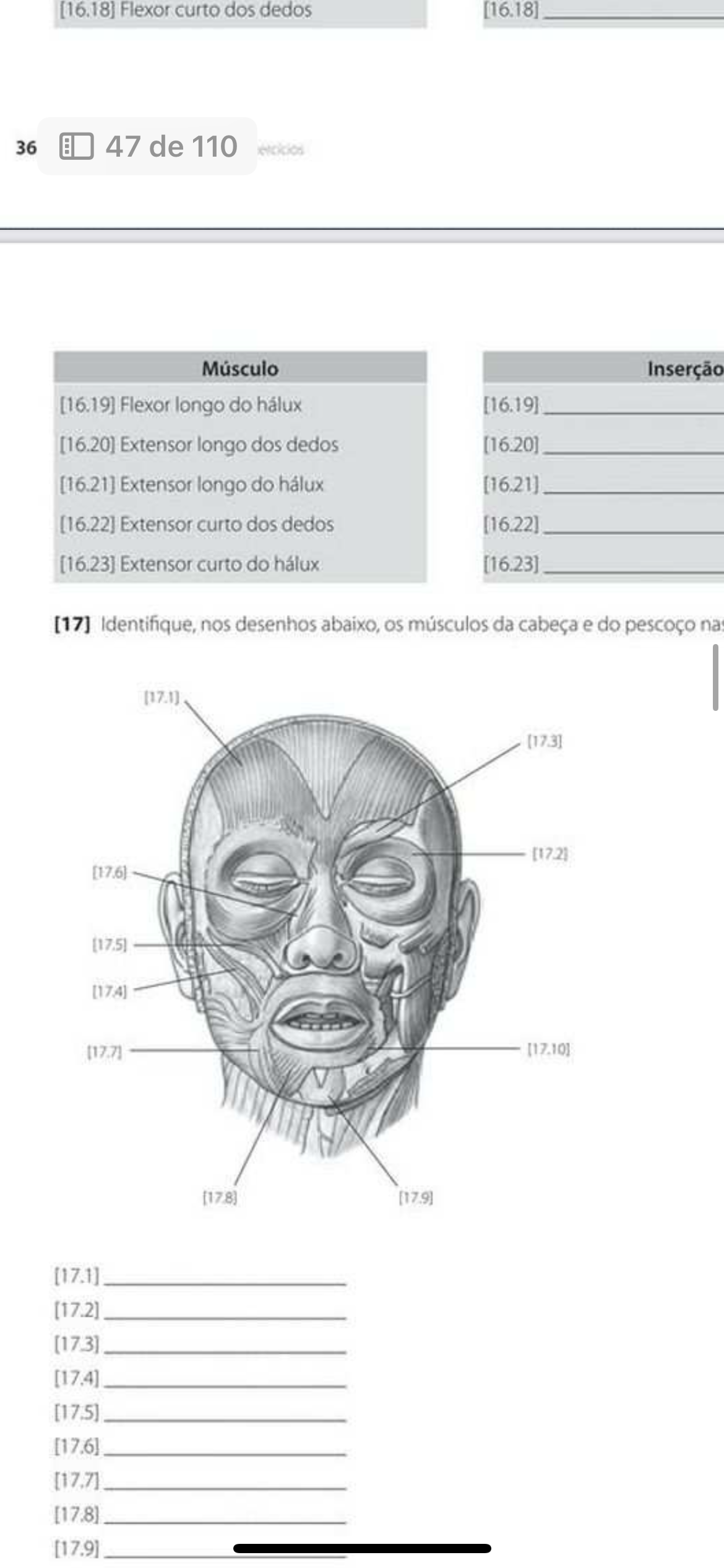 [16.18] Flexor curto dos dedos [16.18] 36 47 de 110 Músculo Inserção [16.19] Flexor longo do halux [16.19] [16.20] Extensor longo dos dedos [16.20] [16.21] Extensor longo do [16.21] [16.22] Extensor curto dos dedos [16.23] Extensor curto do [16.23] [17] nos desenhos abaixo, os músculos da cabeça e do pescoço na (17.3) (17.8) [17.1] [17.2] [17.4] [17.5] [17.6] [17.8] [17.9]