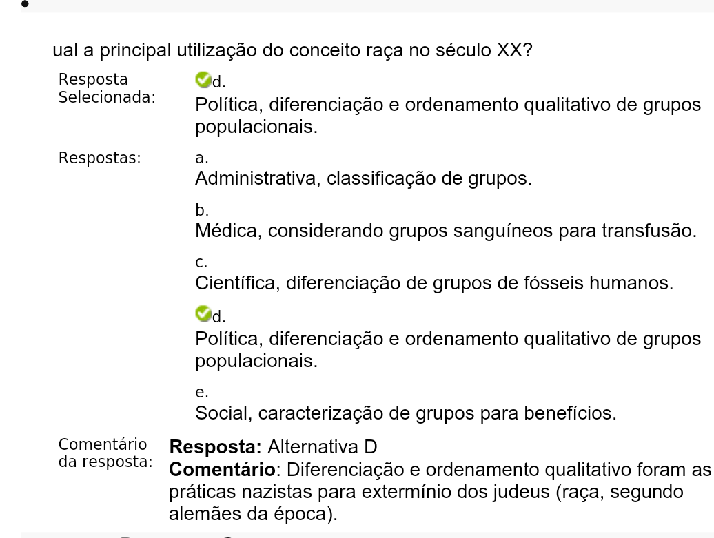 ual a principal utilização do conceito raça no século XX? Resposta d. Selecionada: Política, diferenciação e ordenamento qualitativo de grupos populacionais. Respostas: a. Administrativa, classificação de grupos. b. Médica, considerando grupos sanguíneos para transfusão. Científica, diferenciação de grupos de fósseis humanos. d. Política, diferenciação e ordenamento qualitativo de grupos populacionais. e. Social, caracterização de grupos para benefícios. Comentário Resposta: Alternativa D da resposta: Comentário: Diferenciação e ordenamento qualitativo foram as práticas nazistas para extermínio dos judeus (raça, segundo alemães da época).