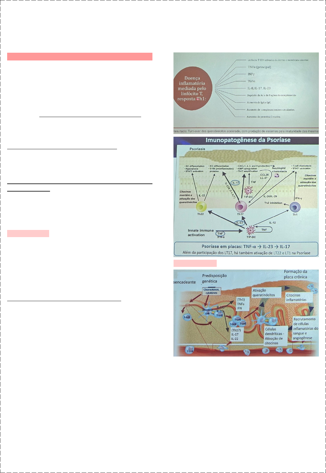 Afecções inflamatórias ERUPÇÕES ERITÊMATO-ESCAMOSAS Psoríase Dermatose inflamatória crônica (não tem cura, e sim controle) e proliferativa · As células da epiderme estão em crescimento maior que o normal #não é uma doença autoimune Passa por fases de remissão e exacerbação, as lesões podendo por vezes desaparecer por completo durante muito tempo e então reaparecer Compromete pele e articulações, sendo o comprometimento articular indicativo da necessidade de terapia sistêmica Multifatorial, de etiopatogenia não esclarecida Maior velocidade do ciclo evolutivo dos queratinócitos (turn-over7x maior nas lesões) · Essa velocidade do ciclo causa o aparecimento de escamas A lesão clássica da psoríase é a placa eritemato-descamativa, bem delimitada Epidemiologia Distribuição universal (prevalência média = 1,31%) – 18,2% formas moderada a grave · Psoríase leve é tratada pelo médico generalista (quase 80%) Rara em negros e asiáticos Acomete os sexos igualmente Mais frequente na terceira década/ rara na infância, mas pode ocorrer Há dois picos de incidência 1. Antes dos 40 anos (entre 16 e 22 anos) 2. Após os 40 anos (entre 57 e 60 anos) Pior prognóstico — início precoce e parente de 1º grau afetado Tipos de psoríase de acordo com o início bimodal: 1. Psoríase tipo 1 — início precoce, hereditária, associada HLA (antígeno leucocitário humano), de maior gravidade 2. Psoríase tipo 2 — mais tardia, esporádica, sem relação com HLA, com quadro mais leve Fisiopatogenia A psoríase é uma doença inflamatória mediada pelo linfócito T, através da resposta Th1 · Linfócitos T CD4 da derme e da membrana sinovial ativados · TNF—α (principal via do processo inflamatório) · INF—γ · TGF—α · IL—8 · Depósito de Ac e de frações de complemento · Aumento de IGA e IgG · Aumento de complexos imunes circulantes · Aumento de proteína C reativa O resultado turn-over acelerado por parte dos ceratinócitos, com produção de escamas pela imaturidade das mesmas Também está relacionada com fatores como a imunidade inata e a resposta Th17 Genética e Epigenética: + de 30 genes relacionados · Deflagladores: tabagismo, obesidade, infecções, álcool, drogas (lítio, betabloqueadores, antimaláricos) Psoríase vulgar Padrões de apresentação na pele · Psoríase em placas (psoríase vulgar) · Psoríase gutata (eruptiva) · Psoríase em pequenas placas · Psoríase invertida- · Psoríase pustulosa · Psoríase eritrodérmica Psoríase em placas · Mais comum (90%) · 80% - acometimento do couro cabeludo · Geralmente monomórfica (placas bem semelhantes) · Distribuição simétrica · Comum prurido e queimação · Artrite (40%) · Halo de Woronoff (halo esbranquiçado ao redor da lesão) · Curetagem metódica de Brocq — sinal da vela (estratificação em escamas) e de Auspitz (pequenos pontos hemorrágicos) #Sinal de vela => diagnóstico de psoriase · Psoríase ostrácea — placas com descamação tão exacerbada que forma crostas muito espessas e aderidas · Quadro pode ser exacerbado por associação a doenças como HIV · Diagnóstico diferencial = dermatite de contato Psoríase gutata · 7% · Crianças, adolescentes e adultos jovens · Quadro caracterizado pelo surgimento súbito de várias lesões, também conhecida como forma eruptiva · Lesões pequenas e disseminadas (2mm a 1cm) · Episódios agudos pós infecção estreptocócica, aliado à história familiar de psoríase em placas · Sobretudo tronco e região proximal dos MM · Bom prognóstico — resolução em 2 a 3 meses (doença se torna “dormente”) · 1/3 dos casos evolui para forma crônica (em placas) Psoríase em pequenas placas: · Semelhante à forma gutata · Surgimento lento e crônico · Ocorre geralmente em indivíduos mais velhos Psoríase invertida · As lesões aparecem nas grandes dobras do corpo (apresentação incomum) · Descamação mínima ou ausente, com bordas bem definidas · Causa redução da sudorese na área afetada · Crianças, obesos e pacientes HIV+ · Pode surgir após intertrigo (infecção que ocorre pelo atrito da pele, em que há proliferação de bactérias e fungos dermatófitos) · Diagnóstico difícil e tardio · Diagnóstico diferencial de cândida Psoríase pustulosa · Três subtipos: 1. Tipo Von Zumbusch - Forma generalizada · Lesões eritemato-edematosas, com discreta descamação · Presença de pústulas estéreis (sem infecção) · Febre, comprometimento do estado geral e leucocitose · Interrupção de corticoide oral, hipocalcemia, infecções ou irritação local · Curta duração, evoluindo para eritrodermia ou revertendo ao quadro anterior 2. Forma localizada (divide-se em 3 formas) I. Lesão única ou algumas II. Acrodermatite contínua de Hallopeau - lesões em extremidades dos dedos das mãos e pés III. Pustulose palmoplantar — eritema descamação e pústulas, geralmente simétricas e bilaterais nas palmas e/ou cavos plantares 3. Imperigo Herpetiforme - Psoríase pustulosa generalizada que ocorre na gravidez Psoríase eritrodérmica ( 40 anos são 2x vezes mais acometidas que pessoas com menos de 20 anos · Sem predileção por sexo · Instalação precoce e familiar — maior gravidade · Lesões variáveis — pittings (pontinhos avermelhados), onicólise, onicorrexe, ceratose subungueal, “mancha de óleo” (manchas amareladas) Psoríase na infância · 1/3 dos casos de psoríase inicia antes dos 20 anos · Comum a ocorrência de pittings ungueais · Apresentação mais rara na população pediátrica, mas a forma congênita existe · Características especiais: · Maior comprometimento facial (periorificial) · Áreas de dobra (psoríase invertida) e psoríase “das fraldas” · Lesões úmidas com pouca descamação Fatores modificadores da doença · Traumas · Infecções · Hábitos de vida · Medicações Influência do ambiente e dos hábitos Traumas — Fenômeno de Koebner 