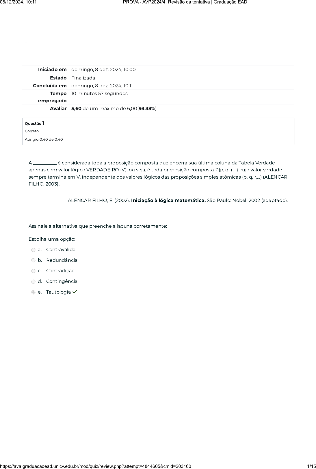 Iniciado em domingo, 8 dez. 2024, 10:00 Estado Finalizada Concluída em domingo, 8 dez. 2024, 10:11 Tempo empregado 10 minutos 57 segundos Avaliar 5,60 de um máximo de 6,00(93,33%) Questão 1 Correto Atingiu 0,40 de 0,40 A __________ é considerada toda a proposição composta que encerra sua última coluna da Tabela Verdade apenas com valor lógico VERDADEIRO (V), ou seja, é toda proposição composta P(p, q, r,...) cujo valor verdade sempre termina em V, independente dos valores lógicos das proposições simples atômicas (p, q, r,...) (ALENCAR FILHO, 2003). ALENCAR FILHO, E. (2002). Iniciação à lógica matemática. São Paulo: Nobel, 2002 (adaptado). Assinale a alternativa que preenche a lacuna corretamente: Escolha uma opção: a. Contraválida b. Redundância c. Contradição d. Contingência e. Tautologia ✓ 08/12/2024, 10:11 PROVA - AVP2024/4: Revisão da tentativa | Graduação EAD https://ava.graduacaoead.unicv.edu.br/mod/quiz/review.php?attempt=4844605&cmid=203160 1/15 Questão 2 Correto Atingiu 0,40 de 0,40 Questão 3 Correto Atingiu 0,40 de 0,40 As Tabelas Verdade consistem em um método semântico para validação de argumentos com limitações práticas. Sendo assim, para obter o número de linhas de uma Tabela Verdade basta aplicar a fórmula 2 , sendo que n representa o número de proposições. BISPO, C. A. F.; CASTANHEIRA, L. B.; SOUZA FILHO, O. M. Introdução à Lógica Matemática. Cengage Learning, 2011 (adaptado). Assinale a alternativa que corresponde ao número de linhas de uma Tabela Verdade com as proposições simples “p”, “q”, “r” e “s”. Diante do exposto, assinale a alternativa correta: Escolha uma opção: a. 64 b. 32 c. 8 d. 16 ✓ e. 4 n Se representarmos as _________ e a _________ utilizando fórmulas de predicados, podemos determinar que o argumento base é válido se o conjunto das fórmulas que representam as ________ “implicar” logicamente a fórmula que corresponde a _________ . MORTARI, C. A. Introdução à Lógica. São Paulo: Editora UNESP: Imprensa O�cial do Estado, 2001 (adaptado). Assinale a alternativa que preenche as lacunas do texto corretamente e respectivamente: Escolha uma opção: a. Premissas; conclusão; premissas; conclusão. ✓ b. Consequentes; premissa; conclusões; antecedente. c. Antecedentes; premissa; consequentes; antecedente. d. Conclusões; premissa; conclusões; premissa. e. Apagoges; antecedente; consequentes; apagoge. 08/12/2024, 10:11 PROVA - AVP2024/4: Revisão da tentativa | Graduação EAD https://ava.graduacaoead.unicv.edu.br/mod/quiz/review.php?attempt=4844605&cmid=203160 2/15 Questão 4 Correto Atingiu 0,40 de 0,40 De acordo com Mortari (2001), as contingências são fórmulas cujo valor lógico não pode ser determinado utilizando apenas a análise lógica, ou seja, é necessário empregar a observação nessa tarefa. Posto isso, é dito que as contradições fazem uma descrição do mundo, ou seja, re�ete melhor o mundo real. MORTARI, C. A. Introdução à Lógica. São Paulo: Editora UNESP: Imprensa O�cial do Estado, 2001 (adaptado). Construa a seguinte Tabela Verdade: Assinale a alternativa que contenha a construção correta da Tabela Verdade: Escolha uma opção: a. b. c. ✓ d. e. 08/12/2024, 10:11 PROVA - AVP2024/4: Revisão da tentativa | Graduação EAD https://ava.graduacaoead.unicv.edu.br/mod/quiz/review.php?attempt=4844605&cmid=203160 3/15 Questão 5 Correto Atingiu 0,40 de 0,40 Identi�camos que as Tabelas Verdade são um método semântico cujo objetivo é a validação de argumentos com algumas limitações práticas. Além disso, ao construir tabelas verdade com mais de duas proposições atômicas se obtêm uma proposição composta P, Q, R, ..., e a última coluna dessa Tabela Verdade pode ser classi�cada em Tautologia, Contradição ou Contingência. ALENCAR FILHO, E. (2002). Iniciação à lógica matemática. São Paulo: Nobel, 2002 (adaptado). Sobre isso, analise as a�rmativas abaixo: I – “É considerada uma tautologia toda a proposição composta que encerra sua última coluna da Tabela Verdade no valor lógico VERDADEIRO (V)” II – “As tautologias também são consideradas proposições tautológicas ou proposições logicamente verdadeiras”. III – “É considerada uma contradição toda proposição composta cuja última coluna restante das operações lógicas na Tabela Verdade �gure ao menos uma vez os valores lógicos V e F”. IV – “É considerada uma contingência quando na última coluna da Tabela Verdade encerra apenas com o valor lógico FALSIDADE (F)”. É correto o que se a�rma em: Escolha uma opção: a. Apenas I e IV estão corretas. b. Apenas I e II estão corretas. ✓ c. Apenas I e III estão corretas. d. Todas as alternativas estão corretas. e. Apenas I, II e III estão corretas. 08/12/2024, 10:11 PROVA - AVP2024/4: Revisão da tentativa | Graduação EAD https://ava.graduacaoead.unicv.edu.br/mod/quiz/review.php?attempt=4844605&cmid=203160 4/15 Questão 6 Correto Atingiu 0,40 de 0,40 As Tabelas Verdade são um instrumento para validação de argumentos. Além disso, a partir das regras dos conectivos proposicionais é possível construir as respectivas Tabelas Verdade. Assim sendo, uma proposição condicional possui valor lógico FALSIDADE (F) se, e somente se, a proposição antecedente possuir valor lógico VERDADEIRO (V) e a consequente valor lógico FALSIDADE (F). BISPO, C. A. F.; CASTANHEIRA, L. B.; SOUZA FILHO, O. M. Introdução à Lógica Matemática. Cengage Learning, 2011 (adaptado). Construa a Tabela Verdade da Condicional para as proposições simples “p” e “q”: Assinale a alternativa que contenha a construção correta da Tabela Verdade da Condicional “→ ”. Escolha uma opção: a. b. ✓ c. 08/12/2024, 10:11 PROVA - AVP2024/4: Revisão da tentativa | Graduação EAD https://ava.graduacaoead.unicv.edu.br/mod/quiz/review.php?attempt=4844605&cmid=203160 5/15 Questão 7 Incorreto Atingiu