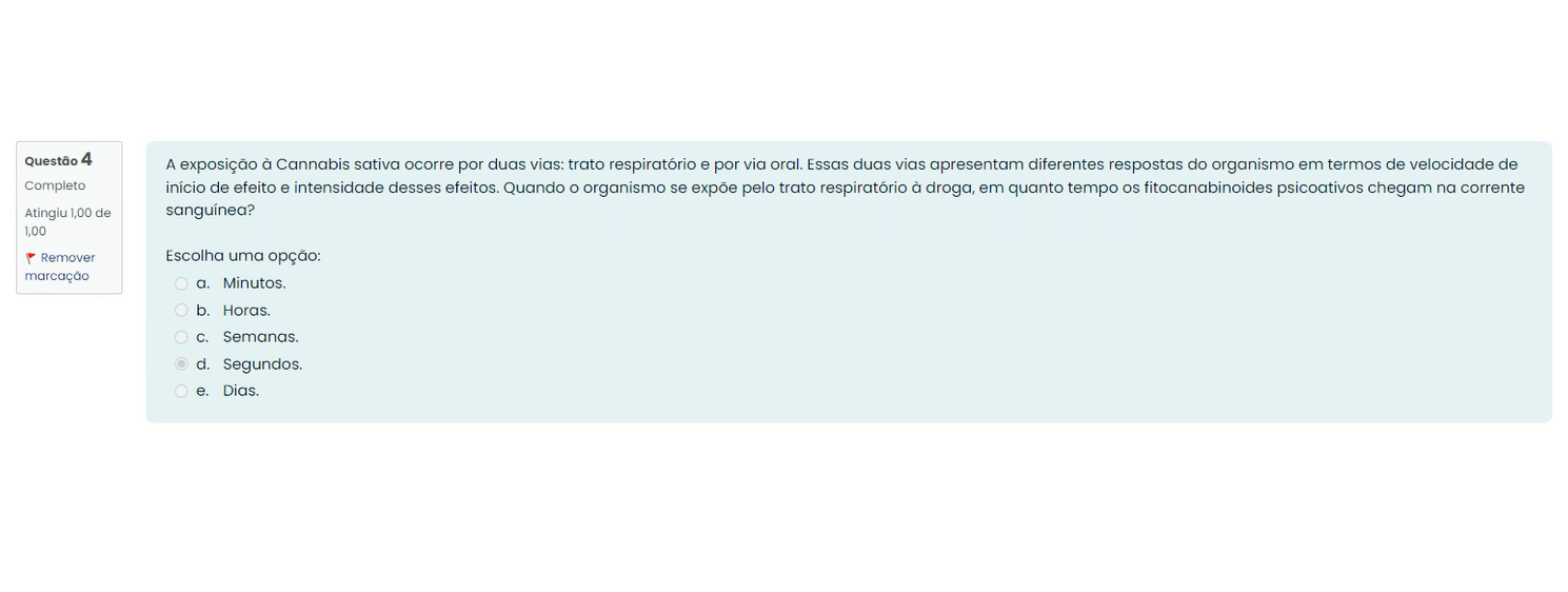 Questão 4 A exposição à Cannabis sativa ocorre por duas vias: trato respiratório e por via oral. Essas duas vias apresentam diferentes respostas do organismo em termos de velocidade de Completo início de efeito e intensidade desses efeitos. Quando organismo se expõe pelo trato respiratório à droga, em quanto tempo os fitocanabinoides psicoativos chegam na corrente Atingiu 1,00 de sanguínea? 1,00 Remover Escolha uma marcação a. b. Horas. C. d. Segundos. e. Dias.
