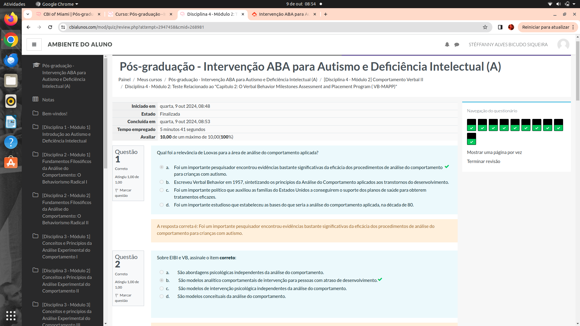 Atividades Google Chrome 9 de out 08:54 CBI of Pós-gradu Curso: Pós-graduação Disciplina 4 Módulo 2: Intervenção ABA para + Reiniciar para atualizar AMBIENTE DO ALUNO STÉFFANNY ALVES BICUDO SIQUEIRA Pós-graduação Pós-graduação - Intervenção ABA para Autismo e Deficiência Intelectual (A) Intervenção ABA para Autismo e Deficiência Painel / Meus cursos / Pós-graduação Intervenção ABA para Autismo e Deficiência Intelectual (A) / [Disciplina 4 Módulo 2] Comportamento Verbal Intelectual (A) / Disciplina 4 Módulo 2: Teste Relacionado ao "Capítulo 2: Verbal Behavior Milestones Assessment and Placement Program (VB-MAPP)" Notas Iniciado em 9 out 2024. 08:48 Navegação do questionário Bem-vindos! Estado Finalizada Concluída em quarta, 9 out 2024. 08:53 [Disciplina 1 Módulo Tempo empregado 5 minutos 41 segundos Introdução ao Autismo e de um máximo de 10,00(100%) Deficiência Intelectual [Disciplina 2 Módulo Questão Qual foi a relevância de Loovas para a área de análise do comportamento aplicada? Mostrar uma página por vez Fundamentos Filosóficos 1 Terminar revisão da Análise do Correto Foi um importante pesquisador encontrou evidências bastante significativas da eficácia dos procedimentos de análise do comportamento Comportamento: O para crianças com autismo. Atingiu de Behaviorismo Radical I 1.00 b. Escreveu Verbal Behavior em sintetizando os princípios da Análise do Comportamento aplicados aos transtornos do desenvolvimento. Marcar Foi um importante político que auxiliou as famílias do Estados Unidos a conseguirem suporte dos planos de saúde para obterem [Disciplina 2 Módulo questão tratamentos Fundamentos Filosóficos d. Foi um importante estudioso que estabeleceu as bases do que seria a análise do comportamento aplicada, na década de 80. da Análise do Comportamento: Behaviorismo Radical II A resposta correta Foi um importante pesquisador encontrou evidências bastante significativas da eficácia dos procedimentos de análise do comportamento para crianças com [Disciplina 3 Módulo Conceitos e Princípios da Análise Experimental do Comportamento I Questão Sobre EIBI e VB. assinale o item correto: 2 [Disciplina 3 Módulo 2] Correto São abordagens psicológicas independentes da análise do comportamento. Conceitos e Princípios da Atingiu 1.00 de b. São modelos analítico comportamentais de intervenção para pessoas com atraso de desenvolvimento. Análise Experimental do 1.00 C. São modelos de intervenção psicológica independentes da análise do comportamento. Comportamento Marcar d. São modelos conceituais da análise do comportamento. questão [Disciplina 3 Módulo Conceitos e princípios da Análise Experimental do