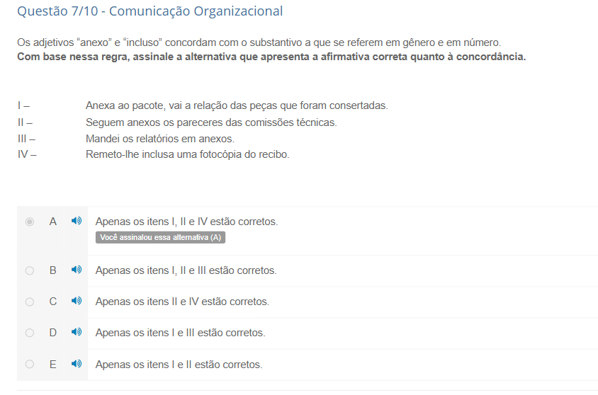 Questão 7/10 - Comunicação Organizacional Os adjetivos "anexo" e "incluso" concordam com o substantivo a que se referem em gênero e em Com base nessa regra, assinale a alternativa que apresenta a afirmativa correta quanto à concordância. - Anexa ao pacote, vai a relação das peças que foram II - Seguem anexos os pareceres das comissões III - Mandei os relatórios em anexos. IV - Remeto-lhe inclusa uma fotocópia do recibo. A Apenas os itens I, II e IV estão corretos. Você assinalou essa alternativa (A) B Apenas os itens I, e III estão corretos. C Apenas os itens e IV estão corretos. D Apenas os itens I e III estão corretos. E Apenas os itens I e estão