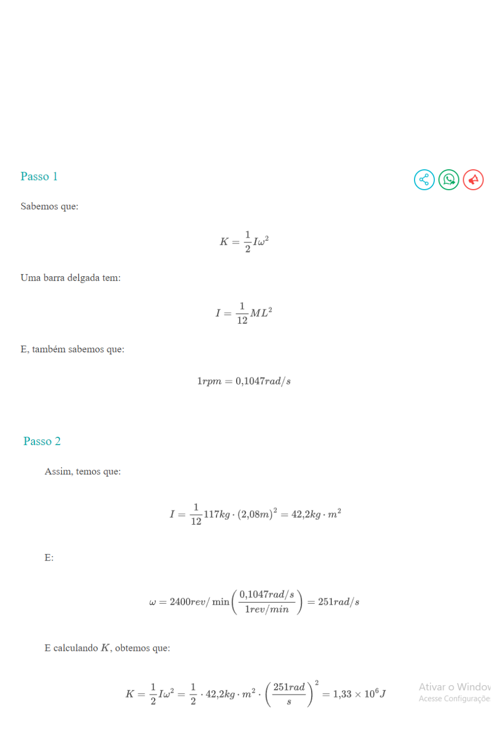 lista 7 1 - Uma hélice de avião possui massa de 117 kg e comprimento igual a 2, 08 m (de uma extremidade à outra). A hélice está girando a 2400 rev/min em relação a um eixo que passa pelo seu centro. (a) Qual é a sua energia cinética rotacional? Considere a hélice como uma barra delgada. (b) Suponha que, devido a restrições de peso, você teve que reduzir a massa da hélice a 75, 0 % da sua massa original, mas precisou manter o mesmo tamanho e a energia cinética. Qual deveria ser sua velocidade escalar angular, em rpm? 2 - Um disco composto de diâmetro externo de 140, 0 cm é constituído de um disco maciço uniforme com raio de 50, 0 cm e densidade de área de 3, 0 g/cm2 , cercado por um anel concêntrico com raio interno de 50, 0 cm, raio externo de 70, 0 cm e densidade de área de 2, 0 g/cm2 . Ache o momento de inércia desse objeto em relação a um eixo perpendicular ao plano do objeto e que passa pelo seu centro. 3 - Uma corda leve e flexível é enrolada diversas vezes em torno da periferia de uma casca cilíndrica com raio de 0, 25 m e peso igual a 40, 0 N que gira sem atrito em torno de um eixo horizontal fixo. O cilindro é ligado ao eixo por meio de raios com momentos de inércia desprezíveis. O cilindro está inicialmente em repouso. A extremidade livre da corda é puxada com uma força constante F até uma distância de 5, 0 m, e nesse ponto a extremidade da corda se move a 6, 0 m/s. Sabendo que a corda não desliza sobre o cilindro, qual é o valor da força F? *Nessa o enunciando é diferente* 4 - Uma esfera consiste de uma bola maciça de madeira com densidade uniforme de 800 kg/m3 e raio de 0, 20 m e está coberta por um fino papel laminado com densidade de área de 20 kg/m2 . Calcule o momento de inércia dessa esfera em relação a um eixo que passa pelo seu centro. Lista 8 1 - Uma força atuando sobre uma peça de uma máquina é dada pela expressão F~ = (−5, 0 N)ˆi + (4, 0 N)ˆj. O vetor da origem ao ponto onde a força é aplicada é dado por ~r = (−0, 450 m)ˆi + (0, 150 m)ˆj. (a) Faça um diagrama mostrando ~r, F~ e a origem. (b) Use a regra da mão direita para determinar a direção e o sentido do torque. (c) Determine algebricamente o vetor torque produzido pela força. Verifique se a direção e o sentido do torque são iguais aos obtidos em (b). 2 - Um livro de 2, 0 kg está em repouso sobre uma superfície horizontal sem atrito. Uma corda amarrada ao livro passa sobre uma polia com diâmetro igual a 0, 150 m e sua outra extremidade está presa a outro livro suspenso com massa de 3, 0 kg. O sistema é solto a partir do repouso, e os livros se deslocam 1, 20 m em 0, 800 s. (a) Qual é a tensão em cada parte da corda? (b) Qual é o momento de inércia da polia em torno do seu eixo de rotação? 3 - Uma esfera oca com paredes finas de massa igual a 12, 0 kg e diâmetro de 48, 0 cm está girando em torno de um eixo que passa pelo seu centro. O ângulo (em radianos) em que ele gira em função do tempo (em segundos) é dado por θ(t) = At2 + Bt4 , onde A possui o valor numérico de 1, 50 e B de 1, 10. (a) Quais são as unidades das constantes A e B? (b) No instante de 3, 0 s, ache (i) o momento angular da esfera e (ii) o torque resultante sobre a esfera. Lista 9 1 - Um aro de 2, 20 kg e 1, 20 m de diâmetro está rolando da esquerda para a direita sem deslizar sobre um piso horizontal a constantes 3, 0 rad/s. (a) Com que velocidade o seu centro está se movendo? (b) Qual é a energia cinética total do aro? *Somente Letra A e B* 2 - Uma bola maciça é liberada do repouso e desliza para baixo pela encosta de uma colina com inclinação de 65, 0 ◦ com o plano horizontal. (a) Qual valor mínimo deve ter o coeficiente de atrito estático entre as superfícies da colina e da bola para que nenhum deslizamento ocorra? (b) O coeficiente de atrito calculado no item (a) é suficiente para impedir que uma bola oca (como uma bola de futebol) deslize? *Somente Letra A e B* 3 - O ioiô. Um ioiô é feito usando-se dois discos uniformes, cada um com massa m = 2, 0 g e raio R = 5, 0 cm ligados por um eixo leve de raio b = 1, 0 cm. Um fio leve é enrolado várias vezes em torno do eixo e a seguir é mantido fixo enquanto o ioiô é libertado do repouso, caindo verticalmente à medida que o fio desenrola. Calcule a aceleração linear, a aceleração angular do ioiô e a tensão no fio. Use g = 9, 81 m/s2 . *Não possui valores*