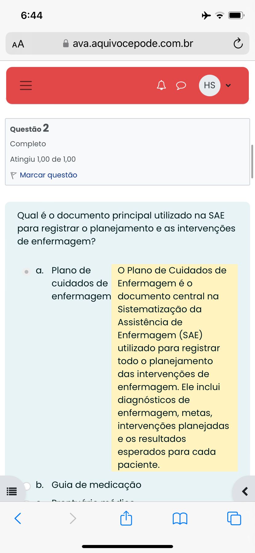 6:44 AA ava.aquivocepode.com.br HS Questão 2 Completo Atingiu 1,00 de 1,00 Marcar questão Qual é o documento principal utilizado na SAE para registrar o planejamento e as intervenções de enfermagem? a. Plano de Plano de Cuidados de cuidados de Enfermagem é o enfermagem documento central na Sistematização da Assistência de Enfermagem (SAE) utilizado para registrar todo o planejamento das intervenções de enfermagem. Ele inclui diagnósticos de enfermagem, metas, intervenções planejadas e os resultados esperados para cada paciente. b. Guia de medicação