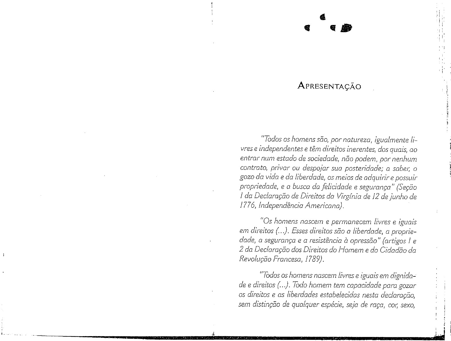 APRESENTAÇÃO "Todos os homens são, por natureza, igualmente li- vres e independentes e têm, direitos inerentes, dos quais, ao entrar num. estado de sociedade, não podem., por nenhum, contrato, privar ou despojar sua posteridade; a saber, o gozo da vida e da liberdade, os meios de adquirir e possuir propriedade, e a. busca, da felicidade e segurança." (Seção 1 da Declaração de Direitos da Virgínia, de 12 de junho de 1776, Independência Americana). "Os homens nascem e permanecem livres e iguais em direitos (...). Esses direitos são a liberdade, a. proprie- dade, a segurança, e a. resistência, à opressão" (artigos l e 2 da Declaração dos Direitos do Hom.em e do Cidadão da Revolução Francesa, 1789). "Todos os hom.ens nascem livres e iguais em. dignida- de e direitos (...). Todo homem, tem capacidade para gozar os direitos e as liberdades estabelecidas nesta declaração, sem distinção de qualquer espécie, seja de raça, cor, sexo, 8 João Ricardo W. DorneUes língua, religião, opinião político ou de outra natureza, ori- gem nacional ou social, riqueza, nascimento ou qualquer outra condição (...). Todo homem tem direito à vida, ò. li- berdade e à segurança pessoal" (artigos l, II e III da Declara- ção Universal dos Direitos do Homem proclamada, a 10 de dezembro de 1948 pela Assembleia das Nações Unidas). Diferentes declarações, diferentes textos, dife- rentes momentos históricos. Esses trechos, como inú- meros outros, recheiam os últimos duzentos anos da história humana. São fragmentos que representam não apenas ideais, mas, muito mais do que isso, são o re- sultado de grandes lutas travadas pelos povos para se livrarem das correntes da opressão, da exploração, do preconceito e da violência. São pequenos testemunhos documentais de lu- tas descomunais que mobilizaram grandes contingen- tes humanos por sua libertação. Direitos humanos. Qual o significado dessas palavras que nesses últimos dois séculos passaram a fazer parte do voca- bulário sócio-político, e que para muitos significa espe- rança, ilusões, desilusões, luta, necessidades básicas, humanidade? Quando hoje, em pleno século XX, ao comemo- rarmos os cinquenta anos da Declaração Universal da ONU e os duzentos e vinte anos da Declaração Fran- cesa, ouvimos alguém falar em direitos humanos, nos passa pela cabeça urna infinidade de ideias: Revolução Francesa, Independência Americana, Declaração da O que são Direitos Humanos 9 ONU, desaparecidos na América Latina, apartheid, as madres de Ia Piaza de Mayo, as torturas nas delegacias policiais, a pena de morte, a ação dos Esquadrões da Morte, a devastação da Amazónia, o massacre contra as nações indígenas, o assassinato de Chico Mendes, as condições de vida dos sem-terra, os favelados, os me- nores abandonados, etc. E lógico que o tema se relaciona com tudo isso e muito mais, mas é importante "começarmos do come- ço" para entendermos como surgiu e se desenvolveu o que chamamos de direitos humanos. Direitos do homem, direitos naturais, direitos hu- manos, direitos fundamentais, valores superiores, garan- tias individuais, direitos concretos, liberdades públicas. Corno se vê, temos uma grande quantidade de palavras e termos para designar o assunto que pretendemos tratar. Para alguns trata-se de direitos inerentes à vida, à segurança individual, aos bens que preservam a huma- nidade. Para outros é a expressão de valores superiores que se encarnam nos homens. Outros, ainda, enten- dem que são o produto da competência legislativa do Estado ao reconhecer direitos e estabelecer um equilí- brio na sociedade. Uns entendem serem direitos inerentes à nature- za humana; outros afirmam serem a expressão de uma conquista social através de um processo de luta política. Enfim, é um tema - como também ocorre com a democracia, a liberdade e a justiça - que tem recebido uma série de significados e interpretações as mais con- traditórias possíveis. Trata-se, no entanto, de se fazer 10 João Ricardo W. Dornelles uma abordagem que não se restrinja a uma abstrata conceituação generalizada, mas que busque dar con- teúdos precisos a essa "embalagem" utilizada por todos com "recheios" diferentes. É, portanto, fundamental entender que os direi- tos humanos, antes de qualquer coisa, apresentam um claro conteúdo político. Quando o ex-presidente americano (1980-1988) Ronald Reagan se declarava um defensor dos direitos humanos, ficou bem claro para todos nós a substancial diferença de conteúdo político e ideológico de sua con- cepção em relação à defendida pelos familiares dos de- saparecidos durante as ditaduras da Argentina, Brasil, Uruguai, Chile, El Salvador, Guatemala, etc. Desde pequenos nos acostumamos a ouvir que "todos nascem iguais e livres", ou então que "todos são iguais perante a lei". O que significa isso? Essa é a verdade que vemos nas ruas? Ou são apenas meras de- clarações formais expressas ern belos documentos que ganharam importância histórica? Na verdade, as ideias que nos passaram de que todos somos iguais, livres e temos os mesmos direitos foram enunciadas solenemente em algumas declara- ções que passaram para a história dos povos. O que se deve perguntar é se os direitos enunciados em tais declarações são os verdadeiros ou os únicos direitos do homem. E se esses direitos são ou não verdades eter- nas, naturais. E no caso de não o serem, como e por que se escolheu apenas esses direitos como os funda- mentais para o ser humano. O que soo Direitos Humanos 11 Alguns autores importantes dizem que todos os direitos são humanos, pois somente os seres humanos são capazes de serem sujeitos e terem suas faculdades, prerrogativas, interesses e necessidades protegidas, resguardadas e regulamentadas pelo Estado. Trata-se, claramente, de urna concepção que entende que não existe direito sem o consentimento de um poder políti- co que se pretende acima da socied