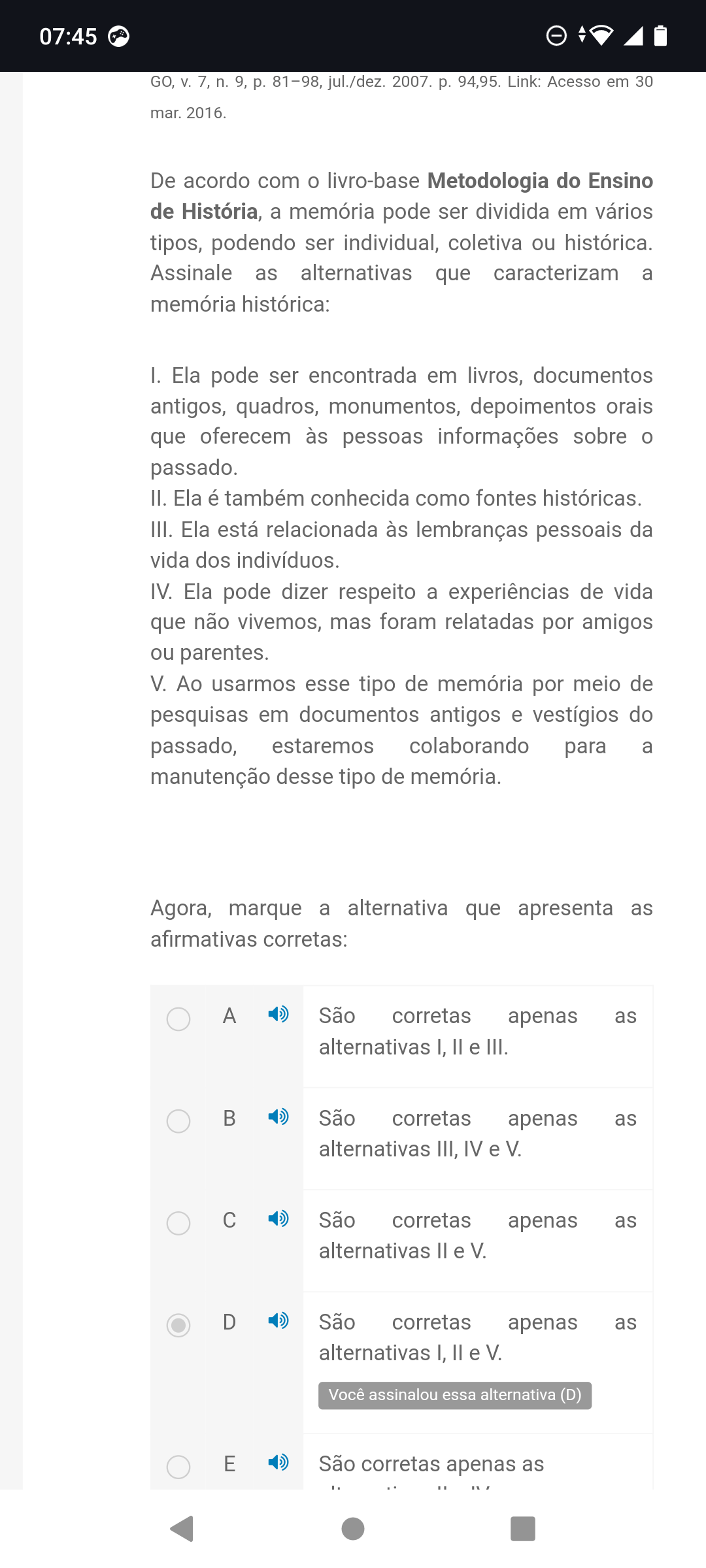 07:45 GO, V. 7, n. 9, p. 81 1-98, - jul./dez. 2007. p. 94,95. Link: Acesso em 30 mar. 2016. De acordo com o livro-base Metodologia do Ensino de História, a memória pode ser dividida em vários tipos, podendo ser individual, coletiva ou histórica. Assinale as alternativas que caracterizam a memória histórica: I. Ela pode ser encontrada em livros, documentos antigos, quadros, monumentos, depoimentos orais que oferecem às pessoas informações sobre o passado. II. Ela é também conhecida como fontes históricas. III. Ela está relacionada às lembranças pessoais da vida dos indivíduos. IV. Ela pode dizer respeito a experiências de vida que não vivemos, mas foram relatadas por amigos ou parentes. V. Ao usarmos esse tipo de memória por meio de pesquisas em documentos antigos e vestígios do passado, estaremos colaborando para a manutenção desse tipo de memória. Agora, marque a alternativa que apresenta as afirmativas corretas: A São corretas apenas as alternativas I, e III. B São corretas apenas as alternativas III, IV e V. C São corretas apenas as alternativas e V. D São corretas apenas as alternativas I, e V. Você assinalou essa alternativa (D) E São corretas apenas as