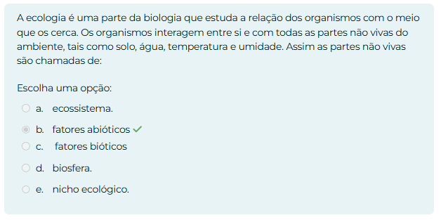 A ecologia é uma parte da biologia que estuda a relação dos organismos com meio que os cerca. Os organismos interagem entre si e com todas as partes não vivas do ambiente, tais como solo, água, temperatura e umidade. Assim as partes não vivas são chamadas de: Escolha uma opção: a. ecossistema. b. fatores abióticos C. fatores bióticos d. biosfera. e. nicho ecológico.