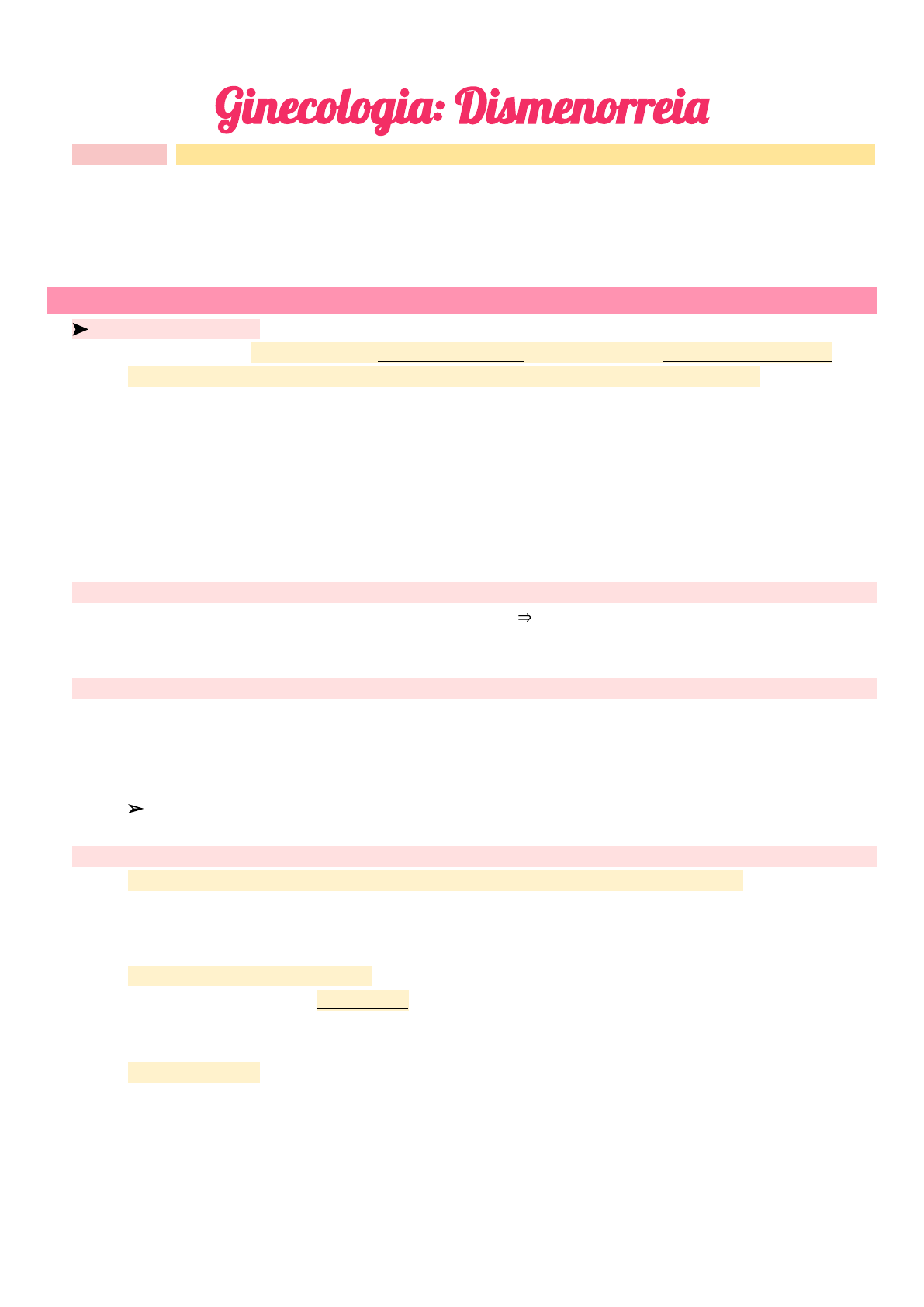 Alexandre Garrido _____ ) Dismenorreia e Sd. Pré-Menstrual _ / 7º Período - Turma 105 B ________________________________________________________________________________________________ Ginecologi�: Dismenorrei� ➽ Definição : Síndrome clínica caracterizada por dor em cólica em abdome inferior associada ao fluxo menstrual , podendo ou não ter sintomas sistêmicos associados; ↬ Incidência de 72% em mulheres, representam 8% do absenteísmo escolar/laboral; ↬ Sinônimos: Algomenorreia, síndrome da dor menstrual, menstruação dolorosa ou menalgia; __________________________ — Dismenorreia Primária — _________________ ________ ➤ Dismenorreia Primária ⇒ Não acompanha patologia subjacente ⇉ Geralmente o início da dor é no 2º ano após menarca , coincidente com o início do ciclo ovulatório ⇉ Dois primeiros anos tem amadurecimento do eixo, por isso não cicla (é irregular o ciclo) ⇁ Relacionada com os ciclos ovulatórios ⇁ Final do ciclo tem uma diminuição de progesterona → aumento da produção de prostaglandinas relacionadas a gênese da dismenorreia ( e também se relacionada com a síndrome pré-menstrual) ⇉ Teorias: espasmo vascular, espasmo muscular, psicogênica, prostaglandinas (aumenta em mulheres dismenorreicas); ⇁ Teoria das prostaglandinas é a teoria mais aceita; ⦽ Fisiopatologia — Prostaglandinas ______ ⥱ Mucosa uterina + Síntese de prostaglandinas ⇒ Atuam no miométrio durante menstruação, promovendo isquemia e dor ( explica o uso de an�-inflamatórios no tratamento para diminuir a dor ) ⧭ Diagnós�co (primária) ______ ➢ Pode surgir poucas horas antes, junto ou após o sangramento ➢ É de intensidade variável ➢ Associado ou não a vômitos, cefaleia, diarreia, adinamia, síncope ➢ Não há alterações no exame �sico ➢ Duração: 48-72h ▞ Tratamento (primária) ______ ◉ O tratamento de eleição é o AHCO nas pacientes que desejam realizar an�concepção ■ Pouco aceito pelas mães para suas filhas adolescentes ■ Iniciar em dose baixa (Adoless: 0,060mg de gestodeno c/ 0,015mg e�nilestradiol) ◉ AINES são drogas de 2ª escolha ■ Melhor droga: IBUPROFENO , boa eficácia e baixos efeitos colaterais (Buscofem) ■ Outras drogas: Naproxeno, ácido mefenâmico ◉ A�vidade �sica Alexandre Garrido _____ ) Dismenorreia e Sd. Pré-Menstrual _ / 7º Período - Turma 105 B ________________________________________________________________________________________________ __________________________ — Dismenorreia Secundária — ______________ ________ ➤ Dismenorreia Secundária ⇒ Presença de patologia subjacente ⇉ Inicia em qualquer idade e é atribuída a ciclos anovulatórios — inves�gação secundária, pois geralmente preocupa mais; ⇉ Causas da cintura pra baixo: ⇁ Hímen imperfurado: abaulamento na região abdominal + caracteres sexuais secundários ⇁ Septo vaginal: fibrose / estrutura firme no meio da vagina ⇁ Estenose cervical: aprisionamento de secreção na cavidade (principalmente em menopausa) ⇁ Anormalidades anatômicos: útero bicorno, unicorno, etc ⇁ Sinéquias uterinas (Sd. de Asherman): pontes fibró�cas no endométrio que causa dor intensa + amenorreia ⇁ Retroversão uterina acentuada: dispareunia, dor grande ⇁ DIU: hoje em dias existem vários tamanhos, quando desproporcional o corpo tenta expulsar, principalmente em nuliparidade ⇁ Adenomiose: infiltração do endométrio levado ao aumento do volume e contração vigorosa frequente na tenta�va de expulsar esses focos endometriais ⧭ Diagnós�co ______ ➢ Duração prolongada : 2 semanas antes, até alguns dias após o sangramento menstrual ou até mesmo durante o mês inteiro ➢ Alterações em exame laboratorial, exames de imagem (USG/RNM), exame �sico; ➢ Falência do tratamento clínico da primária — ACO, AINE, por 6 meses e com ajuste da dose ▞ Tratamento ______ ◉ Tratar causa base, seja com abordagem cirúrgica ou clínica, de acordo com seus próprios critérios Alexandre Garrido _____ ) Dismenorreia e Sd. Pré-Menstrual _ / 7º Período - Turma 105 B ________________________________________________________________________________________________ Ginecologi�: Síndrom� Pr�-Menstrua� ➽ Definição : distúrbio crônico que ocorre na fase lútea do ciclo menstrual e desaparece logo após o início da menstruação — caracteriza-se com combinação de sintomas �sicos, psicológicos e comportamentais que interferem nas relações interpessoais das mulheres ; ↬ Leve , moderada ou, quando intensa, severa o qual desencadeia o distúrbio disfórico pré-menstrual ★ SPM severa (disfórico pré-menstrual) : Sintomas intensos desde a ovulação, que cessam a par�r do 1º dia de fluxo — tratado com auxílio psiquiátrico/psicológico ➢ “SPM é diária na menopausa” ➽ Epidemiologia : Até 90% das mulheres com sintomas pré-menstruais; ⤇ 40% apresentam SPM – considerando que duram, em média, 6-7 dias por ciclos, as mulheres passam mais de 10% com sintomas; ⤇ DDPM (3-5%); ⤇ Fatores gené�cos; ⤇ F. socioculturais ➤ Quadro Clínico-Psicológico ______ ➸ Ansiedade ➸ Irritabilidade ➸ Depressão ➸ Humor lábil ➸ Sen�mento de desvalia ➸ Insônia ou Hipersonia ➸ Diminuição da memória ➸ Confusão ➸ Concentração diminuída e distração ➤ Quadro Clínico - Físico ______ ➸ Cefaleia tensional ➸ Enxaqueca ➸ Mastalgia ➸ Aumento do volume abdominal ➸ Dores generalizadas ➸ Aumento de peso ➸ Fogachos ➸ Tonturas, náuseas ➸ Palpitação ➸ Cansaço ➤ Mudanças comportamentais ______ ➸ Aumento do ape�te ↪ Avidez por doces ou comidas salgadas ➸ Isolamento social ➸ Aumento do consumo de álcool ➸ Aumento (maioria) ou diminuição da libido ⦽ E�ologia : Desconhecida — consenso diz que seja secundária à a�vidade cíclica ovariana (ga�lho dos sintomas alterando a�vidade da serotonina em nív