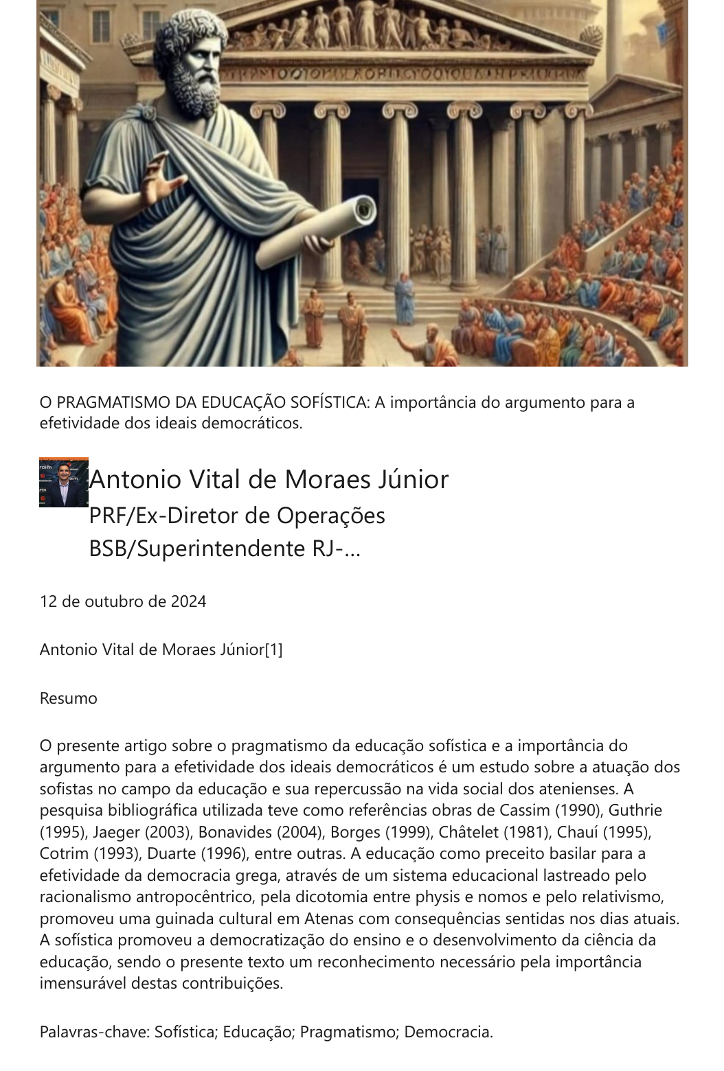 O PRAGMATISMO DA EDUCAÇÃO SOFÍSTICA: A importância do argumento para a efetividade dos ideais democráticos. Antonio Vital de Moraes Júnior 12 de outubro de 2024 PRF/Ex-Diretor de Operações BSB/Superintendente RJ-… Antonio Vital de Moraes Júnior[1] Resumo O presente artigo sobre o pragmatismo da educação sofística e a importância do argumento para a efetividade dos ideais democráticos é um estudo sobre a atuação dos sofistas no campo da educação e sua repercussão na vida social dos atenienses. A pesquisa bibliográfica utilizada teve como referências obras de Cassim (1990), Guthrie (1995), Jaeger (2003), Bonavides (2004), Borges (1999), Châtelet (1981), Chauí (1995), Cotrim (1993), Duarte (1996), entre outras. A educação como preceito basilar para a efetividade da democracia grega, através de um sistema educacional lastreado pelo racionalismo antropocêntrico, pela dicotomia entre physis e nomos e pelo relativismo, promoveu uma guinada cultural em Atenas com consequências sentidas nos dias atuais. A sofística promoveu a democratização do ensino e o desenvolvimento da ciência da educação, sendo o presente texto um reconhecimento necessário pela importância imensurável destas contribuições. Palavras-chave: Sofística; Educação; Pragmatismo; Democracia. 09/12/2024, 14:51 O PRAGMATISMO DA EDUCAÇÃO SOFÍSTICA: A importância do argumento para a efetividade dos ideais democráticos. | L… https://www.linkedin.com/pulse/o-pragmatismo-da-educação-sofística-importância-do-de-moraes-júnior-yzope/?trackingId=%2BgpB28acQrqUe… 1/17 https://www.linkedin.com/in/antonio-vital-de-moraes-j%C3%BAnior-860783327/ https://www.linkedin.com/in/antonio-vital-de-moraes-j%C3%BAnior-860783327/ https://www.linkedin.com/in/antonio-vital-de-moraes-j%C3%BAnior-860783327/ Abstract This article on the pragmatism of sophistic education and the importance of the argument for the effectiveness of democratic ideals is a study on the actions of sophists in the field of education and its repercussions on the social life of Athenians. The bibliographic research used had as references works by Cassim (1990), Guthrie (1995), Jaeger (2003), Bonavides (2004), Borges (1999), Châtelet (1981), Chauí (1995), Cotrim (1993), Duarte (1996), among others. Education as a basic precept for the effectiveness of Greek democracy, through an educational system supported by anthropocentric rationalism, the dichotomy between physis and nomos and relativism, promoted a cultural shift in Athens with consequences felt today. Sophistics promoted the democratization of teaching and the development of the science of education, and this text is a necessary recognition of the immeasurable importance of these contributions. Keywords: Sophistic; Education; Pragmatism; Democracy. Introdução Quando se faz referência ao modelo educacional, é inerente o questionamento sobre em que realidade social, econômica e histórica está sendo discutido seu enquadramento. A educação é um preceito basilar para composição das realidades que circundam o indivíduo. A busca pela emancipação ou participação ativa e consciente deste é o objetivo do processo educacional. Segundo Duarte (1996, p. 51), “não basta formar indivíduos, é preciso saber que tipo de sociedade, para que tipo de prática social o educador está formando indivíduos”. É dentro dessa perspectiva que a educação sofística estruturou o ensino na sociedade ateniense. A ruptura entre a educação antiga grega e a metodologia dos sofistas foi além da organização, foi também a própria democratização do ensino. O ambiente histórico em que surgiu a sofística ocorreu em meados do século V a.C., época em que Atenas era dirigida pela democracia de Péricles. A cidade atravessava um momento de grandes conquistas econômicas e políticas, contudo tinha seu desenvolvimento sociocultural estagnado, momento conhecido como “a crise da consciência grega”. Nesse fértil contexto democrático, os sofistas implantaram uma educação calcada em um conhecimento geral e primordialmente útil para as relações sociais vigentes. Para ilustrar, citamos a lição do professor Arnaldo Vasconcelos (1998, p.86): “Tornara-se imperiosa a formulação de nova mundividência, que fosse capaz de abranger e dar sentido a essa realidade. O desafio foi plenamente assumido pelos sofistas. Daí a excelente recepção que lhes proporcionavam sempre, em suas visitas, os jovens aspirantes à liderança política.” As referências sobre a história desses pensadores, além de poucas, são também fragmentadas, sendo caracterizadas pela distorção nas interpretações de suas posições. A relevância dos sofistas para o pensamento ocidental está ligada indissociavelmente à máxima de que educação é o princípio basilar para uma vida em sociedade, sendo 09/12/2024, 14:51 O PRAGMATISMO DA EDUCAÇÃO SOFÍSTICA: A importância do argumento para a efetividade dos ideais democráticos. | L… https://www.linkedin.com/pulse/o-pragmatismo-da-educação-sofística-importância-do-de-moraes-júnior-yzope/?trackingId=%2BgpB28acQrqUe… 2/17 considerados como os precursores da docência e defensores primeiros do espírito democrático. O presente trabalho apresenta um estudo sobre a educação sofística através de uma abordagem prática dos conhecimentos propagados pelos seus representantes, enfatizando o pragmatismo, a metodologia, a democratização do ensino e suas repercussões para a construção dos ideais de democracia ainda hoje vigentes. Como observa Lesky (1995, p. 317): “Não há outro movimento que se possa comparar com a Sofística quanto a duração das suas conseqüências. Não que, de um golpe, tenha modificado a vida cultural grega; antes, já vimos que os círculos afetados por ela ao princípio eram de certa maneira restritos. Mas o mundo de idéias que ela fez desintegrar nunca mais voltou a formar uma verdadeira unidade, e as pergunta