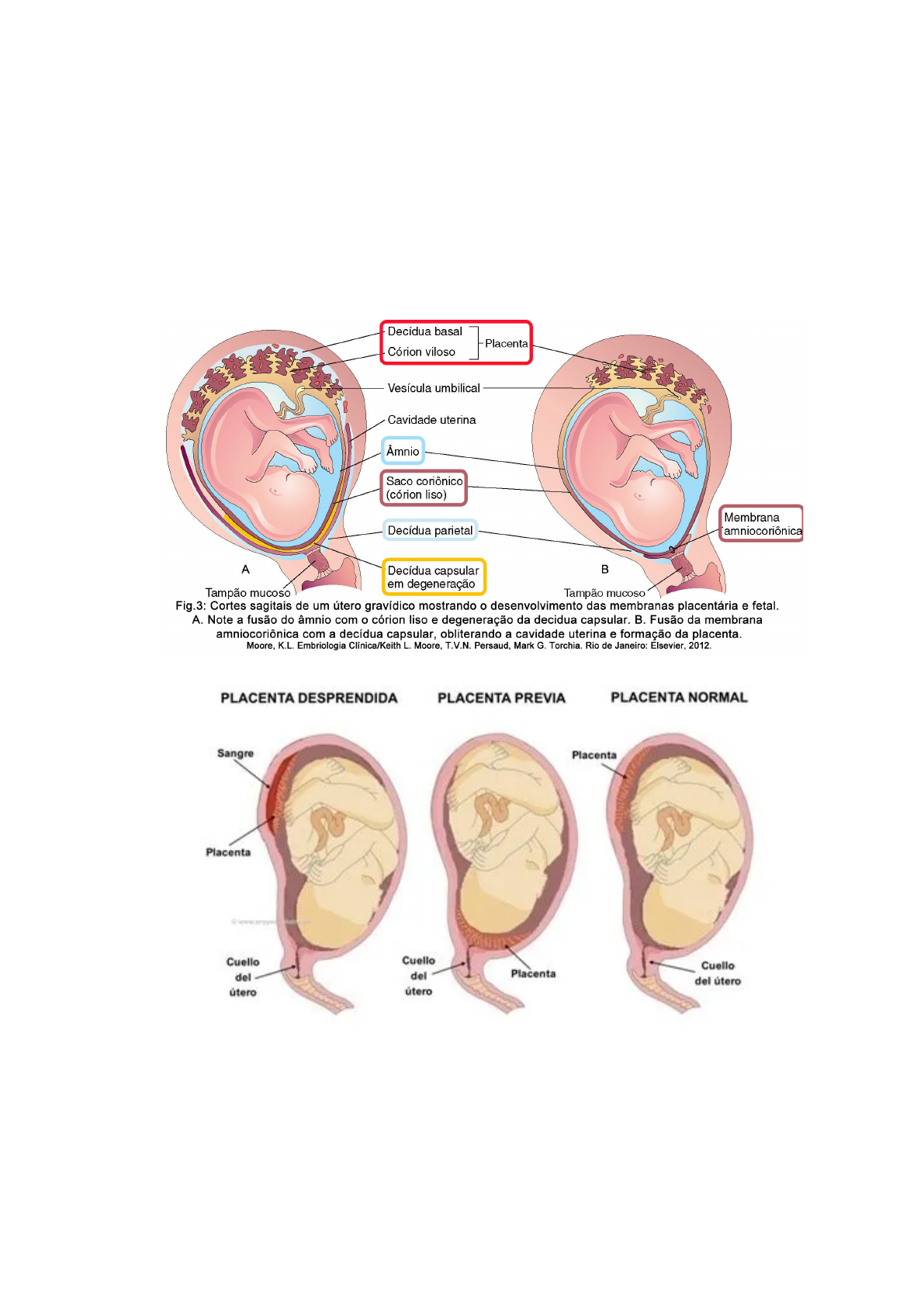 Descolamento Prematuro da Placenta (DPP) O descolamento prematuro da placenta é definido como a separação prematura da placenta da decídua durante ou após 20 semanas de gestação. Os principais achados clínicos são sangramento vaginal e dor abdominal, frequentemente acompanhados por contrações uterinas, sensibilidade uterina e um padrão não tranquilizador da frequência cardíaca fetal. A causa imediata do descolamento prematuro da placenta é a ruptura de vasos maternos na decídua basal. O acúmulo de sangue separa a decídua, descolando uma fina camada da decídua com sua inserção placentária. O vaso materno rompido pode ser uma artéria ou uma veia. Fatores de risco ● Descolamento anterior ● Hipertensão ● Traumas abdominais ou acidentes ● Pré-eclâmpsia ou eclâmpsia ● Anormalidades uterinas estruturais ● Hábitos de vida - uso de drogas, tabagismo e alcoolismo ● Fatores genéticos Sinais e sintomas Descolamento oculto: contrações uterinas sem ou com mínimo sangramento vaginal e dor abdominal. Toda ou a maior parte do sangue fica retido entre as membranas fetais e a decídua em vez de escapar pelo colo do útero e pela vagina. Descolamento total: apresenta abrupto início de sangramento vaginal, dor abdominal ligeira a moderada e contrações uterinas. A dor nas costas pode ser um sintoma adicional proeminente quando a placenta está na parede posterior do útero. O útero geralmente está firme e pode estar rígido e sensível. Um descolamento grave pode estar associado a um sangramento vaginal leve/clinicamente insignificante quando um grande volume de sangue é retido atrás da placenta. Consequências Maternas: relacionadas à severidade do descolamento da placenta. ● Perda sanguínea excessiva ● Choque hipovolêmico ● Lesão renal aguda ● Falência de múltiplos órgãos Fetais: relacionados à severidade do descolamento da placenta. ● Morbidade e mortalidade perinatal aumentada ● Hipoxemia ● Baixo peso ao nascer ● Prematuridade Diagnóstico Clínico: baseado nos sinais e sintomas e anomalias no BCF ou óbito fetal. Imagem: coágulos retro placentários podem ser achados no ultrassom. Tratamento Avaliação inicial e estabilização da paciente. O manejo depende se o feto foi a óbito ou não, do BCF e da IG. Parto precoce, transfusão sanguínea, analgesia adequada e monitorização materna e fetal. Parto por cesárea é indicado em casos de instabilidade hemodinâmica materna ou deterioração dos sinais vitais, coagulopatia e reações à transfusão sanguínea. Hemorragia maciça: ABCD ● Avaliar vias aéreas e respiração. Iniciar a oxigenoterapia a 10/15 L/min. ● Garantir 2 acessos calibrosos, prova cruzada e laboratório (hemograma com contagem de plaquetas, tipagem sanguínea, coagulograma). Estabelecer monitorização e reposição volêmica. ● Avaliar o feto e decidir sobre o parto. Placenta Prévia Placenta prévia refere-se à presença de tecido placentário que se estende de forma parcial ou total sob o segmento inferior do útero. A localização anormal da placenta pode resultar em sangramento uterino grave anteparto, intraparto e/ou pós-parto. Outras sequelas incluem a necessidade de parto cesáreo e um alto risco de parto prematuro. Fatores de risco ● Cesárea anterior ● Multiparidade ● Idade materna avançada ● Gestação múltipla ● Antecedentes pessoais ● Curetagens prévias ● Gemelaridade Diagnóstico Sangramento vaginal no final do 2º trimestre ou no início do 3º trimestre, indolor, com coloração vermelho-vivo. Achado assintomático na ultrassonografia entre 18 e 20 semanas de gestação. Não se deve realizar o exame do toque até se conhecer a localização exata da placenta. Tratamento Depende da presença e intensidade do sangramento vaginal e da IG. Pré-termo: sangramento discreto a moderado ● Internação ● Repouso no leito ● Vitalidade fetal ● Corticoterapia Sangramento profuso: ● Internação ● Reserva de hemocomponentes ● Avaliação hemodinâmica com reposição SN ● Cesárea de urgência Vasa Prévia Os vasos sanguíneos fetais da placenta ou do cordão umbilical atravessam a abertura interna do colo do útero, abaixo do bebê. Essa condição pode fazer com que esses vasos sanguíneos se rompam durante o trabalho de parto ou o parto. O diagnóstico pré-natal de vasa prévia é baseado na identificação de vasos fetais membranosos que passam através ou próximos do orifício cervical interno por exame de ultrassom transvaginal em tempo real com Doppler colorido. A ressonância magnética pode ser usada para esclarecer o diagnóstico ultrassonográfico quando há incerteza diagnóstica e a confirmação afetará o manejo da gravidez. Conduta No pré-parto deve-se confirmar o diagnóstico. Repouso pélvico. Avaliar o crescimento fetal e realizar os exames necessários. Monitorização. Administração de corticosteroides antenatais até 34 semanas de gestação. As gestantes com vasa prévia devem realizar cesárea, para diminuir os riscos de ruptura, compressão, hipoxemia e exsanguinação. Parto programado: cesárea a partir de 36 semanas. Cesárea de emergência em casos de ruptura pré-parto das membranas, desacelerações variáveis persistentes e sangramento vaginal acompanhado de taquicardia fetal. Acretismo placentário A placenta se adere anormalmente à parede uterina, penetrando muito profundamente. Dependendo da profundidade da invasão, essa condição pode ser classificada em três tipos: Acreta: vilosidades placentárias se aderem ao miométrio. Increta: vilosidades placentárias penetram no miométrio. Percreta: vilosidades placentárias passam através do miométrio e se estendem aos órgãos adjacentes, como a bexiga. Fatores de risco ● Placenta baixa ou prévia ● Cesária prévia ● Fertilização in vitro ● Curetagem ● Cirurgias uterinas prévias ● Histórico pessoal ● Anomalias uterinas ● Multiparidade ● Idade mate