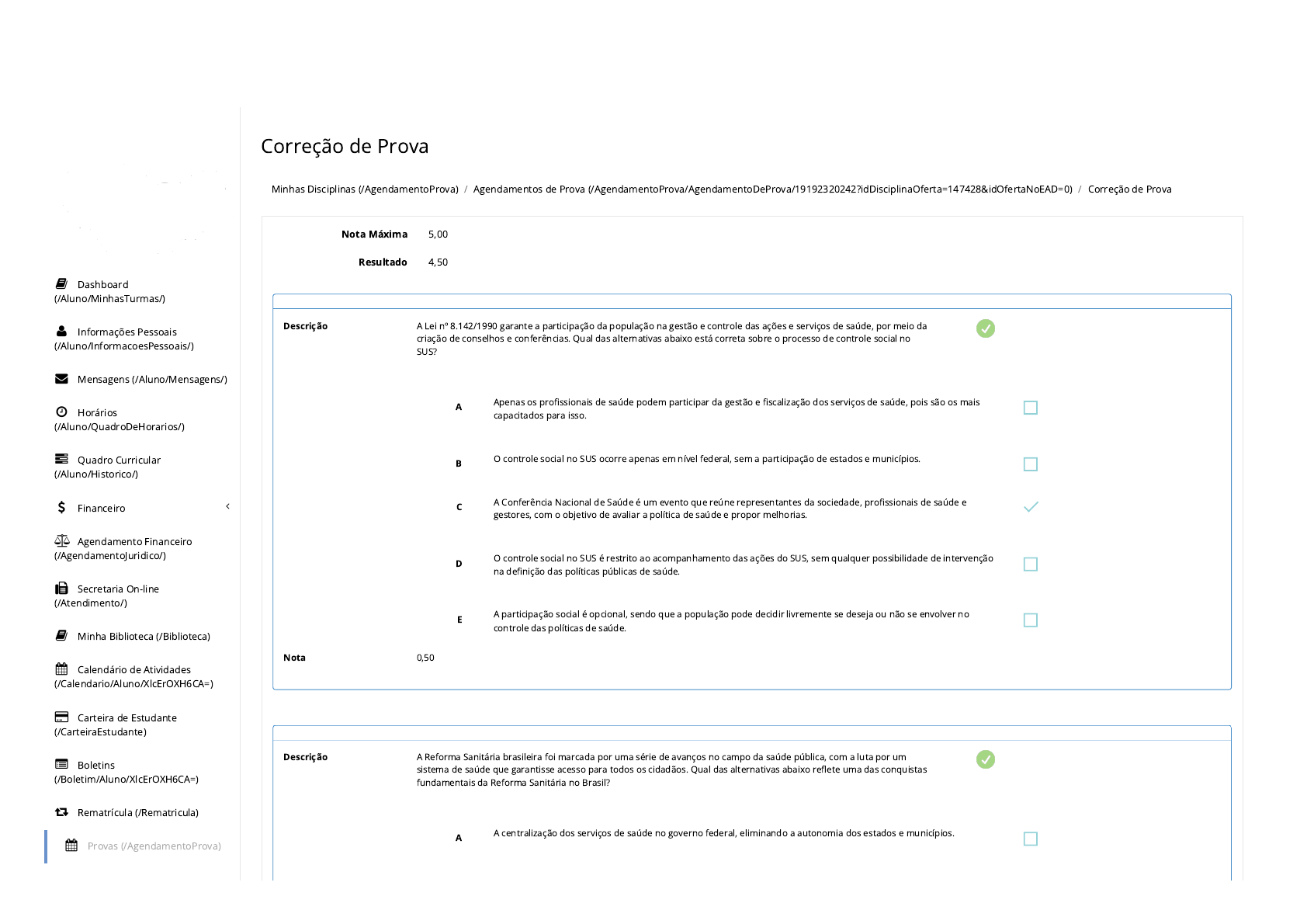 JENNIFER CAROLLINE DUARTE Matrícula: 202309377 Nutrição - Integral Dashboard (/Aluno/MinhasTurmas/) Informações Pessoais (/Aluno/InformacoesPessoais/) Mensagens (/Aluno/Mensagens/) Horários (/Aluno/QuadroDeHorarios/) Quadro Curricular (/Aluno/Historico/) Financeiro Agendamento Financeiro (/AgendamentoJuridico/) Secretaria On-line (/Atendimento/) Minha Biblioteca (/Biblioteca) Calendário de Atividades (/Calendario/Aluno/XlcErOXH6CA=) Carteira de Estudante (/CarteiraEstudante) Boletins (/Boletim/Aluno/XlcErOXH6CA=) Rematrícula (/Rematricula) Provas (/AgendamentoProva) Minhas Disciplinas (/AgendamentoProva) / Agendamentos de Prova (/AgendamentoProva/AgendamentoDeProva/19192320242?idDisciplinaOferta=147428&idOfertaNoEAD=0) / Correção de Prova Correção de Prova Nota Máxima 5,00 Resultado 4,50 Descrição A Lei nº 8.142/1990 garante a participação da população na gestão e controle das ações e serviços de saúde, por meio da criação de conselhos e conferências. Qual das alternativas abaixo está correta sobre o processo de controle social no SUS? A Apenas os pro�ssionais de saúde podem participar da gestão e �scalização dos serviços de saúde, pois são os mais capacitados para isso. B O controle social no SUS ocorre apenas em nível federal, sem a participação de estados e municípios. C A Conferência Nacional de Saúde é um evento que reúne representantes da sociedade, pro�ssionais de saúde e gestores, com o objetivo de avaliar a política de saúde e propor melhorias. D O controle social no SUS é restrito ao acompanhamento das ações do SUS, sem qualquer possibilidade de intervenção na de�nição das políticas públicas de saúde. E A participação social é opcional, sendo que a população pode decidir livremente se deseja ou não se envolver no controle das políticas de saúde. Nota 0,50 Descrição A Reforma Sanitária brasileira foi marcada por uma série de avanços no campo da saúde pública, com a luta por um sistema de saúde que garantisse acesso para todos os cidadãos. Qual das alternativas abaixo re�ete uma das conquistas fundamentais da Reforma Sanitária no Brasil? A A centralização dos serviços de saúde no governo federal, eliminando a autonomia dos estados e municípios. https://aluno.uvv.br/Aluno/MinhasTurmas/ https://aluno.uvv.br/Aluno/InformacoesPessoais/ https://aluno.uvv.br/Aluno/Mensagens/ https://aluno.uvv.br/Aluno/QuadroDeHorarios/ https://aluno.uvv.br/Aluno/Historico/ https://aluno.uvv.br/AgendamentoJuridico/ https://aluno.uvv.br/Atendimento/ https://aluno.uvv.br/Biblioteca https://aluno.uvv.br/Calendario/Aluno/XlcErOXH6CA= https://aluno.uvv.br/CarteiraEstudante https://aluno.uvv.br/Boletim/Aluno/XlcErOXH6CA= https://aluno.uvv.br/Rematricula https://aluno.uvv.br/AgendamentoProva https://aluno.uvv.br/AgendamentoProva https://aluno.uvv.br/AgendamentoProva https://aluno.uvv.br/AgendamentoProva/AgendamentoDeProva/19192320242?idDisciplinaOferta=147428&idOfertaNoEAD=0 https://aluno.uvv.br/AgendamentoProva/AgendamentoDeProva/19192320242?idDisciplinaOferta=147428&idOfertaNoEAD=0 (https://itunes.apple.com/br/app/uvv- mobile/id776866952? mt=8) (https://play.google.com/store/apps/details? id=com.phidelis.uvv.android) Grá�cos O�ce 365 (/Aluno/O�ce365/) Carreiras (https://uvvcarreiras- csm.symplicity.com/) Clube de Descontos (https://clube.uvv.br/) B A criação de um modelo de assistência à saúde baseado exclusivamente em unidades privadas e hospitais conveniados. C A universalização do acesso à saúde, com a criação do Sistema Único de Saúde (SUS) e a garantia de atendimento integral e gratuito. D A implementação de políticas de saúde focadas exclusivamente em doenças infectocontagiosas, negligenciando a saúde mental e a saúde preventiva. E A introdução de um sistema de saúde baseado na exclusividade de planos de saúde privados, com menor participação do governo. Nota 0,50 Descrição O SUS adota a estratégia da "atenção primária à saúde" como uma das formas de organização e gestão dos serviços. Qual das alternativas abaixo melhor descreve o conceito de atenção primária à saúde dentro do SUS? A Atendimento especializado, com foco em cirurgias e tratamentos de alta complexidade. B Ações de saúde voltadas para a promoção de hábitos saudáveis e prevenção de doenças, geralmente realizadas na porta de entrada do sistema de saúde. C Atendimento exclusivo em unidades hospitalares de referência, com foco em tratamentos de urgência e emergência. D Promoção de ações de saúde somente nas áreas urbanas, com a exclusão de comunidades rurais e regiões remotas. E Oferecimento de planos de saúde privados para a população com mais recursos �nanceiros. Nota 0,50 Descrição A direção do Sistema Único de Saúde (SUS) é única, de acordo com o inciso I do artigo 198 da Constituição Federal, sendo exercida em cada esfera de governo pelos seguintes órgãos: A Ministério da Saúde, Secretaria do Estado de Saúde e Secretaria Municipal de Saúde. B Presidência da República, Governo do Estado e Prefeitura Municipal. C Conselho Nacional de Saúde, Conselho Estadual de Saúde e Conselho Municipal de Saúde. https://itunes.apple.com/br/app/uvv-mobile/id776866952?mt=8 https://play.google.com/store/apps/details?id=com.phidelis.uvv.android https://aluno.uvv.br/Aluno/Office365/ https://uvvcarreiras-csm.symplicity.com/ https://clube.uvv.br/ D Ministério do Trabalho e Previdência Social, Secretaria do Estado da Saúde e Secretaria Municipal de Trabalho e Ação Social. E Presidência da República, Secretaria do Estado da Saúde e Secretaria Municipal. Nota 0,50 Descrição A participação da sociedade no controle e gestão do Sistema Único de Saúde (SUS) é garantida pela Constituição de 1988. A principal instância de participação social no SUS é o Conselho de Saúde, que visa garantir a contribuição da população na formulação, execução e �scalizaçã