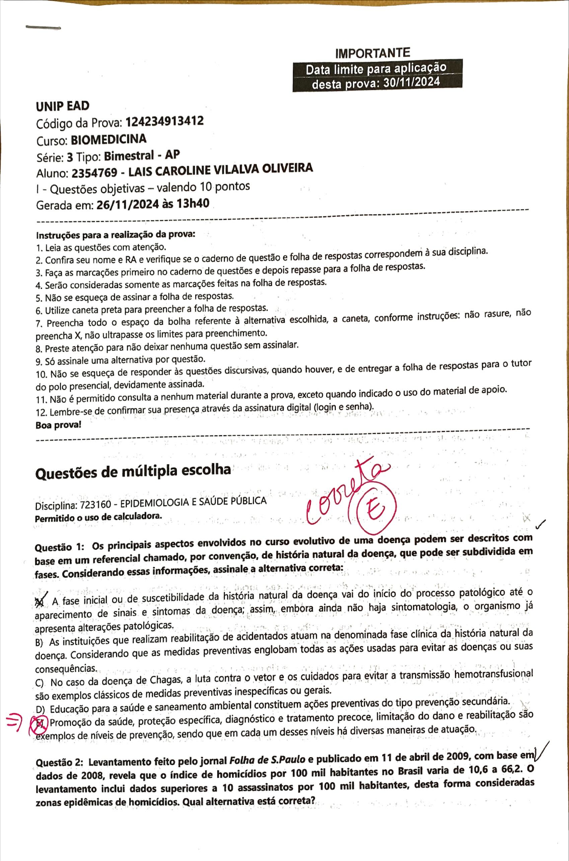 IMPORTANTE Data limite para aplicação desta prova: 30/11/2024 UNIP EAD Código da Prova: 124234913412 Curso: BIOMEDICINA Série: 3 Tipo: Bimestral AP Aluno: 2354769 LAIS CAROLINE VILALVA OLIVEIRA I Questões objetivas valendo 10 pontos Gerada em: 26/11/2024 às 13h40 Instruções para a realização da prova: 1. Leia as questões com atenção. 2. Confira seu nome e RA e verifique se o caderno de questão e folha de respostas correspondem à sua disciplina. 3. Faça as marcações primeiro no caderno de questões e depois repasse para a folha de respostas. 4. Serão consideradas somente as marcações feitas na folha de respostas. 5. Não se esqueça de assinar a folha de respostas. 6. Utilize caneta preta para preencher a folha de respostas. 7. Preencha todo o espaço da bolha referente à alternativa escolhida, a caneta, conforme instruções: não rasure, não preencha X, não ultrapasse os limites para preenchimento. 8. Preste atenção para não deixar nenhuma questão sem assinalar. 9. Só assinale uma alternativa por questão. 10. Não se esqueça de responder às questões discursivas, quando houver, e de entregar a folha de respostas para o tutor do polo presencial, devidamente assinada. 11. Não é permitido consulta a nenhum material durante a prova, exceto quando indicado o uso do material de apoio. 12. Lembre-se de sua presença através da assinatura digital (login e senha). Boa prova! Questões de múltipla escolha Disciplina: 723160 EPIDEMIOLOGIA E SAÚDE PÚBLICA Permitido o uso de calculadora. Questão 1: Os principais aspectos envolvidos no curso evolutivo de uma doença podem ser descritos com base em um referencial chamado, por convenção, de história natural da doença, que pode ser subdividida em fases. Considerando essas informações, assinale a alternativa correta: A fase inicial ou de suscetibilidade da história natural da doença vai do início do processo patológico até o aparecimento de sinais e sintomas da doença; assim, embora ainda não haja sintomatologia, o organismo já apresenta alterações patológicas. B) As instituições que realizam reabilitação de acidentados atuam na denominada fase clínica da história natural da doença. Considerando que as medidas preventivas englobam todas as ações usadas para evitar as doenças ou suas consequências. C) No caso da doença de Chagas, a luta contra o vetor e os cuidados para evitar a transmissão hemotransfusional são exemplos clássicos de medidas preventivas inespecíficas ou gerais. D) Educação para a saúde e saneamento ambiental constituem ações preventivas do tipo prevenção secundária. Promoção da saúde, proteção específica, diagnóstico e tratamento precoce, limitação do dano e reabilitação são exemplos de níveis de prevenção, sendo que em cada um desses níveis há diversas maneiras de atuação. Questão 2: Levantamento feito pelo jornal Folha de S.Paulo e publicado em 11 de abril de 2009, com base em dados de 2008, revela que o índice de homicídios por 100 mil habitantes no Brasil varia de 10,6 a 66,2. o levantamento inclui dados superiores a 10 assassinatos por 100 mil habitantes, desta forma consideradas zonas epidêmicas de homicídios. Qual alternativa está correta?TAXA DE HOMICÍDIOS POR RR AP 100 MIL HABITANTES EM 2008 AM PA AL 66,2 MA CE RN ES 56,2 PB PI PE 51,6 PE AC RJ 45,1 TO RO SE BA 32,8 BA MT RO 30,3 DF MT 30,0 23,7 GO DF 28,0 PR 27,1 MS MG é a taxa média SE 26,9 aproximada de SP MS 25,2 por 100 mil AC 24,3 habitantes do Brasil PR CE 24,2 GO 20,9 SC AM 20,7 RS de 55 a 70 RN 18,7 de 40 a 55 TO 18,0 RS 15,9 de 25 a 40 MA 15,4 de 10 a 25 PB 14,7 Estados que não SP 13,2 divulgaram total SC 13,0 ou parcialmente RR 10,6 seus dados Disponível A) número total de homicídios em 2008 no estado da Paraíba é inferior ao do estado de São Paulo. B) Os estados que não divulgaram os seus dados de homicídios encontram-se na região Centro-Oeste. C) A média aritmética das taxas de homicídios por 100 mil habitantes da região Sul é superior à taxa média aproximada do Brasil. D) A taxa de homicídios por 100 mil habitantes do estado da Bahia, em 2008, supera a do Rio Grande do Norte em mais de Roraima é o estado com menor taxa de homicídios por 100 mil habitantes, não se caracterizando como zona epidêmica de homicídios. Questão 3: o Sistema Único de Saúde (SUS), implantado pela Constituição de 1988, permite a participação popular na gestão da saúde nas diferentes instâncias Os conselhos de saúde na sociedade brasileira fazem parte de um amplo processo de movimentação social e estão previstos institucionalmente, não dependendo, em princípio, da mobilização da população para Contudo, no exercício de suas funções, demandam dos cidadãos, das comunidades e das organizações envolvidas crescente capacidade para atuar politicamente. Um profissional que trabalha com educação e promoção da saúde, deve adotar, como forma de participação popular, o controle social, que: A) É uma estratégia para levar a comunidade a aprovar aquilo que os profissionais em saúde acham importante. B) Refere-se ao produto de um exercício independente da compreensão da realidade local e do reconhecimento das informações disponíveis. Representa uma instância para o povo reconhecer a própria realidade, refletir coletivamente e buscar alternativas de vida. D) Só pode ser legitimado quando há participação de cidadãos com nível educacional superior, por terem mais possibilidades de decisão. E) Exige dos integrantes dos movimentos sociais que fiquem à disposição dos profissionais de saúde nas tentativas de resolução dos problemas Questão 4: Para o cálculo da incidência, conceito epidemiológico fundamental, é necessário:Análise Números de de cura casos de uma doença num intervalo de tempo C) D) Número gasto de para diagnosticar uma doença num intervalo de tempo Tempo novos de uma doença num intervalo de E) Número casos