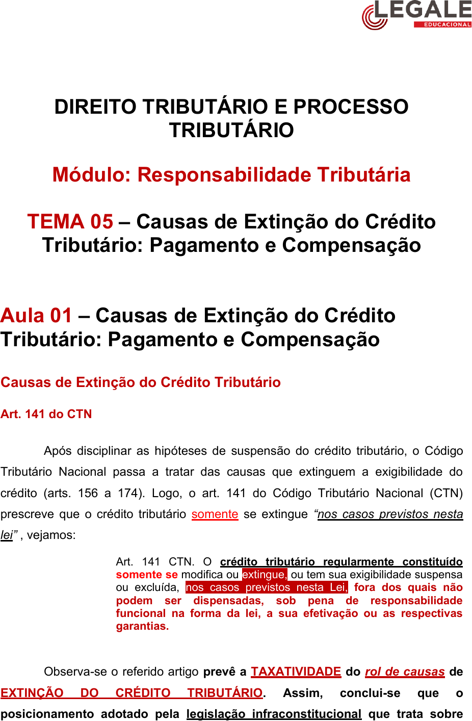 DIREITO TRIBUTÁRIO E PROCESSO TRIBUTÁRIO Módulo: Responsabilidade Tributária TEMA 05 – Causas de Extinção do Crédito Tributário: Pagamento e Compensação Aula 01 – Causas de Extinção do Crédito Tributário: Pagamento e Compensação Causas de Extinção do Crédito Tributário Art. 141 do CTN Após disciplinar as hipóteses de suspensão do crédito tributário, o Código Tributário Nacional passa a tratar das causas que extinguem a exigibilidade do crédito (arts. 156 a 174). Logo, o art. 141 do Código Tributário Nacional (CTN) prescreve que o crédito tributário somente se extingue “nos casos previstos nesta lei” , vejamos: Art. 141 CTN. O crédito tributário regularmente constituído somente se modifica ou extingue, ou tem sua exigibilidade suspensa ou excluída, nos casos previstos nesta Lei, fora dos quais não podem ser dispensadas, sob pena de responsabilidade funcional na forma da lei, a sua efetivação ou as respectivas garantias. Observa-se o referido artigo prevê a TAXATIVIDADE do rol de causas de EXTINÇÃO DO CRÉDITO TRIBUTÁRIO. Assim, conclui-se que o posicionamento adotado pela legislação infraconstitucional que trata sobre KELVIN CARLOS JONASSON - 06536528956 matéria geral em direito tributário, qual seja o Código Tributário Nacional (CTN), é no sentido da TAXATIVIDADE deste rol. Todavia, temos que tomar um certo cuidado, uma vez que o STF já se debruçou sobre o tema na ADI 1917 e na ADI-MC 2045 apresentando visões diferentes em cada uma delas. Na primeira ele falava sobre a taxatividade do rol, já na segunda estatuía a não taxatividade. Vejamos: • STF, ADI 1917 = TAXATIVIDADE • STF, ADI-MC 2045 = NÃO TAXATIVIDADE Sobre esta discussão, o professor Eduardo Sabbag disciplinou: A maioria dos autores consideram a enumeração do art. 156 do CTN taxativa (ou exaustiva), e não meramente exemplificativa. Isso significa que em regra, apenas as modalidades expressamente nela elencadas podem dar ensejo à validade e legitima extinção do crédito tributário, e qualquer acréscimo de outras hipóteses à lista requerer lei complementar da União sobre normas gerais tributárias. Essa também tem sido a orientação disposta em julgados mais recentes do STF1. Já o doutrinador Luciano Amaro entende de forma diversa, acreditando que este rol não seria taxativo, mas EXEMPLIFICATIVO: O rol do art. 156 não é taxativo. Se a lei pode o mais ( que vai até o perdão da dívida tributária) pode também o menos, que é regular outros modos de extinção do dever de pagar o tributo. A dação em pagamento, por exemplo, não figurava naquele rol até ser acrescentado pela LC n. 104/2001; como essa lei só se refere à dação de bens imóveis, a dação de outros bens continua não listada, mas nem por isso se deve considerar banida. Outro exemplo que nem sequer necessita de disciplina específica na legislação tributária, é a confusão, que extingue a obrigação se, na mesma pessoa, se confundem a qualidade de credor e a de devedor (CC/2002, art. 381). Há ainda, a novação (CC/2002, art. 360)2. 1 SABBAG, Eduardo. Manual de Direito Tributário, 13 ed., São Paulo: Saraiva Educação, p.1086. 2 AMARO, Luciano. Direito Tributário brasileiro, 14 ed, p. 390/391. KELVIN CARLOS JONASSON - 06536528956 Hipóteses de Extinção do Crédito Tributário O art. 156 do CTN, apresenta as HIPÓTESES DE EXTINÇÃO DO CRÉDITO TRIBUTÁRIO: Art. 156 CTN. Extinguem o crédito tributário: I - o pagamento; II - a compensação; III - a transação; IV - remissão; V - a prescrição e a decadência VI - a conversão de depósito em renda; VII - o pagamento antecipado e a homologação do lançamento nos termos do disposto no artigo 150 e seus §§ 1º e 4º; VIII - a consignação em pagamento, nos termos do disposto no § 2º do artigo 164; IX - a decisão administrativa irreformável, assim entendida a definitiva na órbita administrativa, que não mais possa ser objeto de ação anulatória; X - a decisão judicial passada em julgado. XI – a dação em pagamento em bens imóveis, na forma e condições estabelecidas em lei. Parágrafo único. A lei disporá quanto aos efeitos da extinção total ou parcial do crédito sobre a ulterior verificação da irregularidade da sua constituição, observado o disposto nos artigos 144 e 149. Para efeitos didáticos, podemos dividir as modalidades extintivas Passemos ao estudo de cada uma das modalidades de extinção do crédito tributário. Em resumo HIPÓTESES DE EXTINÇÃO DO CRÉDITO TRIBUTÁRIO • Pagamento; • Compensação; • Transação; • Remissão; • Prescrição e Decadência; • Pagamento antecipado e a homologação do lançamento nos termos do disposto no art. 150 CTN; • Consignação em pagamento (art. 164, §2º, CTN); • Decisão administrativa irreformável (sem anulatória); • Decisão judicial passada em julgado; • Dação em pagamento de bens imóveis, na forma da lei. KELVIN CARLOS JONASSON - 06536528956 Pagamento A primeira causa de extinção do crédito tributário que estudaremos é o PAGAMENTO, que se encontra presente nos arts. 157 a 164 do Código Tributário Nacional (CTN). O pagamento é a hipótese mais comum de extinção do crédito tributário, que de acordo com o art. 162 do CTN, pode ser efetuado em moeda corrente, cheque, vale postal e, nos casos previstos em lei, em estampilha, em papel selado ou processo mecânico. Estas últimas hipóteses atualmente estão em desuso. Atente-se ao art. 162 do CTN: Art. 162 CTN. O pagamento é efetuado: I - em moeda corrente, cheque ou vale postal; II - nos casos previstos em lei, em estampilha, em papel selado, ou por processo mecânico. § 1º A legislação tributária pode determinar as garantias exigidas para o pagamento por cheque ou vale postal, desde que não o torne impossível ou mais oneroso que o pagamento em moeda corrente. § 2º O crédito pago por cheque somente se considera extinto com o resgate deste 
