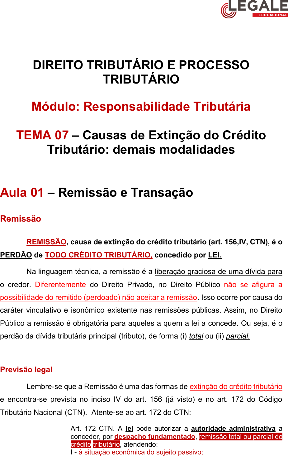 DIREITO TRIBUTÁRIO E PROCESSO TRIBUTÁRIO Módulo: Responsabilidade Tributária TEMA 07 – Causas de Extinção do Crédito Tributário: demais modalidades Aula 01 – Remissão e Transação Remissão REMISSÃO, causa de extinção do crédito tributário (art. 156,IV, CTN), é o PERDÃO de TODO CRÉDITO TRIBUTÁRIO, concedido por LEI. Na linguagem técnica, a remissão é a liberação graciosa de uma dívida para o credor. Diferentemente do Direito Privado, no Direito Público não se afigura a possibilidade do remitido (perdoado) não aceitar a remissão. Isso ocorre por causa do caráter vinculativo e isonômico existente nas remissões públicas. Assim, no Direito Público a remissão é obrigatória para aqueles a quem a lei a concede. Ou seja, é o perdão da dívida tributária principal (tributo), de forma (i) total ou (ii) parcial. Previsão legal Lembre-se que a Remissão é uma das formas de extinção do crédito tributário e encontra-se prevista no inciso IV do art. 156 (já visto) e no art. 172 do Código Tributário Nacional (CTN). Atente-se ao art. 172 do CTN: Art. 172 CTN. A lei pode autorizar a autoridade administrativa a conceder, por despacho fundamentado, remissão total ou parcial do crédito tributário, atendendo: I - à situação econômica do sujeito passivo; KELVIN CARLOS JONASSON - 06536528956 II - ao erro ou ignorância escusáveis do sujeito passivo, quanto a matéria de fato; III - à diminuta importância do crédito tributário; IV - a considerações de equidade, em relação com as características pessoais ou materiais do caso; V - a condições peculiares a determinada região do território da entidade tributante. Parágrafo único. O despacho referido neste artigo não gera direito adquirido, aplicando-se, quando cabível, o disposto no artigo 155. Definição Conforme define Roberto Caparroz: “A remissão é o perdão de todo o crédito tributário, concedido por lei. Difere da anistia, em que só há o perdão das infrações. 1” Já na lição de Regina Helena Costa: “A remissão constitui outra modalidade de extinção da obrigação tributária principal e, tal como no direito privado (arts. 385 a 388, CC), significa perdão2”. Ainda, segundo Alexandre Mazza: “Prevista no art. 172 do CTN, a remissão é o perdão, total ou parcial, da dívida tributária. Trata-se de um raríssimo benefício fiscal que depende sempre de lei específica da entidade competente para instituir o tributo.3” Requisitos ➢ A REMISSÃO possui 2 (dois) REQUISITOS para ser concedida: • LEI ESPECÍFICA; • DESPACHO FUNDAMENTADO DE UMA AUTORIDADE ADMINISTRATIVA COMPETENTE; 1 CAPARROZ, Roberto. Direito tributário esquematizado. Coordenador Pedro Lenza. 3. ed. São Paulo: Saraiva Educação, 2019, p. 725. 2 COSTA, Regina Helena. Curso de direito tributário. 8. ed. São Paulo: Saraiva Educação, 2018, p. 210. 3 MAZZA, Alexandre. Manual de direito tributário. 5. ed. São Paulo: Saraiva Educação, 2019, p. 985) KELVIN CARLOS JONASSON - 06536528956 Consoante explica Rafael Novais: Tratando-se de medida excepcional, o art. 150, § 6º, da Constituição Federal determina a necessidade de lei específica para concessão do benefício, objetivando evitar a existência de desarrazoados desmandos na liberação de créditos públicos4. Segundo Regina Helena Costa, a REMISSÃO está de acordo com o Princípio da Indisponibilidade do Interesse Público se respeitados esses requisitos já apontados: A remissão, nos moldes apontados, respeita ao crédito tributário e somente pode ser concedida por lei, em função do já por tantas vezes lembrado princípio da indisponibilidade do interesse público.5 Hipóteses de Perdão Existem 5 (cinco) HIPÓTESES DE REMISSÃO enumeradas no artigo 172 do CTN: (i) situação econômica do sujeito passivo; (ii) erro ou ignorância escusáveis do sujeito passivo, quanto a matéria de fato ; (iii) diminuta importância do crédito tributário; (iv) considerações de equidade, em relação com as características pessoais ou materiais do caso; e (vi) condições peculiares a determinada região da entidade tributante. Nas palavras de Regina Helena Costa: A remissão pode ser total ou parcial e ter por fundamento uma das cinco hipóteses descritas no art. 172, CTN: 1) situação econômica do sujeito passivo; 2) erro ou ignorância escusáveis do sujeito passivo, quanto a matéria de fato; 3) diminuta importância do crédito tributário; 4) considerações de equidade, em relação com as características pessoais ou materiais do caso; e 5) condições peculiares a determinada região da entidade tributante.6 Passemos agora ao estudo de cada uma das hipóteses de remissão. 4 NOVAIS, Rafael. Direito tributário facilitado. 3. ed. Rio de Janeiro: Forense; São Paulo: Método, 2018, p. 399. 5 COSTA, Regina Helena. Curso de direito tributário. 8. ed. São Paulo: Saraiva Educação, 2018, p. 210. 6 COSTA. Regina Helena. Curso de direito tributário. 8. ed. São Paulo: Saraiva Educação, 2018, p. 210. KELVIN CARLOS JONASSON - 06536528956 • SITUAÇÃO ECONÔMICA DO SUJEITO PASSIVO Trata-se da hipótese do inciso do art. 142 do CTN. A remissão pode ser pessoal, sendo aquela realizada em razão das condições pessoais do devedor contribuinte, podendo ser chamada, neste caso, de remissão “ratione personae”, não havendo, neste caso, considerações relacionadas a dívidas ou ao crédito tributário. • ERRO OU IGNORÂNCIA ESCUSÁVEIS DO SUJEITO PASSIVO QUANTO À MATÉRIA DE FATO Trata-se da hipótese do inciso II do art. 142 CTN. O ato de remitir, de perdoar a dívida, também pode ser formalizado pela autoridade administrativa, após a lei fundamentada em uma das hipóteses do art. 172 do CTN, sendo que uma delas é o erro ou ignorância escusáveis do sujeito passivo com relação à matéria de fato. Trata-se, por exemplo, de erro material em um código de receita diferenciada. • DIMINUTA IMPORTÂNCIA DO CRÉDITO TRIB