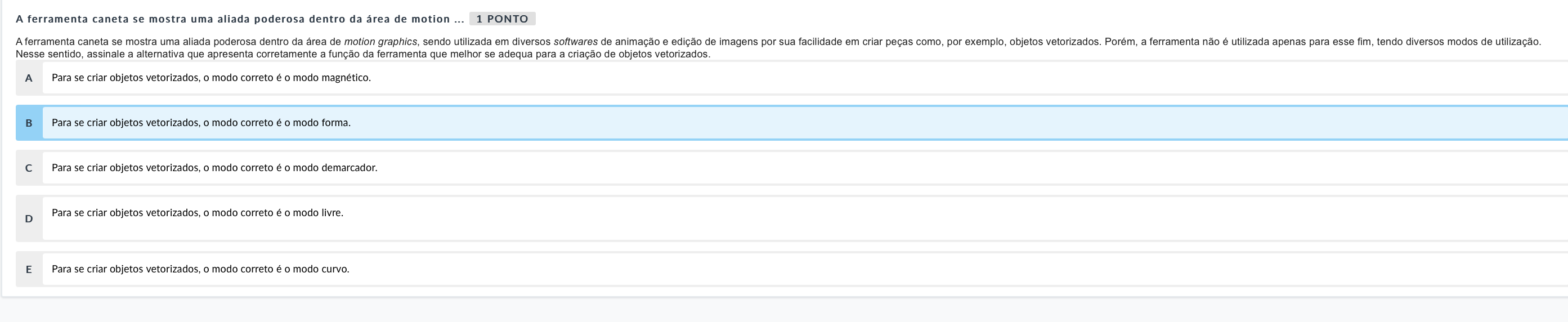 A ferramenta caneta se mostra uma aliada poderosa dentro da área de motion ... 1 PONTO A ferramenta caneta se mostra uma aliada poderosa dentro da área de motion graphics, sendo utilizada em diversos softwares de animação e edição de imagens por sua facilidade em criar peças por exemplo, objetos vetorizados. Porém, a ferramenta não é utilizada apenas para esse fim. tendo diversos modos de utilização. Nesse sentido, assinale a alternativa que apresenta corretamente a função da ferramenta que melhor se adequa para a criação de objetos vetorizados. A Para se criar objetos o modo correto é o modo magnético. B Para se criar objetos vetorizados, o modo correto é o modo forma. C Para se criar objetos vetorizados, o modo correto é o modo demarcador. Para se criar objetos vetorizados, o modo correto é o modo livre. D E Para se criar objetos vetorizados, o modo correto é o modo curvo.
