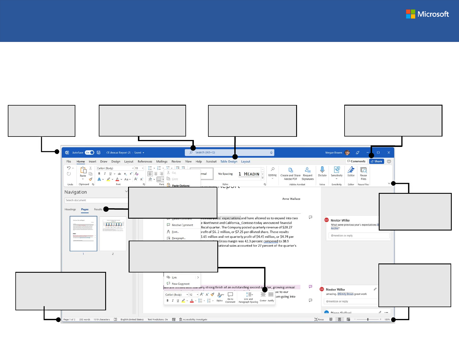 Quick Start Guide New to Word? Use this guide to learn the basics. Save your progress Save your work on OneDrive or SharePoint automatically. Find whatever you need Look up commands from the ribbon, get Help, or search the web. Discover contextual commands Select tables, pictures, or other objects in a document to reveal additional options. Share your work with others Invite other people to view and edit cloud-based documents stored in OneDrive or on SharePoint sites. Navigate with ease Use the sidebar to manage long or complex documents. Word Show or hide the ribbon Select the arrow icon to show or hide the Quick Access Toolbar, and change ribbon settings. Format with the mini toolbar Select or right-click text and objects to quickly format them in place. Status bar shortcuts Select any status bar indicator to navigate your document, view word count statistics, or check your spelling. Change your view Select the status bar buttons to switch between views, or use the slider to magnify the page to your liking. Word Create something Begin with a Blank document to get right to work. Or start with a template to save yourself time and steps. Just select File > New, and then select or search for the template you want. Access files anywhere Need to work on the go and across different devices? Click File > Account to sign in with your Microsoft account and access your recently used files anywhere, on any device, through seamless integration between Office, OneDrive, OneDrive for Business, and SharePoint. Find recent files Whether you only work with files stored on your PC’s local hard drive or you store files in multiple shared locations, selecting File > Open takes you to your recently used documents and any files that you may have pinned to your list. Discover related options When you select objects in your document, options related to your selection will appear. For example, selecting a table displays the Table Design and Layout tabs, which offer additional options. Word Get writing suggestions With Editor, bring out your best writing. Editor helps you bring out your best writing by giving you intelligent writing suggestions. It also calculates an Editor Score based on the number and types of suggestions you have yet to address. Select an underlined word or phrase to accept or ignore a suggestion. Review and track changes Whether you just want to check spelling, keep your word count in check, or fully collaborate with other people, the Review tab has essential commands to track, discuss, and manage all of the changes made to your documents. View who else is typing Co-authoring Word documents that are shared on OneDrive or on a SharePoint site happens in real-time, which means you can easily view where other authors are making changes in the same document that you’re currently working in. Format with styles Styles lets you create, apply, and review the formatting styles in your current document. To open it, select the Home tab, and then select the small arrow in the lower right corner of the Styles gallery. Find whatever you need Type a keyword or phrase into the Search box to quickly find the Word features and ribbon commands you’re looking for, to discover Help content, or to get more information online. Get other Quick Start guides To download our free Quick Start Guides for your other favorite apps, go to https://go.microsoft.com/fwlink/?linkid=2008317. Word Share your work with others To invite others to view or edit your documents, select the Share button in the top right corner of the app window. Then, you can choose to share a link to your document or send invitations directly to specific people. If someone doesn't have Word, they can use the free Word for the Web app to edit and comment. Next steps with Word See what’s new in Office Explore the new and improved features in Word and the other Office apps. Visit https://go.microsoft.com/fwlink/?linkid=871117 for more information. Get free training, tutorials, and videos for Office Ready to dig deeper into the capabilities that Word has to offer? Visit https://go.microsoft.com/fwlink/?linkid=871123 to explore our free training options. Send us your feedback Love Word? Got an idea for improvement to share with us? On the File menu, select Feedback and then follow the prompts to send your suggestions directly to the Word product team. Thank you! Quick Start Guide New to Word? Use this guide to learn the basics. Create something, stay connected, find recent files and discover contextual tools Share your work with others, review and track changes, see who else is typing and format with styles Find whatever you need, get other Quick Start guides, next steps with Word