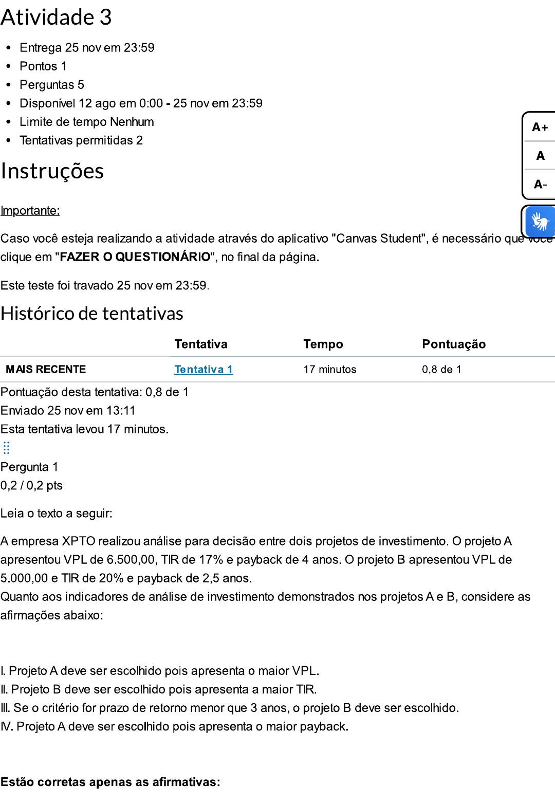 Atividade 3 Entrega 25 nov em 23:59 Pontos 1 Perguntas 5 Disponível 12 ago em 0:00 25 nov em 23:59 Limite de tempo Nenhum A+ Tentativas permitidas 2 A Instruções A- Importante: Caso você esteja realizando a atividade através do aplicativo "Canvas Student", é necessário que clique em "FAZER o QUESTIONÁRIO", no final da página. Este teste foi travado 25 nov em 23:59. Histórico de tentativas Tentativa Tempo Pontuação MAIS RECENTE Tentativa 1 17 minutos 0,8 de 1 Pontuação desta tentativa: 0,8 de 1 Enviado 25 nov em 13:11 Esta tentativa levou 17 minutos. Pergunta 1 0,2 / 0,2 pts Leia o texto a seguir: A empresa XPTO realizou análise para decisão entre dois projetos de investimento. O projeto A apresentou VPL de 6.500,00, TIR de 17% e payback de 4 anos. O projeto B apresentou VPL de 5.000,00 e TIR de 20% e payback de 2,5 anos. Quanto aos indicadores de análise de investimento demonstrados nos projetos A e B, considere as afirmações abaixo: I. Projeto A deve ser escolhido pois apresenta o maior VPL. II. Projeto B deve ser escolhido pois apresenta a maior TIR. III. Se o critério for prazo de retorno menor que 3 anos, o projeto B deve ser escolhido. IV. Projeto A deve ser escolhido pois apresenta o maior payback. Estão corretas apenas as afirmativas:le IV Somente Il Correto! A alternativa está correta, pois apenas as afirmações e III são verdadeiras. A afirmação é verdadeira, pois o projeto com maior VPL deve ser escolhido caso não haja nenhu A+ indicação de priorização de outro critério. A A afirmação III é verdadeira, pois o projeto A apresenta payback acima de 3 anos. Assim, deve-se A- escolher o B que apresenta payback de 2,5 anos. A afirmação Il é falsa, pois o VPL deve ser priorizado em relação a TIR para maximização da riqu A afirmação IV é falsa, pois o menor payback deve ser escolhido - projeto B. I, III e IV IV Pergunta 2 0,2 / 0,2 pts Leia o texto a seguir: "O payback, ou período de payback, é o tempo necessário para que o retorno acumulado de um investimento se iguale ao valor investido. O cálculo básico, também chamado de payback simples, baseia-se apenas na primeira projeção de fluxo de caixa, ao passo que o payback descontado considera as variações do dinheiro ao longo do tempo de acordo com o custo de capital da empresa." Quanto aos indicadores de análise de investimento, considere as afirmações abaixo: I. O payback simples leva em consideração o valor do dinheiro no tempo. II. O VPL não leva em consideração o valor do dinheiro no tempo. III. A TIR é um indicador de retorno sobre o investimento realizado. É correto o que se afirma em: Correto! III, apenas.A alternativa está correta, pois apenas a afirmação III é verdadeira. A afirmação III é verdadeira, a TIR indica a rentabilidade projetada do investimento no período, portanto é um indicador de retorno sobre o investimento. A afirmação é falsa, pois o payback descontado leva em consideração o valor do dinheiro no tempo. A afirmação é falsa, pois o VPL leva em consideração o valor do dinheiro no tempo. Os fluxos de caixa futuros a valor presente por meio de uma taxa de desconto. A+ e III, apenas. A I, apenas. A- le II, apenas. Pergunta 3 0 / pts Leia o texto a seguir: A empresa AH Ltda estuda realizar uma expansão comercial adquirindo novas lojas. O projeto de investimento acusa a projeção dos fluxos de caixa conforme segue: FCO = 500.000 FC1= 150.000 FC3= 170.000 FC4= 180.000 FC5= 160.000 FC = fluxo de caixa Taxa de desconto = 20% Considerando as informações apresentadas, avalie as afirmações abaixo sobre o VPL: - O VPL é positivo, portanto deve-se aceitar o projeto. - O VPL é negativo, portanto deve-se rejeitar o projeto. III - O VPL é negativo, portanto a TIR deve ser menor que a taxa de desconto.IV - O VPL é positivo, portanto a TIR deve ser menor que a taxa de desconto. É correto o que se afirma apenas em: Você respondeu IV A+ A alternativa está incorreta, pois apenas as afirmações e III são verdadeiras. A Aplicando a fórmula A- Obtem-se os VPs: FC1 = 125000 FC2 111111,1 FC 3 = 98379,63 FC 4 = 86805,55 FC 5 = 64300,41 SOMA VPs = 485596,70 VPL = 485.596,7 500.000 = -14403,30 -> VPL NEGATIVO = REJEITAR PROJETO Se o VPL é negativo a TIR deve ser menor que a taxa de desconto. le III III e IV e IV Resposta correta III Pergunta 4 0,2 / 0,2 pts Leia o texto a seguir: "O VPL é um dos métodos mais conhecidos quando o assunto é análise da viabilidade de projetos de investimento. Com o cálculo do Valor Presente Líquido é possível fazer os ajustes, descontando as taxas de juros para obter a verdadeira noção do valor do dinheiro no futuro. [...] O VPL traz ao valor presente um valor futuro. Ele representa a diferença entre os recebimentos e ospagamentos de um projeto de investimento em valores monetários atuais (de hoje). [...] Em finanças, o VPL é amplamente utilizado para planejar investimentos a longo prazo. Como sabemos, um projeto só deve prosseguir se o valor atual de todas as entradas de caixa menos o valor atual de todas as saídas de caixa for maior que zero." (In: CAMARGO, R.F. TREASY: Veja como o Valor Presente Líquido (VPL) ajuda na análise de A+ viabilidade de um investimento, 2017. Disponível em: https://www.treasy.com.br/blog/valor-present liquido-vpl/. A A- Considerando as informações apresentadas, assinale a opção correta. Um projeto de investimento é viável se o VPL deste projeto for igual ao período de payback. Um projeto de investimento é viável se o VPL deste projeto for maior que a TIR. Um projeto de investimento é viável se o VPL deste projeto for maior que 1. Um projeto de investimento é viável se o VPL deste projeto for maior que a taxa de desconto. Correto! Um projeto de investimento é viável se o VPL deste projeto for positivo. A alternativa está correta. O VPL é um indicador essencial para avaliação de projetos de investimento. Um projeto de investimento é viável se o s