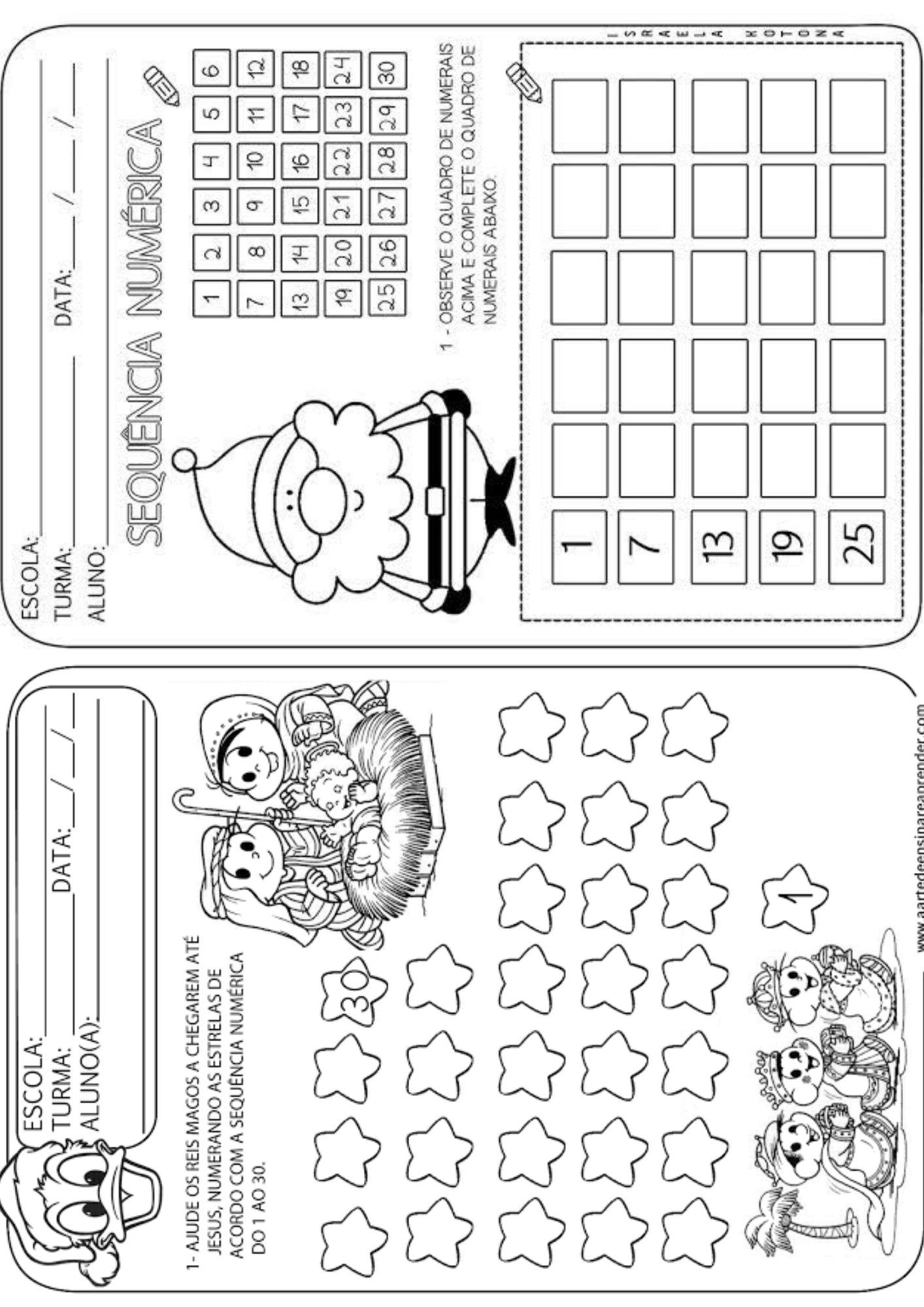 ESCOLA: ESCOLA: TURMA: DATA: / TURMA: DATA: / / ALUNO(A): ALUNO: SEQUENCIA NUMÉRICA 1- - AJUDE os REIS MAGOS A CHEGAREM ATÉ JESUS, NUMERANDO AS ESTRELAS DE 1 2 3 4 5 6 ACORDO COM A SEQUÊNCIA NUMÉRICA DO 1 AO 30. 13 14 15 16 17 18 30 19 20 21 22 23 24 25 26 27 28 29 30 1 - OBSERVE QUADRO DE NUMERAIS ACIMA E COMPLETE QUADRO DE NUMERAIS 1 7 R A 13 1 19 T 0 N 25