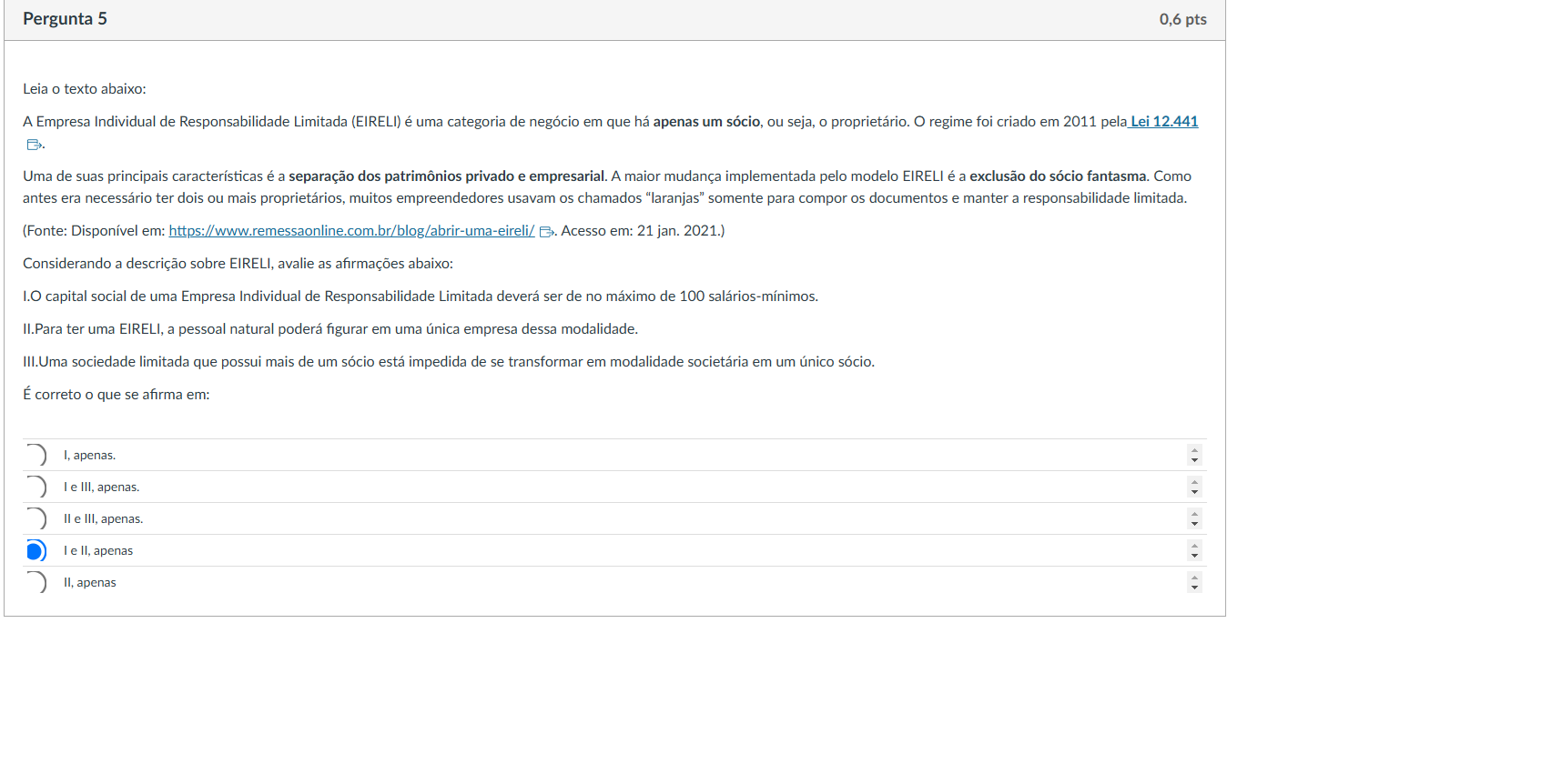 Pergunta 5 0,6 pts Leia o texto abaixo: A Empresa Individual de Responsabilidade Limitada (EIRELI) é uma categoria de negócio em que há apenas um sócio, ou seja, o proprietário. regime foi criado em 2011 pela Lei 12.441 Uma de suas principais características é a separação dos patrimônios privado e empresarial. A maior mudança implementada pelo modelo EIRELI é a exclusão do sócio fantasma. Como antes era necessário ter dois ou mais proprietários, muitos empreendedores usavam os chamados "laranjas" somente para compor os documentos e manter a responsabilidade limitada. (Fonte: Disponível em: https://www.remessaonline.com.br/blog/abrir-uma-eireli Acesso em: 21 jan. 2021.) Considerando a descrição sobre EIRELI, avalie as afirmações abaixo: I.O capital social de uma Empresa Individual de Responsabilidade Limitada deverá ser de no máximo de 100 II.Para ter uma EIRELI, a pessoal natural poderá figurar em uma única empresa dessa modalidade. III.Uma sociedade limitada que possui mais de um sócio está impedida de se transformar em modalidade societária em um único sócio. É correto que se afirma em: I, apenas. e III. apenas. II e III, apenas. e II. apenas II, apenas
