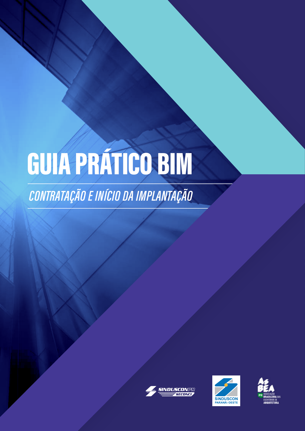 GUIA PRÁTICO BIM CONTRATAÇÃO E INÍCIO DA IMPLANTAÇÃO 2 GUIA PRÁTICO BIM DE CONTRATAÇÃO E IMPLANTAÇÃO SINDICATO DA INDÚSTRIA DA CONSTRUÇÃO CIVIL NO ESTADO DO PARANÁ – SINDUSCON-PR SEDE SOCIAL Rua da Glória, 175 – Centro Cívico 80030 060 | Curitiba, PR, Brasil SEDE ADMINISTRATIVA Rua João Viana Seiler, 116 - Parolin 80220-270 | Curitiba, PR, Brasil (41) 3051 4300 sinduscon@sindusconpr.com.br www.sindusconpr.com.br ASSOCIAÇÃO BRASILEIRA DOS ESCRITÓRIOS DE ARQUITETURA – ASBEA-PR Rua Buenos Aires, 1039 - Água Verde 80250 070 | Curitiba, PR, Brasil (41) 999 373 030 asbea@asbea-pr.org.br www.asbea-pr.org.br REALIZAÇÃO APOIO GUIA PRÁTICO BIM CONTRATAÇÃO E INÍCIO DA IMPLANTAÇÃO 4 PALAVRA DAS PRESIDÊNCIAS O uso do BIM em escritórios de arquitetura vem sendo cada vez mais requisitado nos últimos anos. Quando falamos em grandes projetos então, o BIM já se torna indispensável, pois gera maior controle dos processos, redução de custo no fim da cadeia, maior produtividade e integração entre a equipe. É realmente um caminho sem volta. Sempre de olho no mercado, a AsBEA- PR há muitos anos vem promovendo discussões sobre o BIM através de seus grupos de trabalho e acreditamos que isso tenha estimulado muitos escritórios associados a buscarem a implementação da modelagem em suas empresas. Um diferencial, porém, um fator essencial para a construção atual. Neste ano de 2022, graças ao consolidado relacionamento entre AsBEA-PR e o Sinduscon-PR, reunimos a necessidade de ambas entidades para a criação de um grupo de trabalho interdisciplinar com o objetivo de produzir este Guia prático para contratação e início da implantação do BIM. Leonardo Hauer Presidente da AsBEA-PR O resultado, demonstrado aqui, é uma ferramenta modelo para os associados desenvolverem suas propostas de trabalho alinhadas com a real necessidade de uso do BIM pelos contratantes (construtoras e incorporadoras). O grupo focou em desenvolver algo prático e usual para os dois lados, dirimindo desde o início possíveis discussões sobre os “entregáveis” dos projetos. O passo em conjunto, demonstra que ações integradas realizadas pelo bem de toda uma cadeia produtiva é o que eleva a qualidade das nossas construções, o desenvolvimento do setor e do país como um todo. Agradeço imensamente ao presidente Rodrigo Assis, pela abertura e parceria ao longo de nossas gestões, e claro, aos integrantes do GT associados da AsBEA- PR, Celso Saito (Asset Arquitetura) e Fabi Azevedo (AXAA5 Arquitetura), pela dedicação em tempo e conhecimento, agregando em muito ao produto. Ricardo Lora, Presidente do Sinduscon-Oeste Rodrigo José Assis, Presidente do Sinduscon-PR 5 A indústria da construção sempre foi considerada um importante pilar da economia brasileira. Apesar das turbulências no cenário nacional e internacional, o setor vem apresentando um bom desempenho em 2022 e, segundo especialistas, deve avançar ainda mais nos próximos anos. O otimismo é reflexo do incremento das atividades, seguido pela confiança do empresariado, pela redução nas projeções para a inflação nacional e pelas novas medidas adotadas para o programa de habitação de interesse social do Governo Federal. Um volume maior de obras deve gerar novas oportunidades de negócios para construtoras, incorporadoras e prestadoras de serviços em todo o Paraná, não apenas no segmento residencial, mas também em obras comerciais, industriais, corporativas, obras públicas e de infraestrutura. Detalhe: não estamos falando em empilhar tijolos. Neste mercado competitivo, ser mais eficiente é uma questão de sobrevivência. Cada vez mais vêm surgindo inovações e novas soluções para otimizar processos, planejamento e execução de obras. Por isso, nós do Sinduscon-PR, do Sinduscon-PR Oeste e da AsBEA-PR criamos um Grupo Técnico composto por arquitetos, urbanistas e engenheiros, para desenvolver este Guia Prático do BIM (Building Information Modeling) ou Modelagem da Informação da Construção. Temos acompanhado a evolução do BIM no Brasil há muito tempo e acreditamos que esta metodologia de trabalho permite que as empresas melhorem a qualidade técnica e a gestão de seus empreendimentos, agregando aumento de produtividade e, no caso de obras públicas, maior transparência. Tudo isso, sem trazer riscos para suas operações. Por meio do GT, buscamos soluções para as principais dores enfrentadas pelos diferentes profissionais que atuam com BIM, em todas as etapas, desde a fase de planejamento até a execução e pós-obra. Promovemos vários webinars sobre o tema e todo este conteúdo está disponível no canal do Youtube do Sinduscon-PR. Neste Guia, bem didático e prático, construtoras e incorporadoras de todos os portes podem conferir as principais vantagens de utilizar o BIM, como começar, quais os primeiros passos, os cuidados necessários, quais são as principais dificuldades nos escopos de contrato entre contratante e contratado, dentre tantas outras questões. Enfim, gostaríamos de agradecer o envolvimento de todos os parceiros neste projeto: Sebrae-PR, FIEP, Senai-PR, e BIM Fórum Brasil. Certamente este é apenas o começo de um trabalho conjunto que terá continuidade e irá realizar uma série de novas ações para contribuir com a evolução e fortalecimento das empresas, e com o crescimento sustentável do setor, beneficiando a sociedade como um todo. 2. QUEM SE BENEFICIA COM O USO DO BIM 3. PORQUE CONTRATAR/USAR MODELAGEM BIM 4. COMO COMEÇAR A IMPLANTAÇÃO CONDICIONANTES MÍNIMOS A. Objetivos B. Fluxos de processos BIM Mandate Plano de Implementaçao BIM (PIB / BIP) C. Pessoas D. Infraestrutura COMO FAZER A. Prazo/Investimento B. Estrutura interna Terceirização BIM Professionals PALAVRA DAS PRESIDÊNCIAS INTRODUÇÃO GT BIM NA PRÁTICA O QUE É INTEGRANTES OBJETIVO Guia prático para contratação e início da implantação do BIM 1. VISÃO MACRO DO BIM VOLUME DE INFORMA