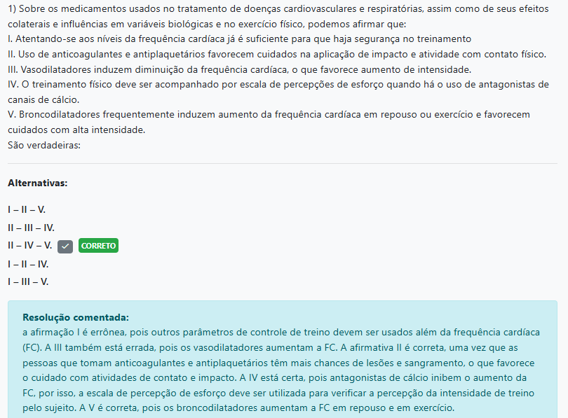 1) Sobre os medicamentos usados no tratamento de doenças cardiovasculares e respiratórias, assim como de seus efeitos colaterais e influências em variáveis biológicas e no exercício físico, podemos afirmar que: I. Atentando-se aos níveis da frequência cardíaca já é suficiente para que haja segurança no treinamento II. Uso de anticoagulantes e antiplaquetários favorecem cuidados na aplicação de impacto e atividade com contato físico. III. Vasodilatadores induzem diminuição da frequência O que favorece aumento de IV. treinamento físico deve ser acompanhado por escala de percepções de esforço quando há uso de antagonistas de canais de cálcio. V. Broncodilatadores frequentemente induzem aumento da frequência cardíaca em repouso ou exercício e favorecem cuidados com alta São verdadeiras: Alternativas: - II - III - IV. II - IV V. CORRETO I II - IV. Resolução comentada: a afirmação é errônea, pois outros parâmetros de controle de treino devem ser usados além da frequência cardíaca (FC). A III também está errada, pois os vasodilatadores aumentam a FC. A afirmativa II é correta, uma vez que as pessoas que tomam anticoagulantes e antiplaquetários têm mais chances de lesões e sangramento, que favorece cuidado com atividades de contato e impacto. A IV está certa, pois antagonistas de cálcio inibem aumento da FC, por isso, a escala de percepção de esforço deve ser utilizada para verificar a percepção da intensidade de treino pelo sujeito. A é correta, pois os broncodilatadores aumentam a FC em repouso e em exercício.