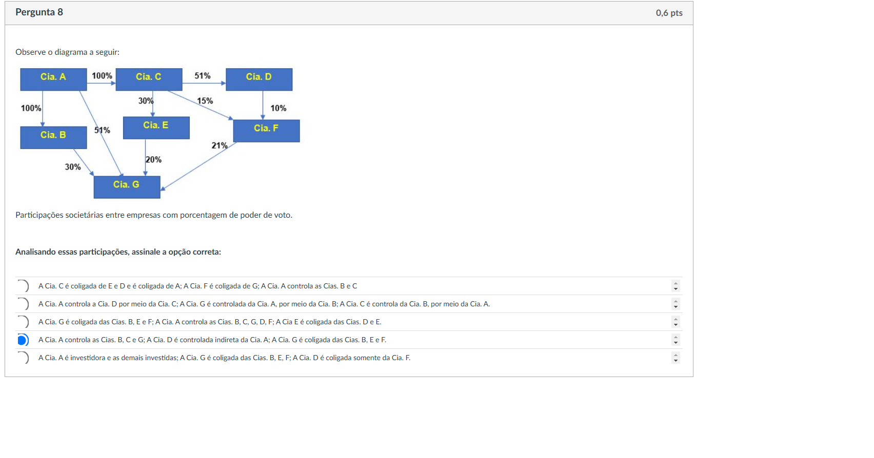 Pergunta 8 0,6 pts Observe o diagrama a seguir: Cia. A 100% Cia. C 51% Cia. D 30% 15% 100% 10% Cia. E 51% Cia. F Cia. 21% 20% 30% Cia. G Participações societárias entre empresas com porcentagem de poder de voto. Analisando essas participações, assinale a opção correta: A Cia. é coligada de E e D e é coligada de A: A Fé coligada de G: A A controla as Cias. B e A Cia. A controla a Cia. D por meio da Cia. C: A G é controlada da A, por meio da A é controla da Cia. B. por meio da Cia. A. A Cia. G é coligada das B, E e F: A Cia. A controla as B. G. F: A Cia coligada das D e E. A Cia. A controla as Cias. B, Ce G; A D é controlada indireta da A; A G é coligada das Cias. F. A Cia. A é investidora e as demais investidas: A G é coligada das F: A Cia. D é coligada somente da Cia. F.