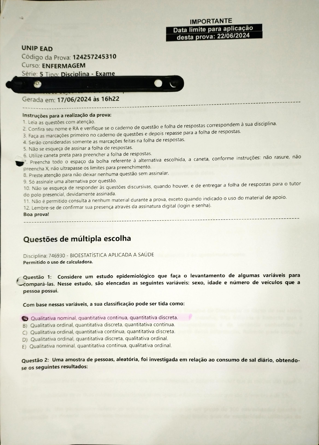 UNIP EAD Código da Prova: 124257245310 Curso:ENFERMAGEM Serie: 5 Tipo: Disciplina - Exame IMPORTANTE Data limite para aplicação desta prova: 22/06/2024 Gerada em: 17/06/2024 às 16h22 Instruções para a realização da prova: 1. Leia as questões com atenção. 2.Confira seu nome e RAe verifique se o caderno de guestão e folha de respostas correspondem à sua disciplina. 3. Faça as marcações primeiro no caderno de questões e depois repasse para a folha de respostas. 4.Ser�o consideradas somente as marcações feitas na folha de respostas. 5. Não se esqueça de assinar a folha de respostas. 6. Utilize caneta preta para preencher a folha de respostas. Preencha todo o espaço da bolha referente à alternativa escolhida, a caneta, conforme instruÇões: não rasure, não preencha X, não ultrapasse os limites para preenchimento. 8. Preste atenção para não deixar nenhuma questãosem assinalar. 9. Sóassinale uma alternativa por questão. 10. Não se esqueça de responder às questões discursivas, quando houver, e de entregar a folha de respostas para o tutor do polo presencial, devidamente assinada. 11. Não épermitido consulta a nenhum material durante a prova, exceto quando indicado o uso do material de apoio. 12. Lembre-sede confirmar sua presença através da assinatura digital (login e senha). Boa prova! Questões de múltipla escolha Disciplina: 746930 - BIOESTAT�STICA APLICADA A SAÚDE Permitido o uso de calculadora. Questão 1: Considere um estudo epidemiológico que faça o levantamento de algumas variáveis para tompará-las. Nesse estudo, são elencadas as seguintes variáveis: sexo, idade e número de veiculos que a pessoa possui. Com base nessas variáveis, a sua classificação pode ser tida como: G Qualitativa nominal,quantitativa continua, quantitativa discreta. B) Qualitativa ordinal, quantitativa discreta, quantitativa continua. o Qualitativa ordinal, quantitativa contínua, quantitativa discreta. D)Qualitativa ordinal, quantitativa discreta, qualitativa ordinal. E) Qualitativa nominal,quantitativa contínua, qualitativa ordinal. Ouestão 2: Uma amostra de pessoas, aleatória, foi investigadaem relação ao consumo de sal diário, obtendo se os seguintes resultados: Individuo A C Consumo Lg). 10 13 17 E F 8 11 13 7 Determine oconsumomédio emediano, respectivamente, dessa amostra: A) 11: 10. B) 11; 10,5. X 10; 11. D) 10,5; 11. E) 11; 10. Questão 3: Oquadro a seguir apresenta a idade de pacientes que estiveram no atendimento de emergência do Hospital Geral em um certo dia, bem como a respectivaquantidade deles. Idade (anos) 20 21 22 23 24 Quantidade de Pacientes 1 5 15 7 De acordo com as informações, a variância dos dados da amostra é de aproximadamente: A) 4,50 B) 0,85 C) 3,78 D 1,55 E) 3,05 Questão 4: Rita é professora de estatística e estáorientando o Trabalho de Conclusão de Curso de seu alunoRoberto. Em uma reunião, para dar prosseguimento ao referido trabalho, Rita informa a Roberto que adiferença entre duas médias amostrais, de populações independentes e de variância conhecidas, éestatisticamente significativa ao nível de significância 5%. A partir dessa informação, Roberto pode concluirque: A) Aprobabilidadede as duas médias populacionais serem diferentes é igual a 95%. B) Aprobabilidadede as duas médias populacionaisserem diferentes é de 5%.A probabilidadede as duas médias populacionaisserem iguais, e Roberto concluir que as médias são diferentes éde 95%. D Aprobabilidade de as duas médias populacionais serem diferentes, e Roberto concluir que as médias são iguais éde 95%. E) Aprobabilidadede as duas médias populacionais serem iguais, e Roberto concluir que são diferentes é de 5%. Ouuestão 5: Um pesquisador coletou as seguintes informações de um grupo de 300 entrevistados quanto àrevencãode doenças sexualmente transmissíveis (DSTs): gênero; idade; grau de escolaridade; utilização de preservativos (sim/não). Como podemos classificar as variáveis coletadas pelo pesquisador? A) Nominal, contínua, ordinal e nominal. B) Nominal, discreta, nominal e ordinal. C) Discreta, nominal,discreta e nominal. Continua, discreta, ordinal e nominal. E) Nominal, continua, discreta e ordinal. Questão 6: Dos aparelhos respiratórios, utilizados por mergulhadores, 90% possui funcionamento adequado. Um fabricante de outra marca de aparelhos respiratórios afirma que a porcentagem de seus aparelhos com Tuncionamento adequado émaior que 90%. Então,a hipótese nula (Ho)e a alternativa (H,)são: A) Ho:p >= 0,90 /H:p 0,90 D) Ho: p = 0,90 /H:p #0,90 Ho:p # 0,90/ H;:p = 0,90 Questão 7: (Enem2017 - Adaptado) Cinco regiões de um país estão buscando recursos no Governo Federal a fim de diminuir a taxa de desemprego de suapopulação. Para decidir qual região receberia o recurso,foram colhidas as taxas de desemprego, em porcentagem, dos últimos três anos. Os dados estão apresentados na tabela a seguir. Taxade desemprego (%) Região A Regiäo B Regiäo C Região D Região E Ano l 12,1 12.5 12.8 11,6 82 Ano Il 11,7 10.5 10.9 9.5 12,6 Ano Ill 12,0 11.6 12,7 12,8 12.9 Ficou decidido que a região contemplada com a maior parte do recurso seria aquela com a maior mediana das taxas de desemprego dos últimos três anos. Determine qual região que deve receber a maior parte do recurso. A) Região A. B) Região B. Região C. D) Regi�o D. E) Regi�o E. Questão 8: Um saco contém 8 bolas idênticas, mas com cores diferentes:três bolas azuis, quatro vermelhas e uma amarela. Retira-se ao acaso uma bola.Qual a probabilidade de a bola retirada ser azul? 37,5%. B) 73,5%. C) 3,75%. D) 5,73%. E) 25%. Questão 9: O diretor de uma escola convidou os 280 alunos de terceiro ano a participarem de uma brincadeira. Suponhaque existem 5 objetos e 6 personagens em uma casa de 9cômodos; um dos personagens esconde um dos objetos em um dos cômodos da casa. o objetivo da brincadeira é adivinhar qual objeto foi escondido por qual personagem e em 