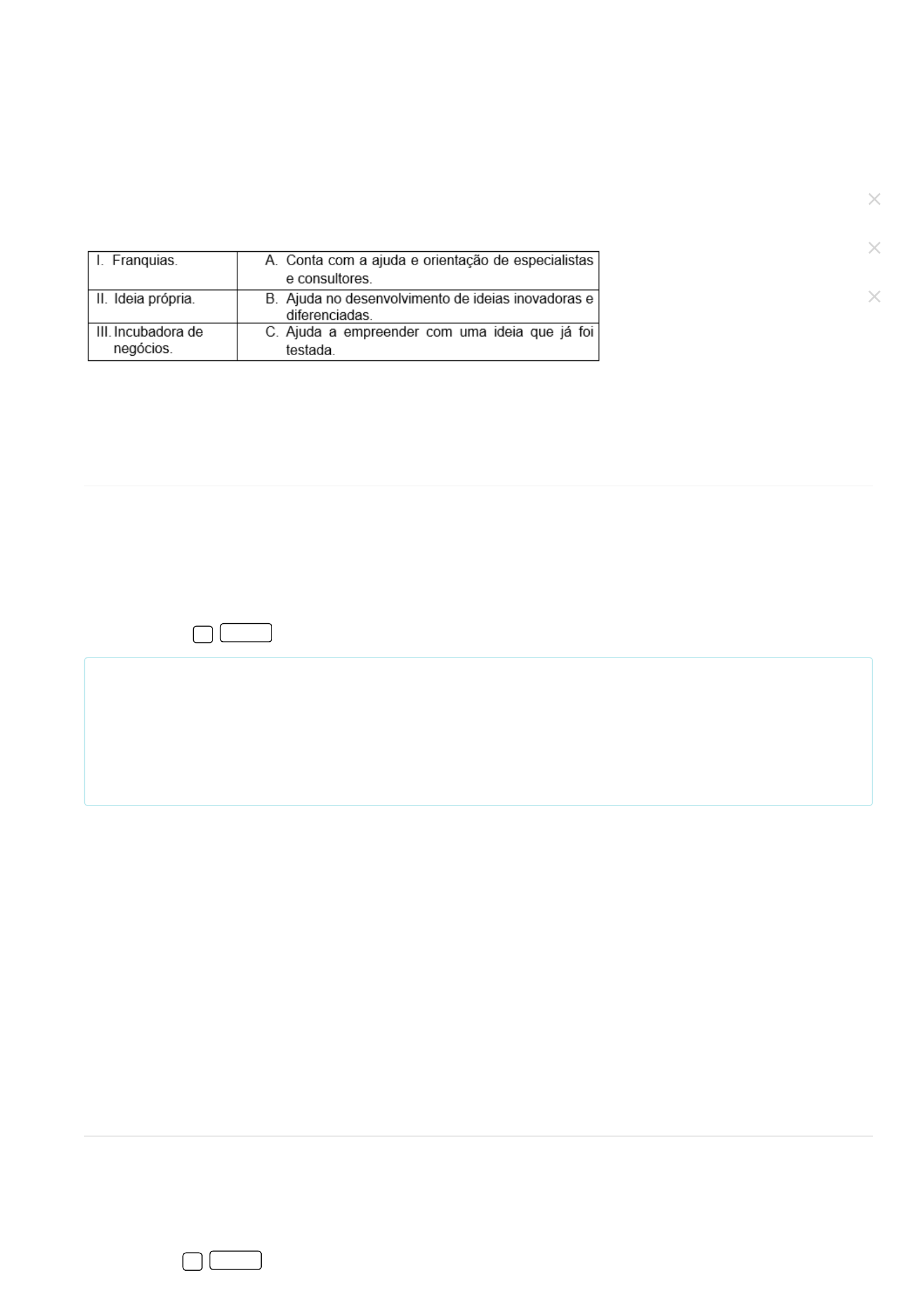 Empreendedorismo Professor(a): Thaís Cereda Ravasi (Mestrado acadêmico) 1) 2) Prepare-se! Chegou a hora de você testar o conhecimento adquirido nesta disciplina. A Avaliação Virtual (AV) é composta por questões objetivas e corresponde a 100% da média final. Você tem até cinco tentativas para “Enviar” as questões, que são automaticamente corrigidas. Você pode responder as questões consultando o material de estudos, mas lembre-se de cumprir o prazo estabelecido. Boa prova! O empreendedor pode começar seu negócio próprio apenas com uma ideia sua, pode participar de uma incubadora de negócios e pode se tornar um franqueado. Leia as afirmativas a seguir e associe as duas colunas conforme as formas de empreender e suas funções: Início da descrição. O quadro é formado por duas colunas e três linhas. A primeira coluna traz três opções: 1. Franquias; 2. Ideia própria; e 3. Incubadora de negócios. A segunda coluna traz também três opções: A. Conta com a ajuda e orientação de especialistas e consultores; B. Ajuda no desenvolvimento de ideias inovadoras e diferenciadas; e C. Ajuda a empreender com uma ideia que já foi testada. Fim da descrição. Assinale a alternativa que traz a associação correta entre as colunas. Alternativas: I – A; II – B; III – C. I – B; II – A; III – C. I – A; II – C; III – B. I – C; II – B; III – A. I – C; II – A; III – B. CORRETO Código da questão: 73346 Sobre plano de negócios, analise as afirmativas a seguir e assinale-as com V (verdadeiro) ou F (falso): ( ) Possui uma estrutura que não permite mudanças. ( ) Pode variar de acordo com o tipo de negócio. ( ) O sumário simples substitui o sumário executivo. ( ) O plano de marketing faz parte do plano de negócios. ( ) Há necessidade de projeções financeiras. Assinale a alternativa que contenha a sequência correta. Alternativas: V – V – V – F – F. V – F – V – F – V. F – F – V – V – F. F – V – F – V – V. CORRETO V – F – V – V – F. Resolução comentada: Basicamente, o empreendedor pode começar seu negócio próprio apenas com a ajuda e orientação de especialistas e consultores. Além disso, pode participar de uma incubadora de negócios, caso sua ideia seja inovadora e diferenciada. E, ainda, pode se tornar um franqueado, para os que empreenderão com uma ideia que já foi testada. Avaliação enviada com sucesso Avaliação enviada com sucesso Avaliação enviada com sucesso 12/3/24, 11:25 AM Cosmos · Cosmos https://kroton.platosedu.io/lms/m/aluno/disciplina/index/3480054/12329496 1/6 3) 4) Código da questão: 73326 Existe uma certa confusão entre os termos responsabilidade social, empreendedorismo privado e empreendedorismo social. Leia as afirmativas a seguir e associe as duas colunas conforme as semelhanças e diferenças entre esses termos: Início da descrição. O quadro é formado por duas colunas e três linhas. A primeira coluna traz três opções: 1. Atuação individual; 2. Atuação coletiva; e 3. Ações planejadas. A segunda coluna traz também três opções: A. No empreendedorismo social, o foco é agir coletivamente; B. A responsabilidade social é um conjunto de ações planejadas para a coletividade; e C. O foco do empreendedorismo privado é produzir bens e serviços. Fim da descrição. Assinale a alternativa que traz a associação correta entre as colunas. Alternativas: I – A; II – B; III – C. I – C; II – A; III – B. CORRETO I – B; II – A; III – C. I – C; II – B; III – A. I – A; II – C; III – B. Código da questão: 73297 João e Mateus são primos e apaixonados por tecnologia desde crianças. João terminou a graduação em Física, e Mateus, em Engenharia Química. Após perceberem que existia uma lacuna no fornecimento de programas operacionais para a indústria química, os primos decidiram empreender, e a primeira coisa que veio à mente foi: por onde começar? João foi até um escritório de contabilidade para saber mais sobre a abertura de uma empresa, enquanto Mateus ficou desenvolvendo os produtos que a empresa ofereceria. A mãe de João o aconselhou a procurar seu tio, que era um grande investidor. Ao agendar a reunião com o tio, foi solicitado o plano de negócios. João tinha tudo em sua mente e nada no papel, então, devido à urgência, começou a rascunhar o plano de negócios, colocando as informações que ele achava importantes. Na reunião, ele apresentou o documento, um pouco confuso e com informações faltando, principalmente, as projeções. O investimento foi negado por falta de informações. No dia seguinte, João procurou o Sebrae para compreender melhor sobre o plano de negócios e como fazer de forma assertiva. Sobre o plano de negócios, analise as afirmativas a seguir: I. A necessidade de constar as projeções em um plano de negócios é nula. Resolução comentada: A segunda, a quarta e a quinta afirmativas são verdadeiras. Veja a forma correta das afirmativas falsas: Primeira afirmativa: não existe uma estrutura fixa, e sim uma estrutura básica, mas que pode variar de acordo com o tamanho e o tipo do negócio. Terceira afirmativa: não, pois são coisas diferentes. Resolução comentada: Existe uma certa confusão com os termos responsabilidade social, empreendedorismo privado e empreendedorismo social. A responsabilidade social é um conjunto de ações planejadas, e o empreendedorismo privado é algo voltado ao lucro e sua ação é individual, enquanto o empreendedorismo social é coletivo. O foco do empreendedorismo privado é produzir bens e serviços, enquanto o foco do empreendedorismo social é agir coletivamente na busca de soluções para problemas sociais, por meio da produção de bens e serviços para a comunidade. Avaliação enviada com sucesso Avaliação enviada com sucesso Avaliação enviada com sucesso 12/3/24, 11:25 AM Cosmos · Cosmos https://kroton.platosedu.io/lms/m/aluno/disciplin