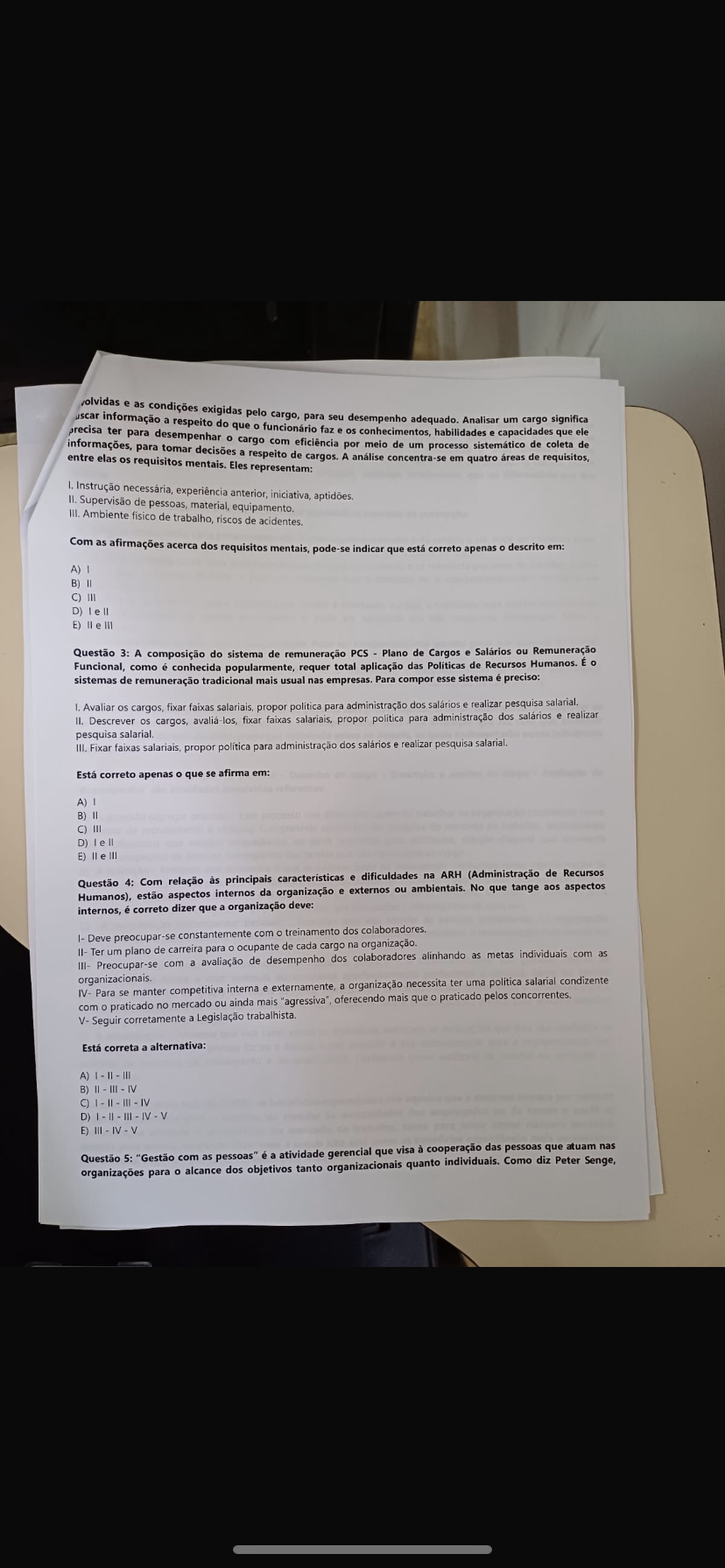 ter a respeito do que funcionário faz e os conhecimentos, habilidades e capacidades que ele informação e as condições exigidas pelo cargo, para seu desempenho adequado. Analisar um cargo significa para desempenhar o cargo com eficiência por meio de um processo de coleta de informações, para tomar decisões a respeito de cargos. A concentra-se em quatro áreas de requisitos, entre elas os requisitos Eles representam: Instrução experiência anterior, iniciativa, II. Supervisão de pessoas, III. Ambiente de trabalho, riscos de Com as afirmações acerca dos requisitos mentais, pode-se indicar que está correto apenas descrito em: A) I B) C) III D) Questão 3: A composição do sistema de remuneração PCS Plano de Cargos e Salários ou Remuneração Funcional, como é conhecida popularmente, requer total aplicação das Políticas de Recursos Humanos. É o sistemas de remuneração tradicional mais usual nas empresas. Para compor esse sistema é preciso: 1. Avaliar os cargos, fixar faixas salariais, propor politica para administração dos salários e realizar pesquisa salarial. Descrever os cargos, fixar faixas salariais, propor para administração dos salários e realizar pesquisa III. Fixar faixas salariais, propor política para administração dos salários e realizar pesquisa salarial. Esta correto apenas o que se afirma em: A) B) C) E) Questão 4: Com relação às principais e dificuldades na ARH (Administração de Recursos Humanos), estão aspectos internos da organização e externos ou ambientais. No que tange aos aspectos internos, é correto dizer que a organização deve: Deve preocupar-se constantemente com treinamento dos colaboradores. II- Ter um plano de carreira para ocupante de cada cargo na organização. III- Preocupar-se com a avaliação de desempenho dos colaboradores alinhando as metas individuais com as organizacionais. IV- Para se manter competitiva interna e externamente, a organização necessita ter uma política salarial condizente com praticado no mercado ou ainda mais oferecendo mais que praticado pelos V- Seguir corretamente a Legislação correta a alternativa: A) III B) III IV C) III IV D) III IV V Questão 5: "Gestão com as é a atividade gerencial que visa à cooperação das pessoas que atuam nas organizações para o alcance dos objetivos tanto organizacionais quanto individuais. Como diz Peter Senge,