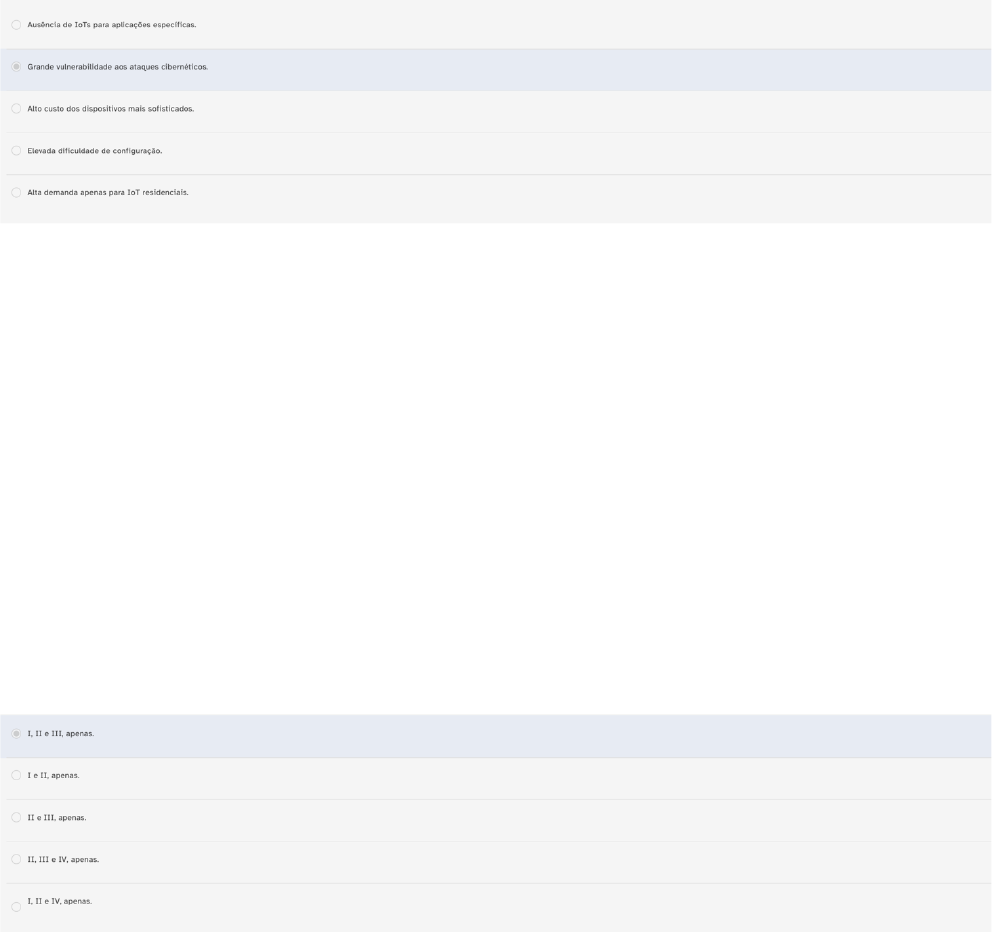 1/5 Prova N2 01 - Leia o fragmento a seguir: “Singer (2002) acredita que outra possível origem do termo Internet das Coisas pode ser encontrada na publicação do artigo “When Things Start to Think” de Neil Gershenfeld (1999). Ainda de acordo com a autora, o primeiro eletrodomés- tico inteligente foi uma geladeira, lançada pela LG em 2002, que permitia conexão com a internet, poderia ser usada para refrigerar alimentos e, também, para navegar na internet, fazer compras, acessar agendas, ver TV ou ouvir rádio. Já em 2003, a tecnologia foi apontada como uma dentre as dez tecnologias que poderiam mudar o mundo”. GALEGALE, G. P. et al. Internet das Coisas aplicada a negócios: um estudo bibliométrico. Journal of Information Systems and Technology Management, v. 13, n. 3, p. 423-438, 2016. Assinale a alternativa que expressa corretamente o maior problema da IoT. 02 - Todo circuito elétrico e componente elétrico, devido às suas geometrias construtivas e efeitos de campos magnéticos externos, podem sempre ser representados por circuitos ideais com não idealidades adicionadas. Essas não idealidades são resistores, capacitores e indutores que são calculados para simular os circuitos reais e, assim, permitir que análises mais detalhadas possam ser feitas. Diante do exposto, analise as afirmativas a seguir. I. A tensão sobre um resistor é diretamente proporcional ao produto da resistência pela corrente que flui por ele. II. A tensão sobre um indutor é diretamente proporcional ao produto da indutância pela taxa de variação da corrente. III. A corrente sobre um capacitor é diretamente proporcional ao produto da capacitância pela taxa de variação da tensão aplicada sobre ele. IV. Os resistores, capacitores e indutores atuam da mesma forma em circuitos CC e CA. Está correto o que se afirma em: 2/5 03 - A NBR 5410 (2008), considerando a importância das tomadas nas residências modernas e visando a uma melhor ade- quação e proteção aos usuários, dividiu esse elemento em duas classes: as Tomadas de Uso Geral (TUG) e as Tomadas de Uso Exclusivo (TUE). As TUGs podem receber equipamentos que seriam ligados às TUEs, mas o inverso não pode ocorrer. ABNT - ASSOCIAÇÃO BRASILEIRA DE NORMAS TÉCNICAS. NBR 5410: instalações elétricas de baixa tensão. Rio de Janeiro: ABNT, 2008. Disponível em: https://aee.net.br/cftv/wp-content/uploads/2017/10/NBR-5410-2008- Instala%C3%A7%C3%B5es-El%C3%A9tricas-de-Baixa-Tens%C3%A3o-atual.pdf. Acesso em: 9 jun. 2021. Com base na NBR 5410, assinale a alternativa que apresenta corretamente o que diferencia uma TUE de uma TUG. 04 - Para aqueles que ainda sustentam que os vírus de computador são uma lenda e não acreditam na importância da segurança da informação, cabe um forte aviso: invasões de sistemas são reais. Diante do ecossistema fornecido pela IoT, um invasor pode controlar tudo o que estiver ligado à Internet. Para evitar essa problemática, diversas medidas estão sendo constantemente implementadas. Sobre as propostas voltadas ao melhoramento da segurança em IoT, analise as afirmativas a seguir. I. Introdução da certificação obrigatória de dispositivos projetados para conexão à Internet. II. Instalação de chips unificados especiais nos dispositivos. III. Utilização de rede cabeada para interconexão dos IoT. IV. Utilização de redes isoladas de IoTs sem acesso à Internet. Está correto o que se afirma em: 05 - Muitas empresas usam plataformas de Business Intelligence (BI) e ferramentas de manufatura inteligente (EMI). Agora, graças à IoT, a manufatura pode utilizar análises avançadas, a Inteligência Artificial (IA) e o aprendizado de máquina para fazer o gerenciamento operacional proativo e a tomada de decisão. Isso torna a IoT uma ferramenta estratégica que melhora o desempenho da produção e permite que sejam despontadas indústrias ainda mais econômicas, flexíveis e https://aee.net.br/cftv/wp-content/uploads/2017/10/NBR-5410-2008-Instala%C3%A7%C3%B5es-El%C3%A9tricas-de-Baixa-Tens%C3%A3o-atual.pdf https://aee.net.br/cftv/wp-content/uploads/2017/10/NBR-5410-2008-Instala%C3%A7%C3%B5es-El%C3%A9tricas-de-Baixa-Tens%C3%A3o-atual.pdf 3/5 eficientes do que as existentes. Considerando o conteúdo apresentado no enunciado, analise as asserções a seguir e a relação proposta entre elas. I. As soluções IoT podem aumentar a eficiência da produção várias vezes. Além disso, o período de retorno dos projetos, na maioria dos casos, não excede vários meses. Pois: II. Nos próximos anos, as redes de sensores com fio serão expandidas e complementadas com redes sem fio, o que ampli- ará significativamente as áreas de aplicação dos sistemas de monitoramento e de controle nas empresas. Assinale a alternativa correta. 06 - Leia o trecho a seguir: A composição completa de um projeto de eletricista para uma residência é feita não apenas por um, mas por vários docu- mentos, contendo diagramas, especificações de equipamentos, cálculos, justificativas de decisões de projeto, legendas para situações específicas etc. Locais com condições ainda mais especiais, como uma casa de campo, em local remoto, ainda exigem do projeto um maior nível de detalhamento, sendo obrigatórias algumas partes. A respeito dos elementos presentes nos projetos elétricos, analise as afirmativas a seguir e assinale V para a(s) verdadeira(s) e F para a(s) falsa(s). I. ( ) Diagrama Elétrico Unifilar de todos os circuitos, das cargas até o quadro geral. II. ( ) Esquema de ligação dos equipamentos de geração de energia autônomos. III. ( ) Planta baixa da residência, com pelo menos dois cortes e indicação de pilares. IV. ( ) Memorial de Cálculo, contendo os valores principais para caracterizar os circuitos. Assinale a alternativa que apresenta a sequência correta: 4/5 07 - As diversas substâncias existentes na natureza ou criadas pelo homem podem ser classificadas de acordo com seu comportamento frent