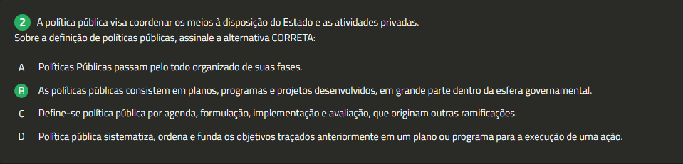 2 A política pública visa coordenar os meios à disposição do Estado e as atividades privadas. Sobre a definição de políticas públicas, assinale a alternativa CORRETA: A Políticas Públicas passam pelo todo organizado de suas fases. B As políticas públicas consistem em planos, programas e projetos desenvolvidos, em grande parte dentro da esfera governamental. Define-se pública por agenda, formulação, implementação e avaliação, que originam outras ramificações. D Política pública sistematiza, ordena e funda os objetivos traçados anteriormente em um plano ou programa para a execução de uma ação.