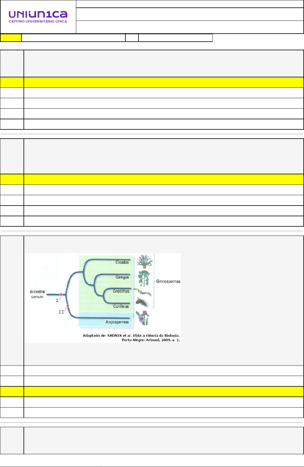03/12/2024 19:49:14 1/2 REVISÃO DE SIMULADO Nome: ANTÔNIO LOURENÇO DA SILVA FILHO Disciplina: Fundamentos de Botânica Respostas corretas são marcadas em amarelo X Respostas marcardas por você. Questão 001 (FUVEST 2017) Assinale a alternativa que ordena corretamente três novidades evolutivas, de acordo com o seu surgimento no processo de evolução das plantas terrestres. A) Sistema vascular, semente, flor. X B) Sistema vascular, flor, semente. C) Semente, sistema vascular, flor. D) Flor, sistema vascular, semente. E) Semente, flor, sistema vascular. Questão 002 (UFC). Os frutos são órgãos vegetais que se desenvolvem a partir dos ovários, após a fecundação de seus óvulos. Entretanto, pode ocorrer a formação do fruto sem que tenha ocorrido fecundação. Como exemplo, temos: A) a banana. X B) a manga. C) a acerola. D) o caju. E) o abacate. Questão 003 (UFRGS 2017) Observe a figura abaixo, que ilustra as relações evolutivas dos grupos das Gimnospermas e Angiospermas. Com base na figura, a correspondência correta dos itens I e II, na ordem em que aparecem, é: A) ovários – esporos. B) folhas – cones. X C) sementes – flores. D) frutos – embriões. E) estróbilos – grãos de pólen. Questão 004 (Brasil escola) Entre as alternativas a seguir, marque aquela que indica corretamente o nome do gameta masculino flagelado encontrado em briófitas, pteridófitas e algumas poucas espécies de gimnospermas. 03/12/2024 19:49:14 2/2 A) Anterozoide. X B) Esporângio. C) Oosfera. D) Anterídio. E) Arquegônio. Questão 005 Assinale a alternativa incorreta. A) Os frutos são divididos em frutos secos e frutos carnosos, sendo que os frutos secos se subdividem em frutos secos deiscentes e frutos secos indeiscentes, e os frutos carnosos se dividem em fruto carnoso tipo baga e fruto carnoso agregado. B) Maçã, pera, morango, caju e abacaxi são exemplos de pseudofrutos. X C) O fruto é constituído por duas partes principais, o pericarpo, resultante do desenvolvimento das paredes do ovário, e as sementes, resultantes do desenvolvimento dos óvulos fecundados. D) Em certas espécies, os frutos ou as sementes apresentam projeções em forma de asas (frutos alados ou sementes aladas), sendo, então, transportados pelo vento (anemocoria). E) Na história evolutiva das plantas, o principal papel do fruto deve ter sido a proteção das sementes. Questão 006 (Mundo educação) Podemos dizer que a semente é o(a): A) flor desenvolvida e fecundada. X B) óvulo desenvolvido e fecundado. C) grão de pólen desenvolvido e fecundado. D) endosperma desenvolvido e fecundado. E) ovário desenvolvido e fecundado. Questão 007 Ao longo da evolução das plantas, os gametas A) mantiveram-se morfologicamente iguais em todos os grupos. X B) apareceram no mesmo grupo no qual também surgiram os tecidos vasculares como novidade evolutiva. C) tornaram-se cada vez mais isolados do meio externo e, assim, protegidos. D) tornaram-se cada vez mais expostos ao meio externo, o que favorece o sucesso da fecundação. E) permaneceram dependentes de água, para transporte e fecundação, em todos os grupos. Questão 008 O coco é um fruto que apresenta um mesocarpo fibroso que retém ar. Essa característica nos permite concluir que a semente do coco é dispersa: A) pelo vento. X B) por mecanismos presentes na própria planta. C) pela água. D) por pássaros. E) por morcegos.