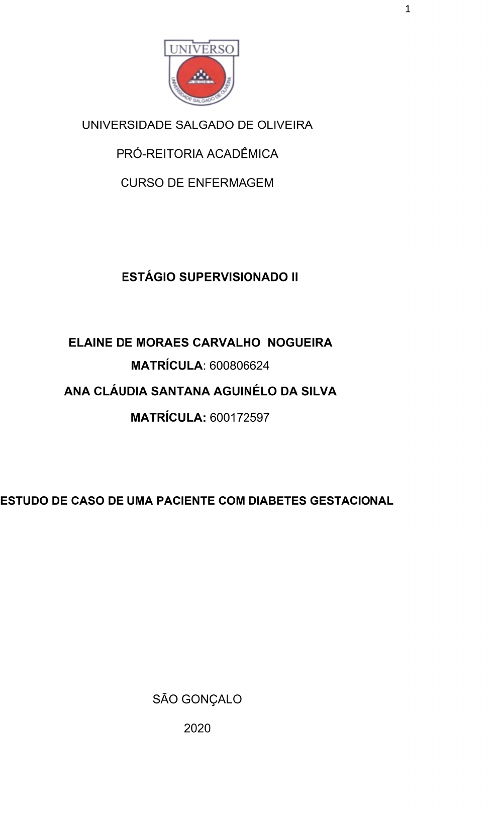 2 Estudo de caso elaborado como quesito parcial para aprovação na disciplina de Estágio Supervisionado II do curso de enfermagem da Universidade Salgado de Oliveira – UNIVERSO. Orientado por: William Coimbra SÃO GONÇALO 2020 3 SUMÁRIO 1. INTRODUÇÃO pg. 4 2. METODOLOGIA DA PESQUISA pg. 5 2.1 EVOLUÇÃO DE ENFERMAGEM pg. 5 3. PATOLOGIA pg. 6 Diabetes gestacional pg. 8 4. FARMACOLOGIA pg. 8 5. PRIORIZAÇÃO DA ENFERMAGEM pg. 12 5.1 Avaliação crítica pg. 14 6. PLANO DE ALTA pg. 16 7. CONCLUSÃO pg. 18 8. REFERENCIAS pg. 19 9. ANEXOS pg. 20 4 1. INTRODUÇÃO O estudo de caso em enfermagem consiste na avaliação dos sinais e sintomas do cliente, preparação de um plano de cuidados e estabelecimentos de meta para que se proporcione a melhora e evolução do paciente. Em campo de estágio são analisados pacientes em alas emergenciais, no posto de saúde e em centro cirúrgico. Por se tratar de uma doença comum: a diabetes gestacional, este caso embasou para melhor conhecimento e abordagem deste assunto, conhecido como doença crônica não transmissível. Possibilitando maior adesão ao conhecimento enquanto discente em enfermagem 5 2. METODOLOGIA DA PESQUISA Trata-se de uma pesquisa qualitativa e com abordagem descritiva, do tipo estudo de caso, elaborado por acadêmico de enfermagem do 8º período do curso de graduação da Escola de Enfermagem da Universidade Salgado de Oliveira na disciplina de Estágio Supervisionado I, disciplina esta, ministrada por Adriana Ribas. Para Triviños, o pesquisador qualitativo pauta seus estudos na interpretação do mundo real, preocupando-se com o caráter hermenêutico na tarefa de pesquisar sobre a experiência vivida dos seres humanos. A a tarefa de “dupla hermenêutica” justifica-se pelo fato de os investigadores lidarem com a interpretação de entidades que, por sua vez, interpretam o mundo que as rodeiam. Como consequência da capacidade humana para interagir, são adotadas, pelos pesquisadores, algumas técnicas para coleta de dados, dentre as quais, destacamos: a Observação participante, a Entrevista e o Método da história de vida. Um estudo de caso busca descrever e analisar uma situação ou um problema único, mas onde há diversas variáveis a serem investigadas. É com a investigação de todas as variáveis que será possível compilar os resultados obtidos para a formulação de conclusões sobre aquele tema estudado. Deste modo, a utilidade do estudo de caso é mais clara em situações onde se quer utilizar um exemplo real para explicar um fenômeno descrito na teoria ou quando se quer compreender as causas de algo, por exemplo. 2.1 Histórico de enfermagem Paciente F.S.S., gravida de 26 semanas, 36 anos, feminino, negra, casada, auxiliar de farmácia, católica, possui 2° grau completo. Chegou ao posto de saúde de sua região para consulta de pré-natal. A paciente é portadora de obesidade classe I (índice de massa corporal ou IMC 30 kg/m²), sem história prévia de DM, mas com história familiar positiva para a doença. Relatou como queixa principal sensação de cansaço e sede excessiva e vontade constante de urinar nos últimos 2 meses. Possui uma alimentação com 6 alta taxa de gordura e carboidratos. Era etilista, com consumo de 2 doses por semana, até o início da gestação, mas ainda consome quantidade de álcool quando está muito nervosa, relata como forma de acalmar. Nega tabagismo, consumo de drogas ilícitas e uso de medicações durante a gestação. Alega realizar esforço moderado no trabalho como auxiliar em farmácia e ficar a maior parte das 8 horas de trabalho em pé o que gera percepção de inchaço nas pernas. Nega risco de exposição nociva com agentes químicos ou similares. Tem média de 6 horas de sono por noite. A paciente relata ter sofrido 2 abortos nas tentativas anteriores de engravidar, mas sem histórico de parto. Nega comorbidades, HAS, cardiopatias, doenças da infância. Relata não saber se já realizou testes glicêmicos. Não possui histórico de alergias, doenças neurológicas, intervenções cirúrgicas, tatuagens e transfusões sanguíneas. Sinais Vitais: PA: 120 × 70 mmHg; Tax: 36,5°C; FR = 16 ipm; FC = 85 bpm; FC (Fetal): 141 bpm; medida uterina 34 cm; dinâmica uterina com a ausência de contrações. 2.2 EVOLUÇÃO DE ENFERMAGEM A paciente apresenta um bom estado geral, nutrida, hidratada, alerta, lúcida e orientada no tempo e espaço, sem alteração na fala e linguagem, e na marcha, boa postura, bom desenvolvimento físico, fácies atípicas, atitude indiferente, movimentos involuntários ausentes, biotipo normolíneo, humor eutímico. Normocrômica, anictérica, acianótica, afebril (T= 36,5°), eupneica (FR = 16 ipm), normocárdica (FC = 85 bpm), normotensa (PA = 120 × 70 mmHG); FC (Fetal): 141 bpm; medida uterina 34 cm; dinâmica uterina com a ausência de contrações . Colo uterino apresentava-se longa; apresentação fetal cefálica, bolsa integra e IMC de 30kg/m². 7 A paciente recebeu recomendação para realizar os exames complementares que foram glicemia em jejum e o teste de tolerância oral 75g (TTO). Com o recebimento dos exames, foi visto os seguintes resultados: Glicemia em Jejum = 120mg/dL; TTO jejum = 93 mg/dL, 1ªhora = 180 mg/dL e 2ª hora = 155 mg/dL. Com isso, foi feito o diagnóstico de Diabetes Mellitus Gestacional (DMG). 8 3. PATOLOGIA Diabetes gestacional A diabetes gestacional é caracterizada pelo aumento dos níveis de glicose no sangue durante a gravidez. É uma doença que coloca em risco a saúde do bebê e da futura mãe. Segundo o Ministério da Saúde, nas últimas duas décadas, houve um aumento progressivo do número de mulheres com diagnóstico de diabetes durante a gestação. Obesidade ou ganho de peso excessivo, hipertensão, idade materna mais avançada e história familiar de diabetes em parentes de primeiro grau são alguns dos fatores de risco. Durante a gestação, ocorrem importantes alterações no metabol