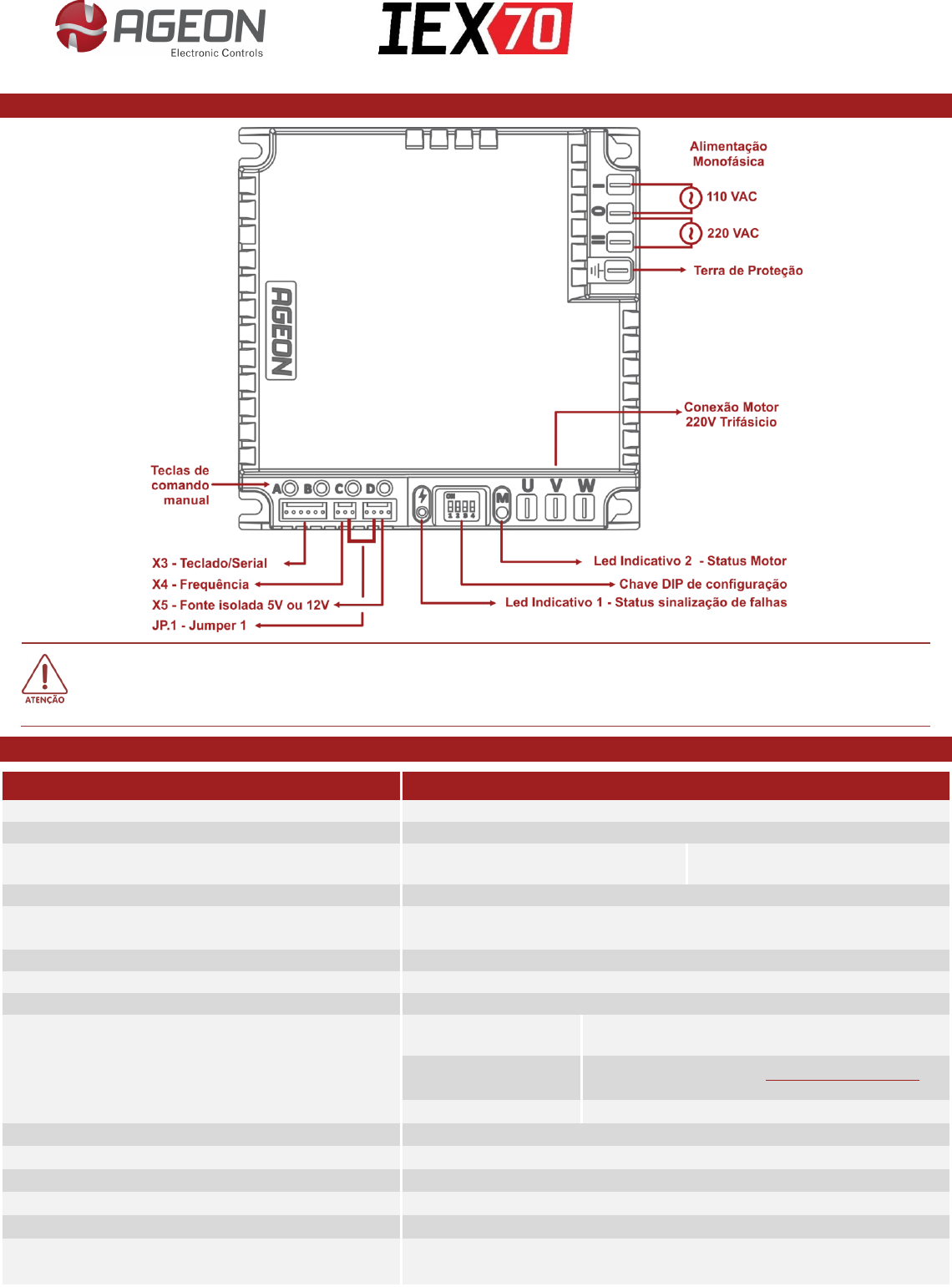 Inversor de frequência Manual de instruções - Todo motor deve ser conectado diretamente no inversor e obrigatoriamente estar configurado para operar com tensão de 220 V trifásica . - O aterramento é indispensável e deve ser realizado pelo pino terra. - Antes de fazer as conexões, certifique que a alimentação esteja desligada. Especificações técnicas Descrição Parâmetro Motor recomendando Motor Trifásico 2CV Corrente máxima de saída ² 8.5 A Corrente entrada nominal 110 V 28 A 220 V 14 A Tensão de entrada 110 V (±10%) ou 220 V (±10%) Frequência de entrada 60 Hz ( 2%) Frequência de chaveamento 10 kHz Tipo de controle Space Vector Modulation Temperatura de operação (0 a + 40) °C Umidade relativa 5 % a 90 % (sem condensação) Entradas digitais1 Modo teclado 4 entradas digitais opto isoladas Consumo individual: 10 mA / +5 V Modo frequência Frequência de saída = Frequência de entrada 2 Modo serial 1 entrada serial isolada para uso em paineis rs 600 Temperatura de proteção hardware 110 °C Grau de proteção IP20 Rampa de aceleração 15 segundos Rampa de desaceleração 15 segundos Frequência de saída mínima 5 Hz Frequência de saída máxima 150 Hz Tempo de auto reset 30 segundos 1 Fonte interna isolada +5 V / 100 mA ou +12 V / 100 mA. 2 Para correntes acima de 8,5 A por mais de 10 segundos, o LED2 sinalizará a irregularidade piscando intermitente. Aplicação Produto destinado ao controle de velocidade de motores trifásicos de esteiras ergométricas. Métodos de funcionamento O inversor IEX70 pode ser acionado através de três métodos: Modo Teclado, Modo Frequência e Modo Serial. Para configuração do funcionamento do inversor através de um dos métodos, basta alternar a posição da chave DIP de configuração, conforme imagem abaixo. É necessário reiniciar o inversor para que a alteração tenha efeito. - O modo de funcionamento é definido quando o inversor é ligado. Caso seja necessário modificar o modo de funcionamento, deve-se desligar o inversor esperando no mínimo 10 minutos para a completa descarga dos capacitores para configurar o modo desejado nas chaves de configuração. - Nunca altere a posição da chave de configuração com inversor em funcionamento. - O ventilador do inversor só liga quando o motor estiver em funcionamento ou quando a temperatura estiver elevada. Seleção da frequência máxima (modo teclado) A frequência máxima de saída do inversor IEX70 pode ser configurada em: 85 Hz, 100 Hz, 120 Hz ou 150 Hz. Caso seja necessário, altere a posição das chaves 3 e 4, conforme tabela abaixo: Seleção da redução de velocidade (modo serial) O inversor IEX70 pode ser configurado para operar em modo serial com comandos do painel RS 600. Dependendo da relação entre as polias do conjunto mecânico da esteira, pode ser necessário o uso de um fator de divisão para corrigir a frequência de saída do inversor. Neste caso, para adequar a velocidade real da esteira à velocidade mostrada no painel, configure as chaves de programação conforme indicado na tabela abaixo. A frequência de saída será dividida pelo valor indicado na coluna Fator de divisão. Posição 1 Posição 2 Posição 3 Posição 4 Frequência Máxima (Hz) OFF OFF OFF OFF 85 OFF OFF ON OFF 100 OFF OFF OFF ON 120 OFF OFF ON ON 150 Posição 1 Posição 2 Posição 3 Posição 4 Fator de divisão ON OFF OFF OFF 1 ON OFF OFF ON 1.6 ON OFF ON OFF 1.44 ON OFF ON ON 1.3 ON ON OFF OFF 1.54 ON ON OFF ON 1.21 ON ON ON OFF 2.0 Teclas de comando manual O inversor IEX70 é dotado de quatro chaves (A, B, C e D) para acionamento manual do inversor, independente de um painel externo. Essa função pode ser útil para verificar o funcionamento do inversor sem conectá-lo à um painel. Para isso, ajuste a chave de configuração em Modo Teclado e pressione as teclas para acionamento manual, conforme imagem abaixo: - Deve-se manter a tecla “A” (Chave de segurança) pressionada para acionamento manual do inversor. - O Jumper 1 entre os terminais X4 e X5 deve permanecer conectado. Advertências e recomendações - Somente pessoas com qualificação técnica adequada devem planejar ou executar a instalação, operação e manutenção deste aparelho O aterramento do inversor é indispensável e deve ser realizado pelo conector terra de proteção. As normas técnicas vigentes devem ser observadas. - Certifique-se de que a rede de alimentação esteja desconectada antes de iniciar as ligações no inversor. - Para conexão na placa, utilize terminal isolado FastOn Fêmea 6.3mm. - Caso o sentido de rotação do motor esteja invertido, deve-se trocar entre si a ligação de dois fios quaisquer da saída do motor. Para tanto é necessário desenergizar o inversor e esperar no mínimo 10 minutos para completa descarga dos capacitores. - Condutores de sinal do painel devem ser separados fisicamente dos cabos de alimentação do inversor e dos cabos do motor. - Deixar no mínimo 10 centímetros de espaço livre ao redor do aparelho. Mantê-lo afastado de equipamentos que geram calor. - Todo motor deve ser conectado diretamente no inversor e obrigatoriamente estar configurado para operar com tensão 220V trifásica - Mesmo após a desconexão da alimentação aguarde pelo menos 10 minutos para a descarga completa dos capacitores antes de encostar nas conexões. - Nunca submeta o aparelho a uma temperatura fora da faixa de (0 a 40) °C, pois isto pode causar dano irreversível ao produto. - Este equipamento não pode ser utilizado como mecanismo de parada de emergência - Verifique se todas as conexões de aterramento, potência e controle estão corretas antes de energizar o inversor. - Certifique-se de que a tensão da rede está dentro da faixa nominal permitida: 110 V (± 10 %) ou 220 V (± 10 %). Led indicativo 1 O led indicativo 1 “ ” é utilizado para sinalizar eventos, conforme tabela abaixo. Piscadas3 Descrição Resolução Aceso Energizado e pronto para funcion