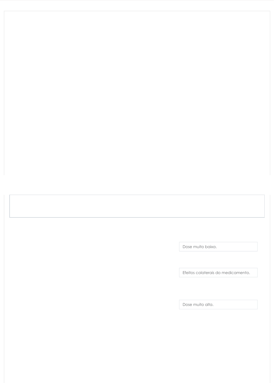 Iniciado em quarta, 11 dez 2024, 13:27 Estado Finalizada Concluída em quarta, 11 dez 2024, 13:36 Tempo empregado 9 minutos 18 segundos Avaliar 10,00 de um máximo de 10,00(100%) Questão 1 Correto Atingiu 1,00 de 1,00 Associe as colunas sobre problemas com medicamentos: Pode ocorrer quando é prescrita uma dose muito baixa ou quando o paciente resolve tomar uma quantidade menor do remédio prescrito. Quando isso ocorre, a medicação pode não trazer o benefício esperado. São reações desagradáveis ou prejudiciais causadas pela medicação. Podem ocorrer quando a pessoa é alérgica a determinado remédio; quando acontece uma interação com outro remédio, fazendo com que o efeito seja diferente do esperado, quando não é administrada a dose certa ou quando a dosagem é aumentada ou diminuída muito rapidamente. Quando é prescrita ou o paciente simplesmente ingere uma quantidade de medicação maior do que o necessário. Esse problema é comum entre os idosos, uma vez que com o envelhecimento o organismo pode alterar a forma de metabolizar os medicamentos. Uma dose normal para um adulto jovem pode significar uma dosagem alta demais para um idoso. Dose muito baixa. Efeitos colaterais do medicamento. Dose muito alta. Questão 2 Correto Atingiu 1,00 de 1,00 Questão 3 Correto Atingiu 1,00 de 1,00 Quantas vezes deve-se lavar o cabelo da pessoa idosa durante a semana? a. Pelo menos uma vez ao dia. b. Duas vezes por semana. c. No mínimo, três vezes por semana. d. Todos os dias. A sonda vesical de demora, ou sonda de Folley, é utilizada quando a pessoa não é capaz de urinar espontaneamente ou de controlar a saída da urina. Escolha uma opção: Verdadeiro Falso Questão 4 Correto Atingiu 1,00 de 1,00 Questão 5 Correto Atingiu 1,00 de 1,00 Marque a alternativa incorreta sobre os cuidados com a bolsa de ileostomia, colostomia e urostomia: a. Usar a bolsa adequada para coleta de fezes ou urina seguindo as orientações do profissional de saúde. b. A bolsa deve ser esvaziada sempre que com o espaço completamente ocupado com fezes ou urina. c. A bolsa deve ser esvaziada sempre que estiver com 1/3 do espaço ocupado com fezes ou urina. d. O recorte da bolsa deve ser sempre de acordo com o tamanho e formato da ostomia. e. As bolsas devem ser guardadas em locais limpos, secos e protegidas do sol para evitar umidade e ressecamento que comprometam a capacidade adesiva da bolsa. O uripen é uma sonda externa feita de borracha fina, também conhecida como sonda de camisinha, pois é colocada no pênis como uma camisinha. Questão 6 Correto Atingiu 1,00 de 1,00 Questão 7 Correto Atingiu 1,00 de 1,00 A noite, os perigos se multiplicam, por isso, deve-se pensar em substituir itens que possa ser motivos para o paciente tropeçar, como fios de telefone. Escolha uma opção: Verdadeiro Falso Marque a alternativa incorreta sobre os cuidados necessários ao paciente que utiliza uripen: a. Manter os pêlos pubianos aparados, pois facilita a utilização do uripen. b. A fixação não deve ficar muito apertada. c. Evite fixar o uripen com esparadrapo comum, pois pode causar alergias e lesões no pênis. d. Retire o uripen uma vez ao dia para lavar e secar bem o pênis. e. É mais difícil colocar e manter o uripen com o pênis ereto, sendo aconselhado a não estimulação do órgão. Questão 8 Correto Atingiu 1,00 de 1,00 Questão 9 Correto Atingiu 1,00 de 1,00 A bolsa da ostomia é impermeável, não sendo necessário retirá-la antes do banho. Escolha uma opção: Verdadeiro Falso Algumas doenças e alguns medicamentos podem provocar sangramento e inflamação nas gengivas. Escolha uma opção: Verdadeiro Falso Baixar o aplicativo móvel. Questão 10 Correto Atingiu 1,00 de 1,00 As assaduras são lesões na pele das dobras do corpo e das nádegas, provocadas pela umidade e calor ou pelo contato com fezes e urina. A pele se torna avermelhada e se rompe como um esfolado. ◄ 3.10 Prevenção de quedas e outros tipos acidentes Seguir para... 3.12 Alimentação saudável ►